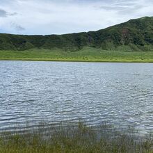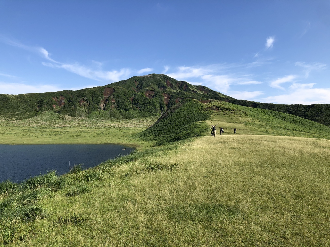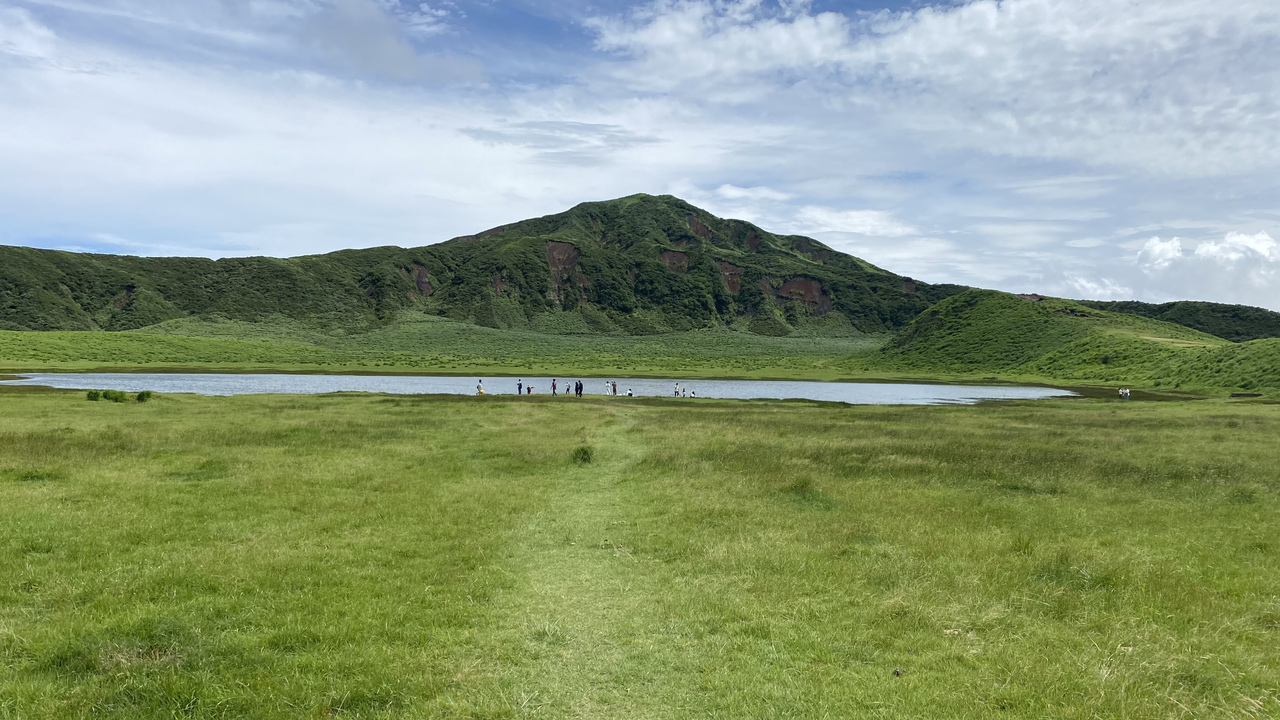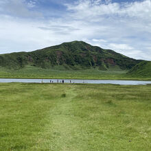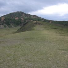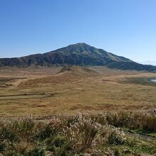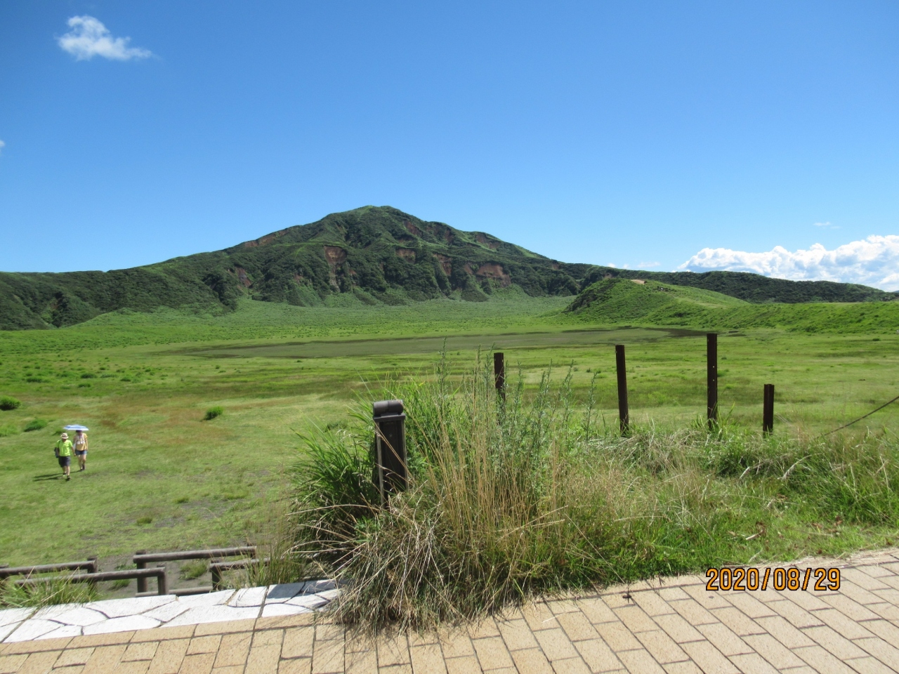 烏帽子岳の北麓に広がる直径約1kmの草原。二重式火口の跡で、中央には大きな池があり、放牧馬がのんびりと草を食んでいる牧歌的風景は、阿蘇を代表する景色となっている。目の前には噴煙をあげる中岳がそびえる。