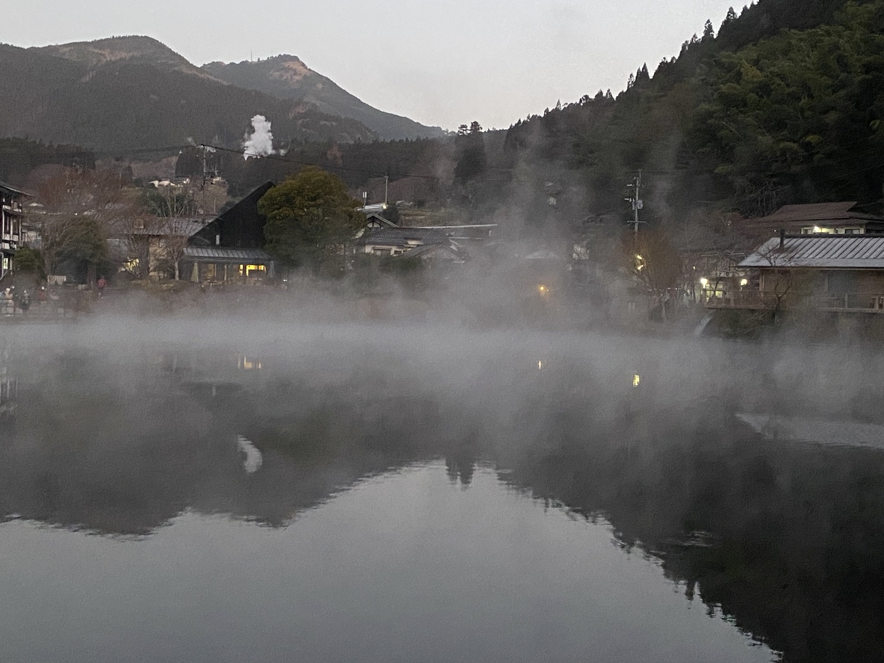 宿泊先のいよとみから、大分川沿いを歩いて20分くらいでした。冬の日の出頃になると、湖の水蒸気が冷たい冬の空気に冷やされて朝...  続きを読む靄になり、どこか幻想的な景色になります。朝7時頃でしたが、観光客も7-8人しかおらず、とても静かでよかったです。  閉じる