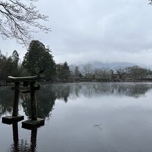 金鱗湖の中にある、鳥居も良い感じです。