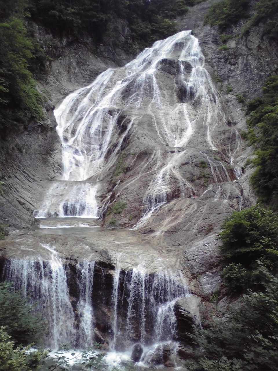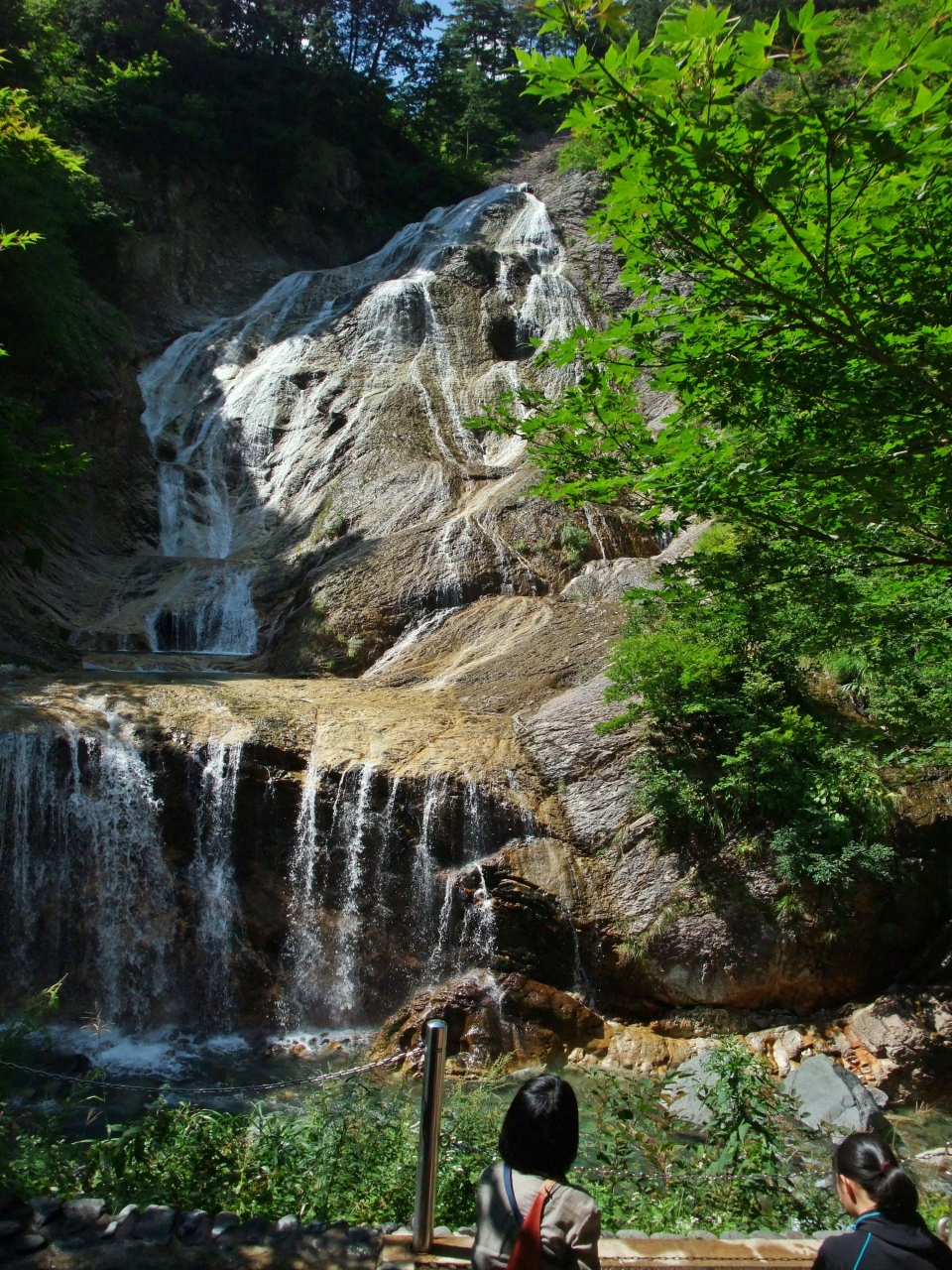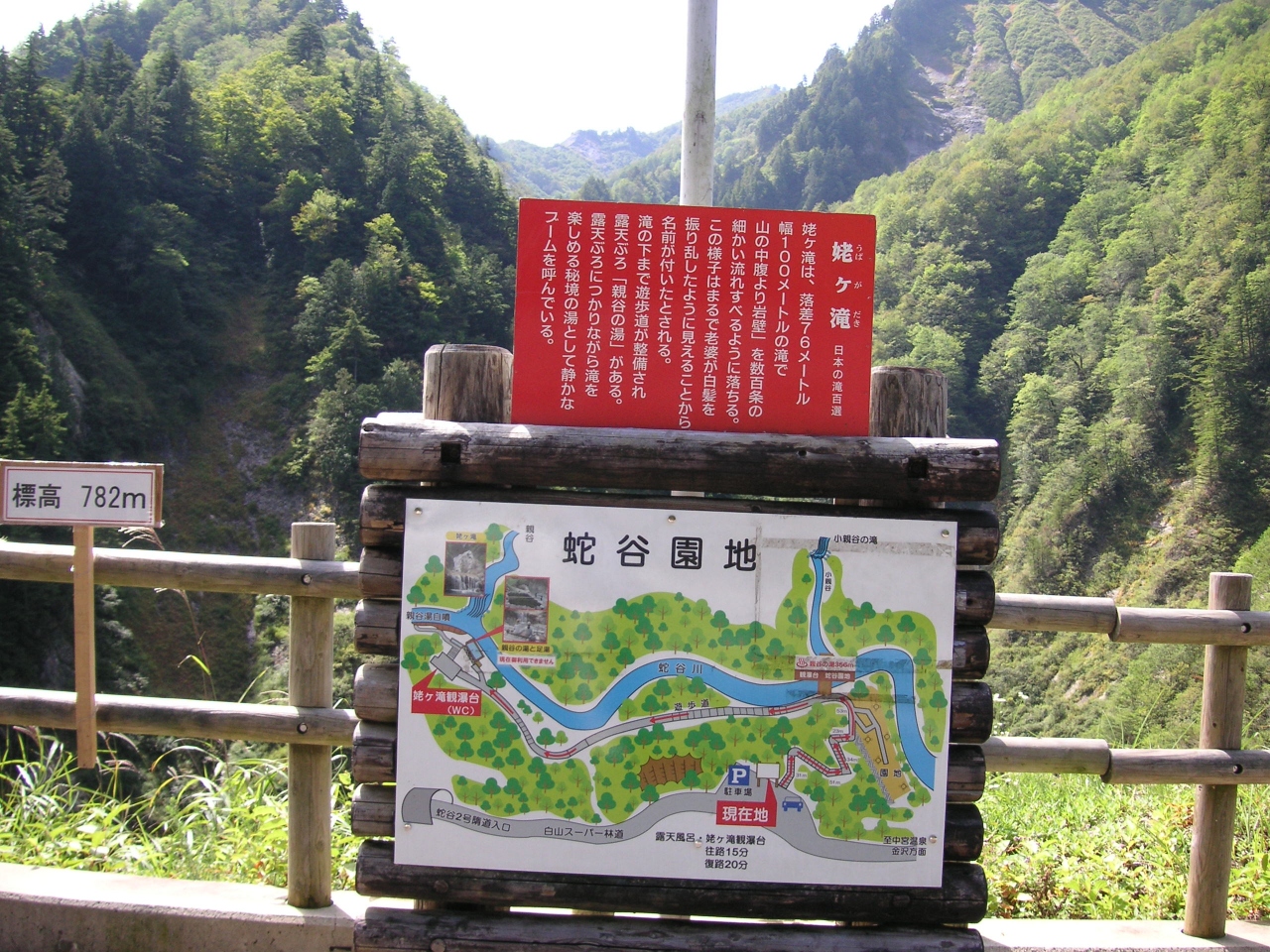 姥ヶ滝は落差76mの滝で山の中腹より岩盤を数百条の細かい流れ滑るように落ちます。この様子はまるで老婆が白髪を振り乱したよう... 続きを読むに見える事から名前が付いたらしいです。日本の滝100選のひとつです。白山スーパー林道の中間地点にある蛇谷園地駐車場(標高770m)に車を止めます。この日は天気が良く陽射しが強くて結構熱かったです。 入口はいきなり急な階段で九十九折になっていて下っていきます。下の方に見える川の所まで100メートル程下ります。しばらく川沿いを歩きまた階段を登り10分程でたどり着きました。歩いている途中の景色もすごいです。滝のスケールはすごく大きく写真に入りきりませんでした。滝は拡散して流れる感じで、直滑降で落ちる滝より趣がありマイナスイオンで癒されました。眺める角度により違った感じでおもしろかったです。近くによってみると水しぶきが飛んできて気持ちがいいです。しかし帰りには地獄の階段があるので結構疲れます。 閉じる