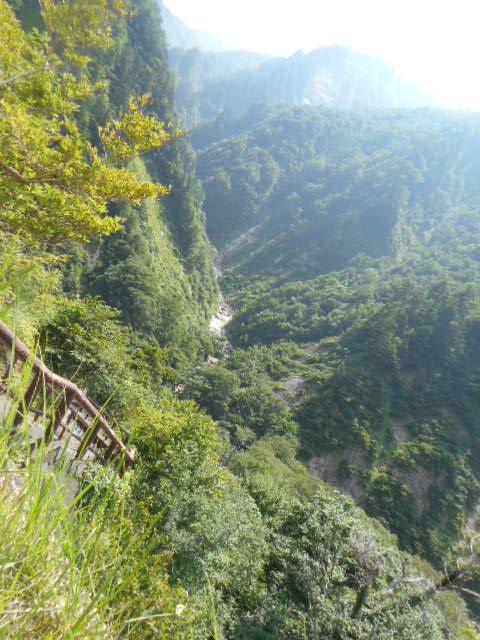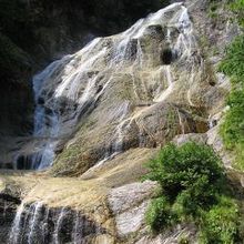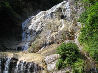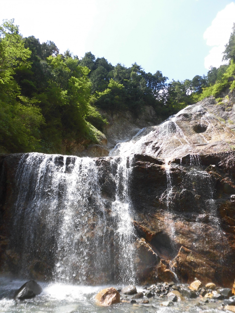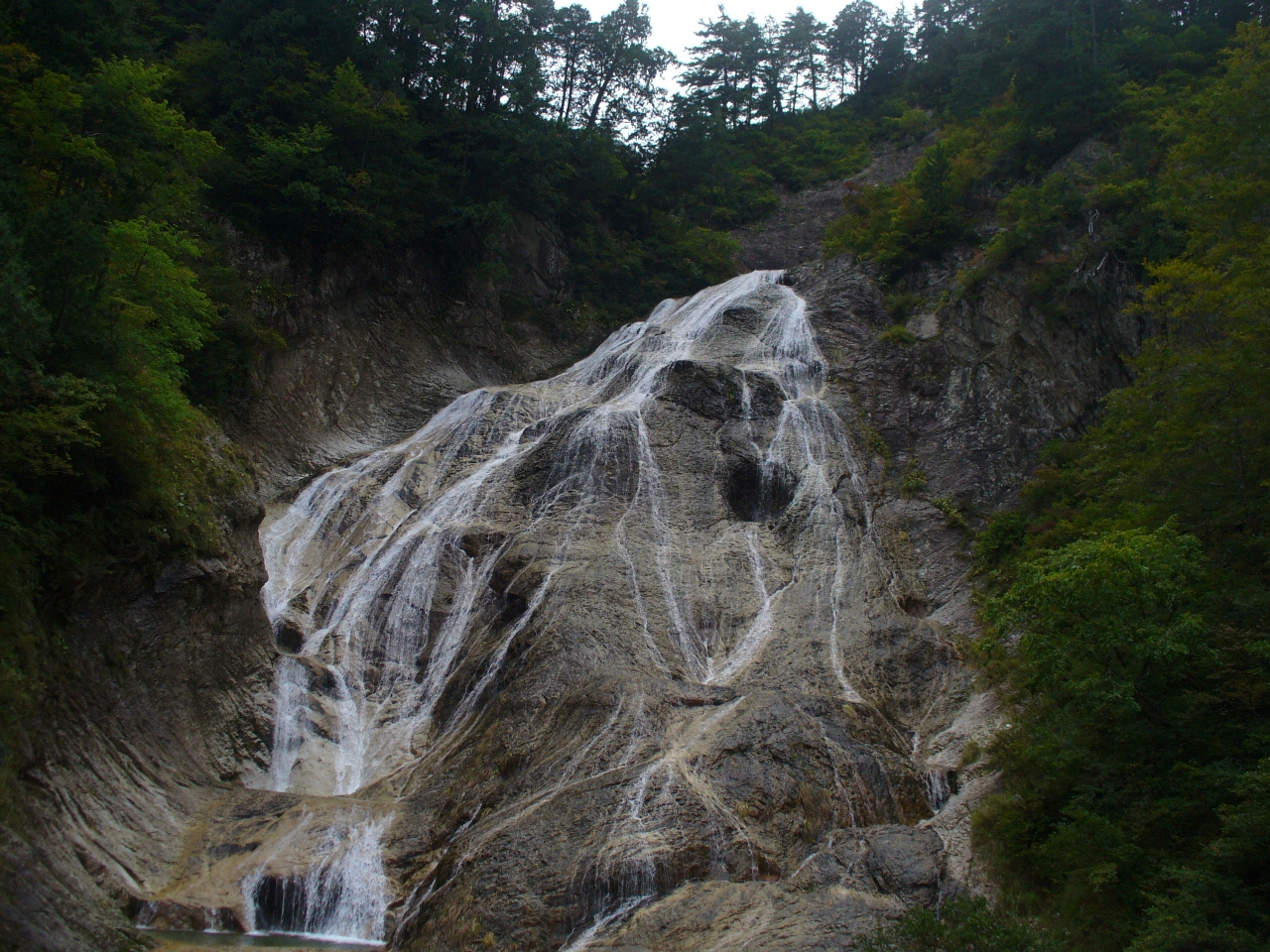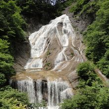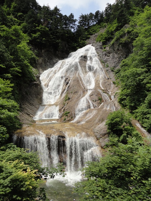 姥ヶ滝は落差76mの滝で山の中腹より岩盤を数百条の細かい流れ滑るように落ちます。この様子はまるで老婆が白髪を振り乱したよう... 続きを読むに見える事から名前が付いたらしいです。日本の滝100選のひとつです。白山スーパー林道の中間地点にある蛇谷園地駐車場(標高770m)に車を止めます。この日は天気が良く陽射しが強くて結構熱かったです。 入口はいきなり急な階段で九十九折になっていて下っていきます。下の方に見える川の所まで100メートル程下ります。しばらく川沿いを歩きまた階段を登り10分程でたどり着きました。歩いている途中の景色もすごいです。滝のスケールはすごく大きく写真に入りきりませんでした。滝は拡散して流れる感じで、直滑降で落ちる滝より趣がありマイナスイオンで癒されました。眺める角度により違った感じでおもしろかったです。近くによってみると水しぶきが飛んできて気持ちがいいです。しかし帰りには地獄の階段があるので結構疲れます。 閉じる