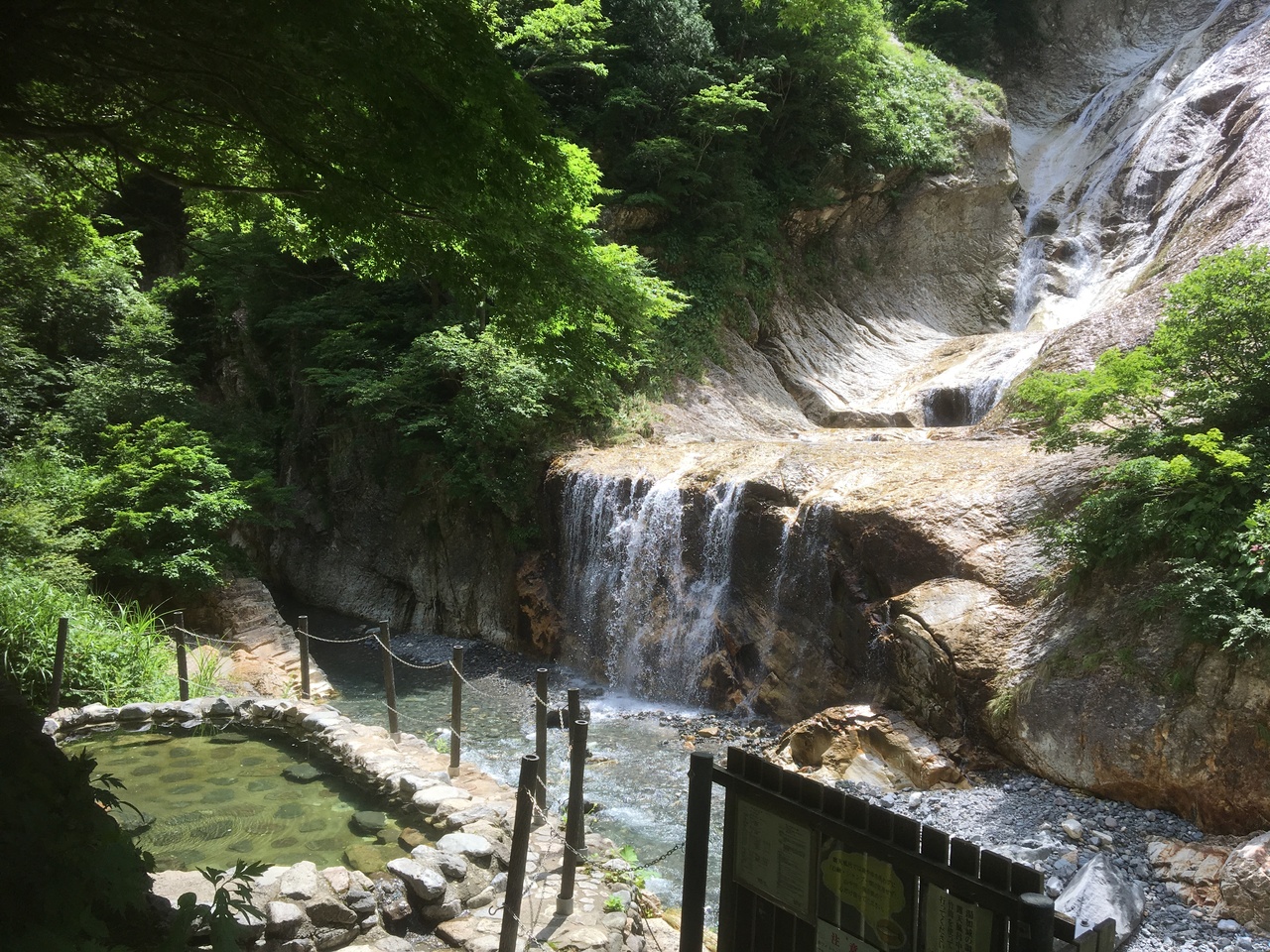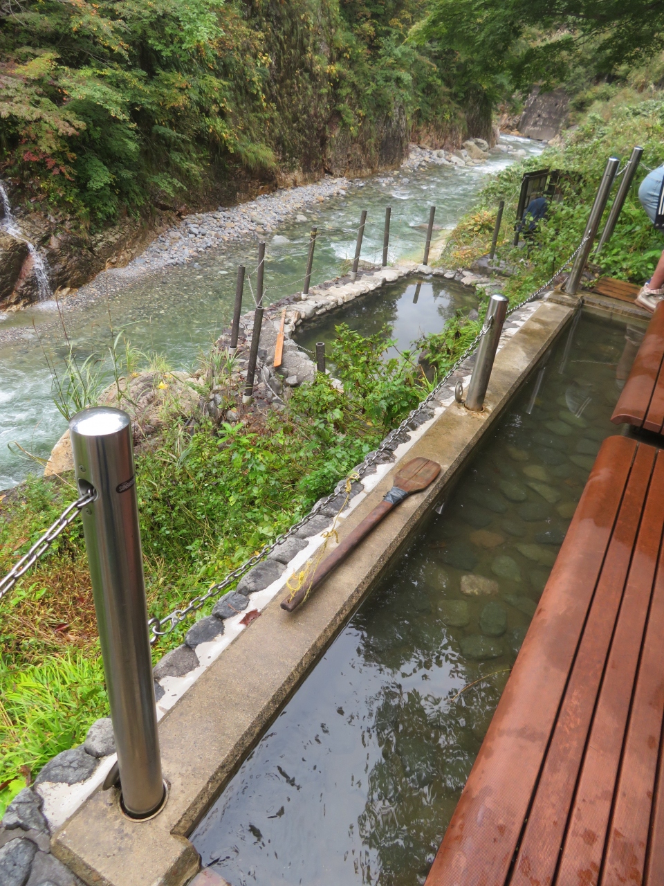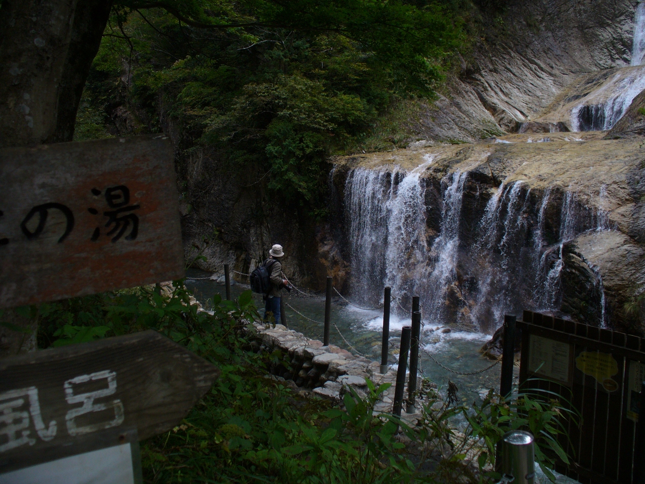 そして、滝の真前にあるのが、昨年復活した親谷の湯です。「日本の滝百選」の素晴らしい滝を間近に見ながら温泉に浸かれるとは、何という贅沢! が、水着の用意がなかったため、そのすぐ上にある足湯へ。しばし至福の時を過ごしました。