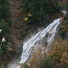 姥ヶ滝のある目の前に展望台があり、そこから滝の姿を眺める。
