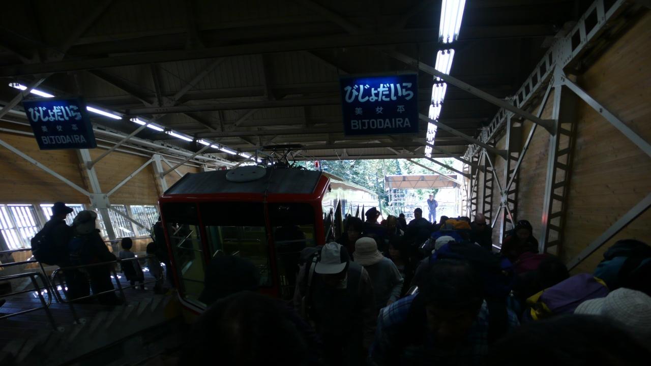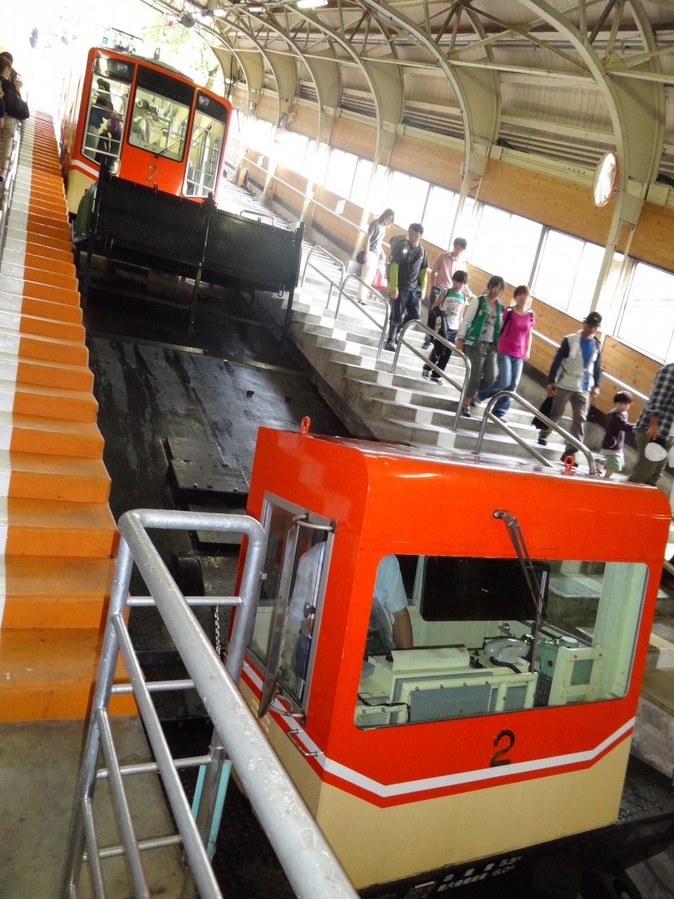 このケーブルカー、7分間ですが、冷房はなく、窓もほんの少しで大変蒸し暑く、私が乗ったときは混み混みで不快指数マックスの乗り物でした。まだぐずりがちな乳幼児には不向きな乗り物かもしれません。ものすごい傾斜をのぼり、景色もダイナミックなので、ある程度がまんが教えられる年齢からのお子さんなら7分ぐらいあっというまだとは思いますが、、