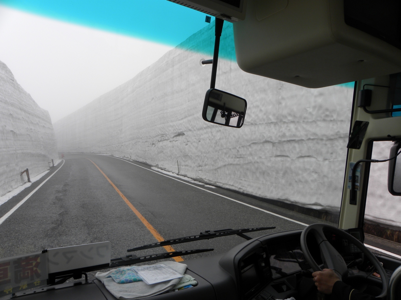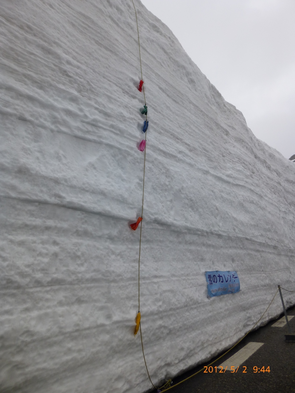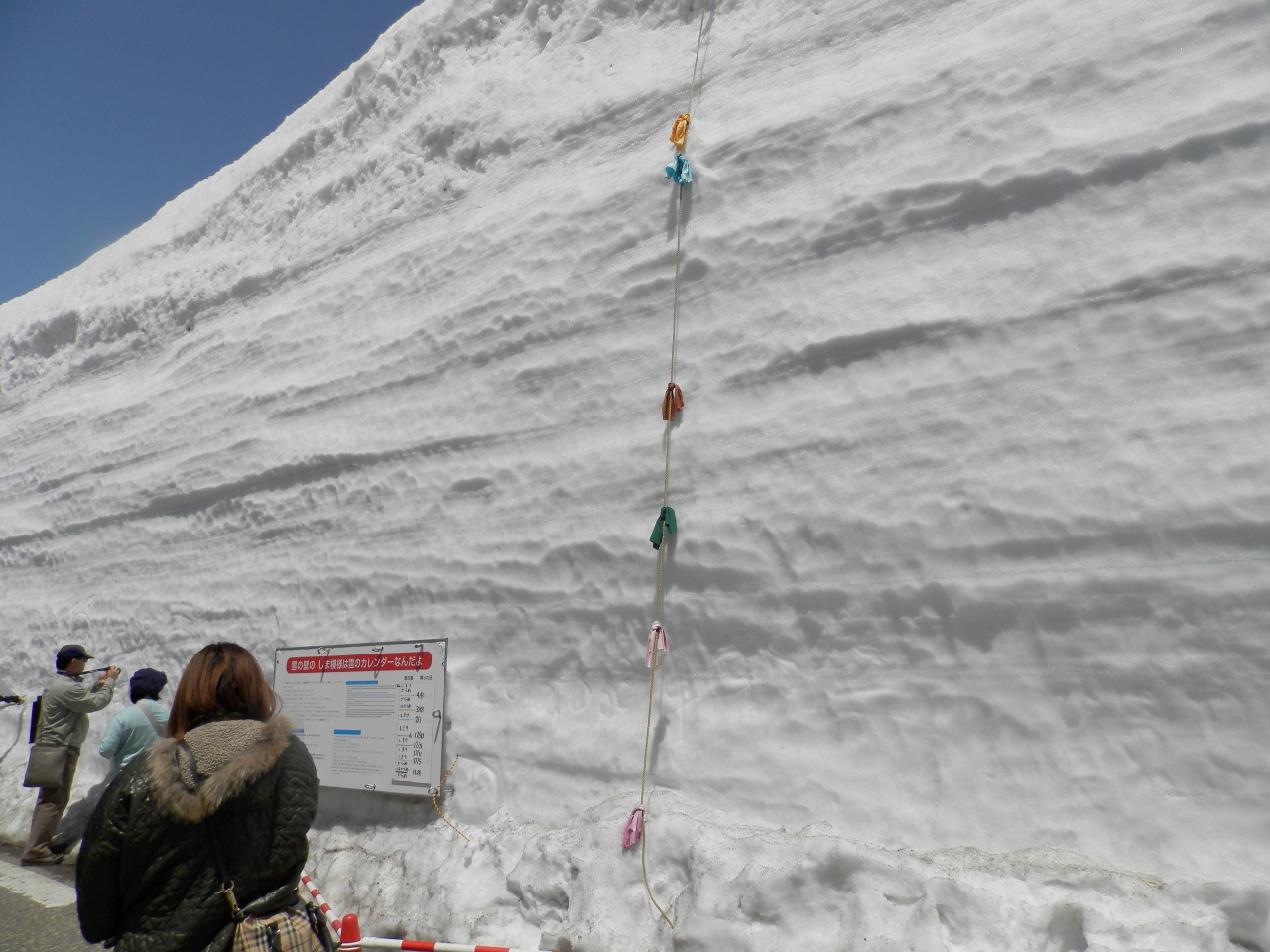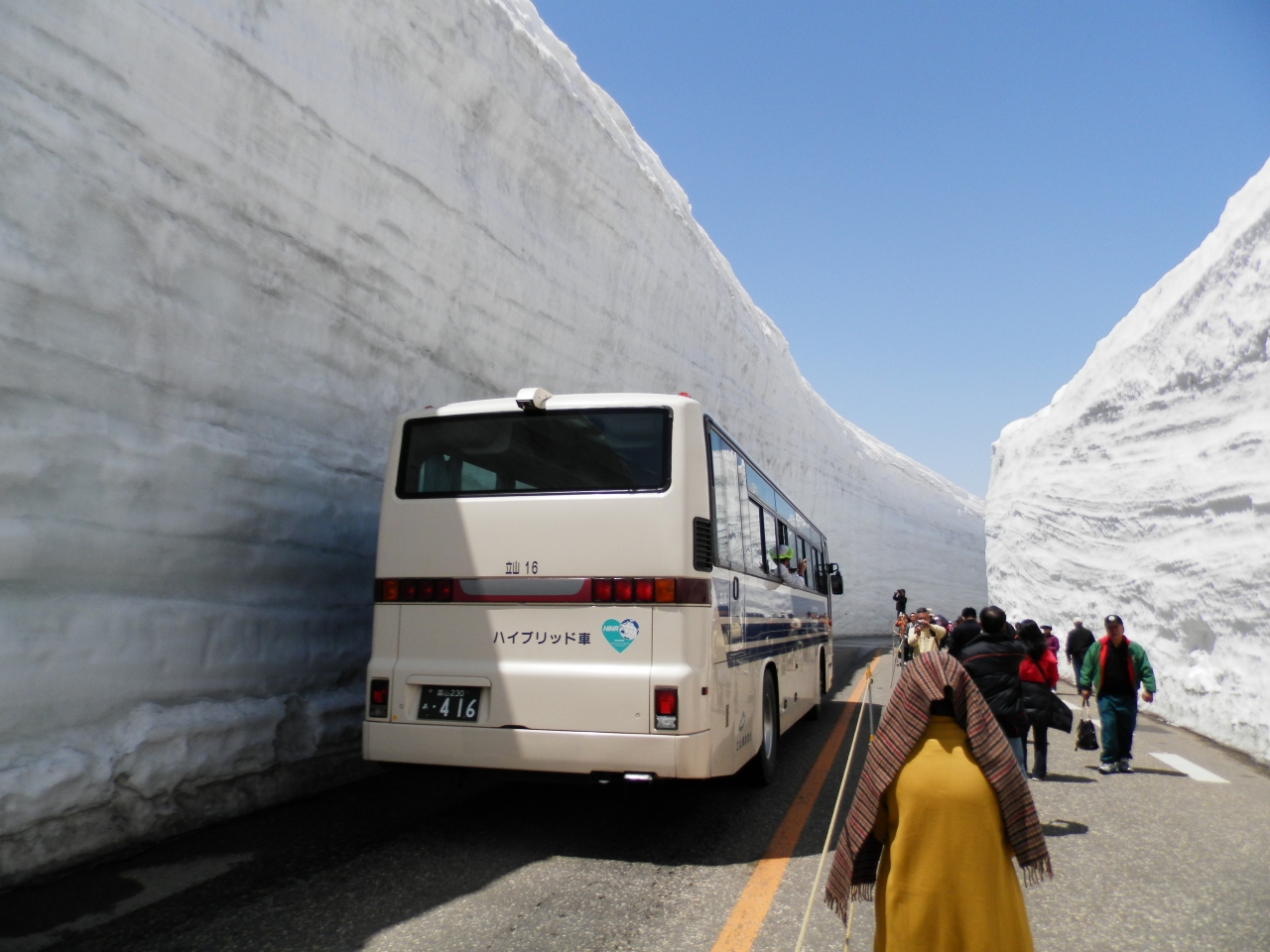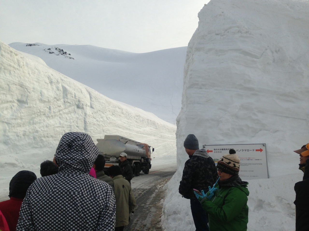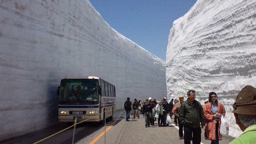 そびえ立つ雪壁の間をバスが走り抜ける光景は壮観だ。2013年の開通は4月16日だそうで、つい先日だ。この雪の大谷はどうして造るのだろうか。前年の秋に高原バス道路の両側に立てておいた木製のポールをGPSで探し当て、雪で埋もれた道路を30tのブルドーザで雪を削って少しずつ掘り下げて行くらしい。