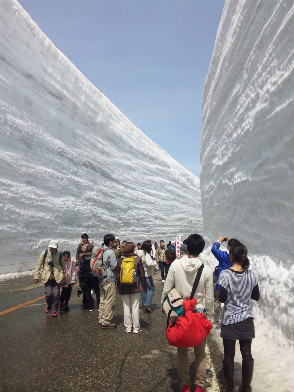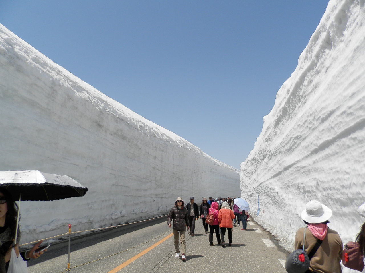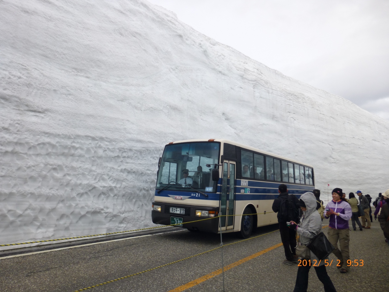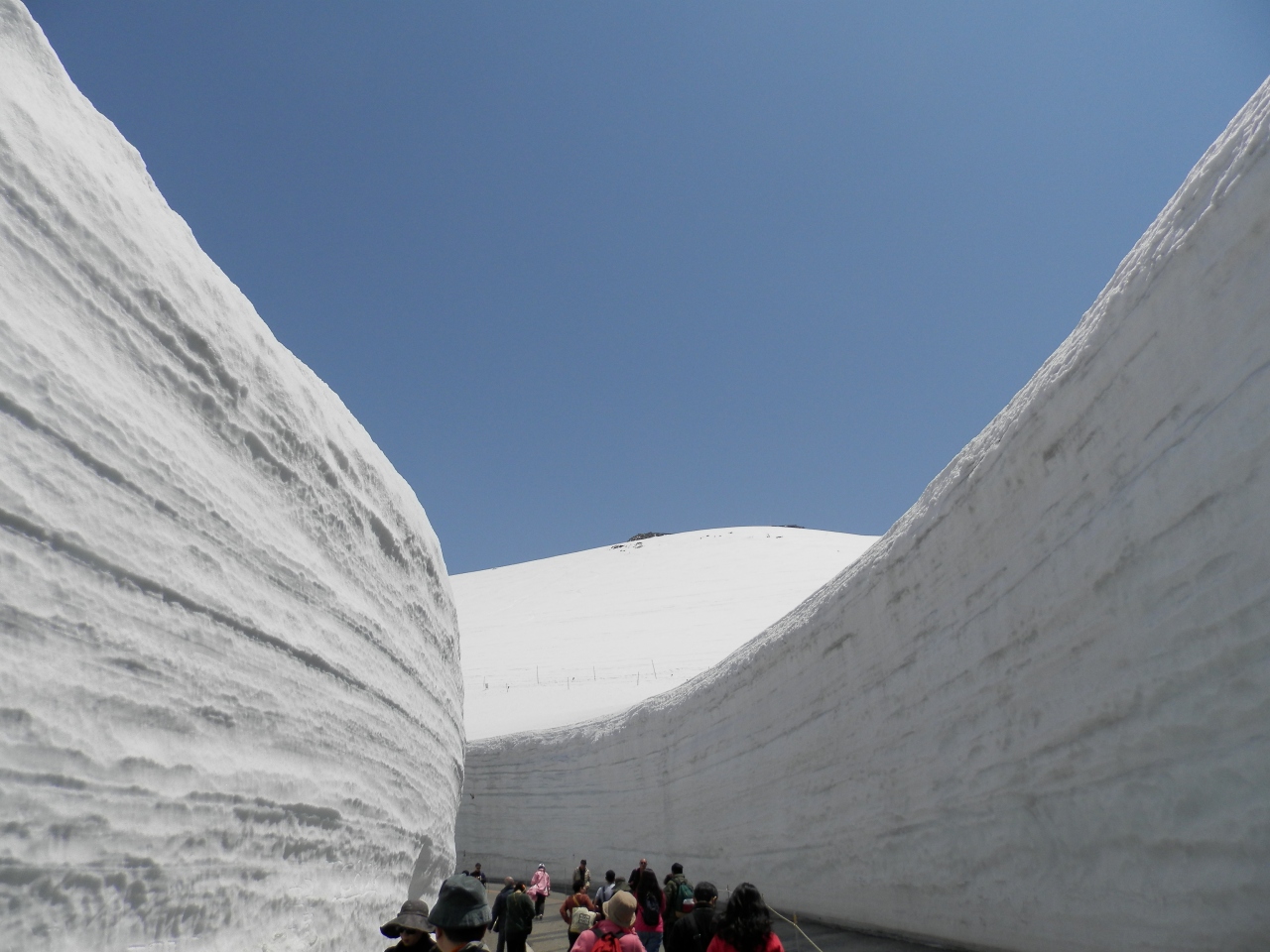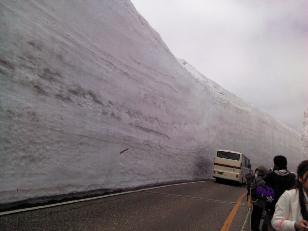 そびえ立つ雪壁の間をバスが走り抜ける光景は壮観だ。2013年の開通は4月16日だそうで、つい先日だ。この雪の大谷はどうして造るのだろうか。前年の秋に高原バス道路の両側に立てておいた木製のポールをGPSで探し当て、雪で埋もれた道路を30tのブルドーザで雪を削って少しずつ掘り下げて行くらしい。