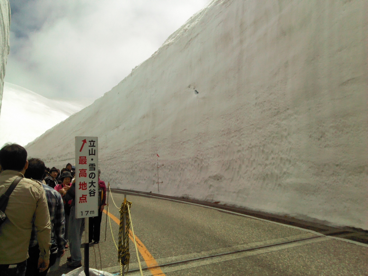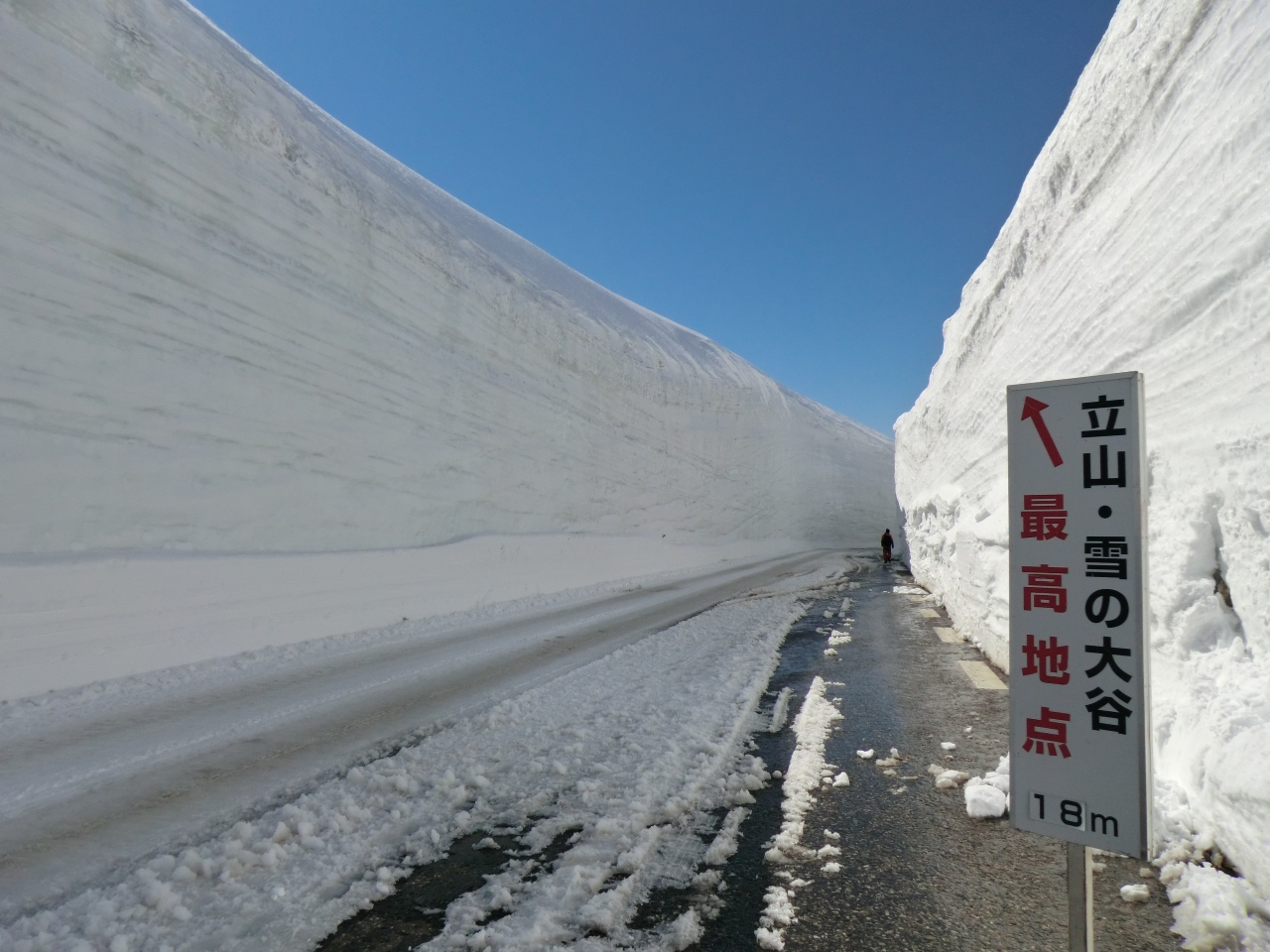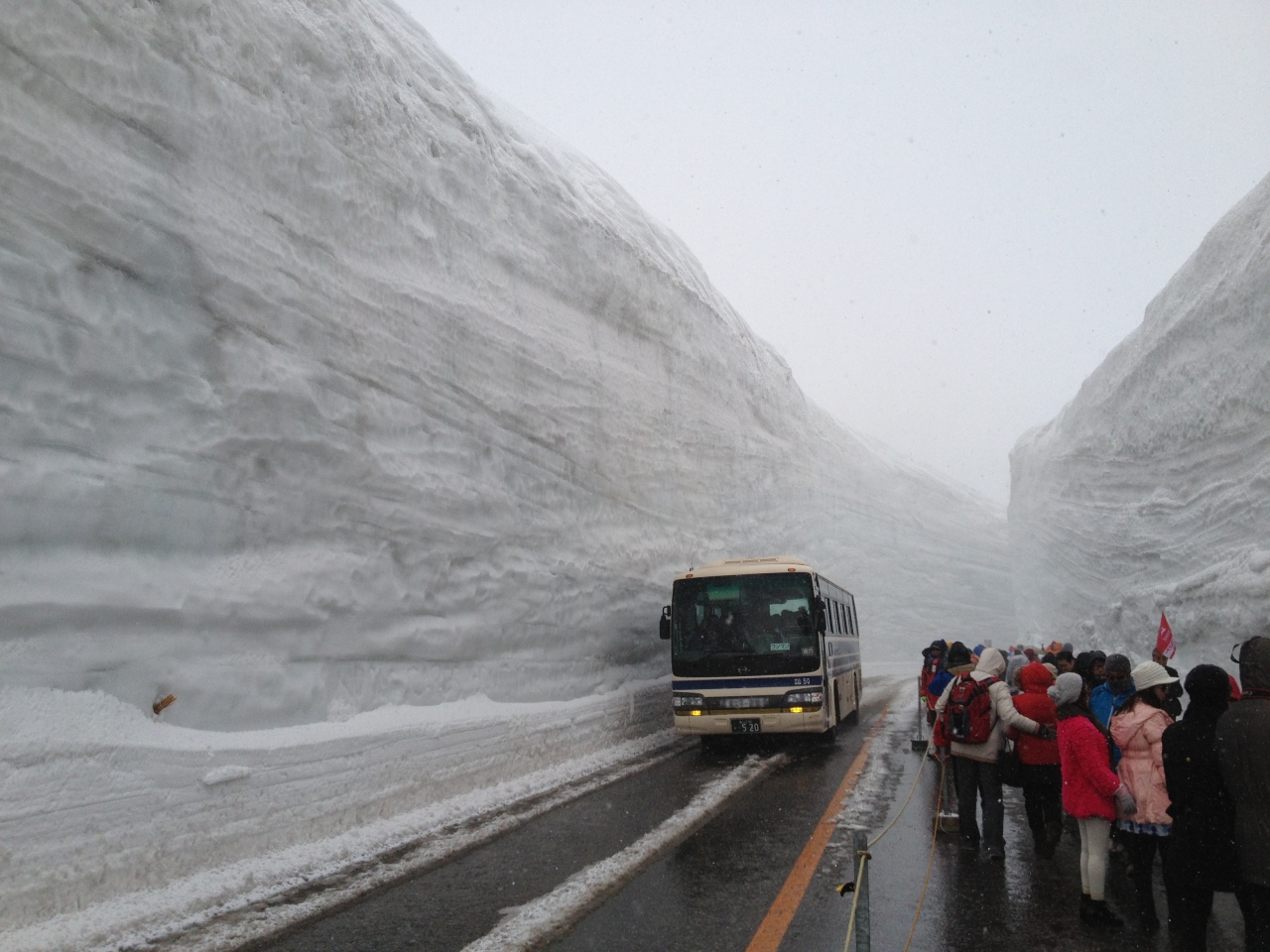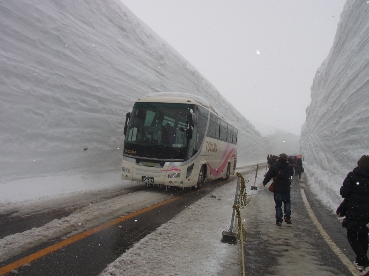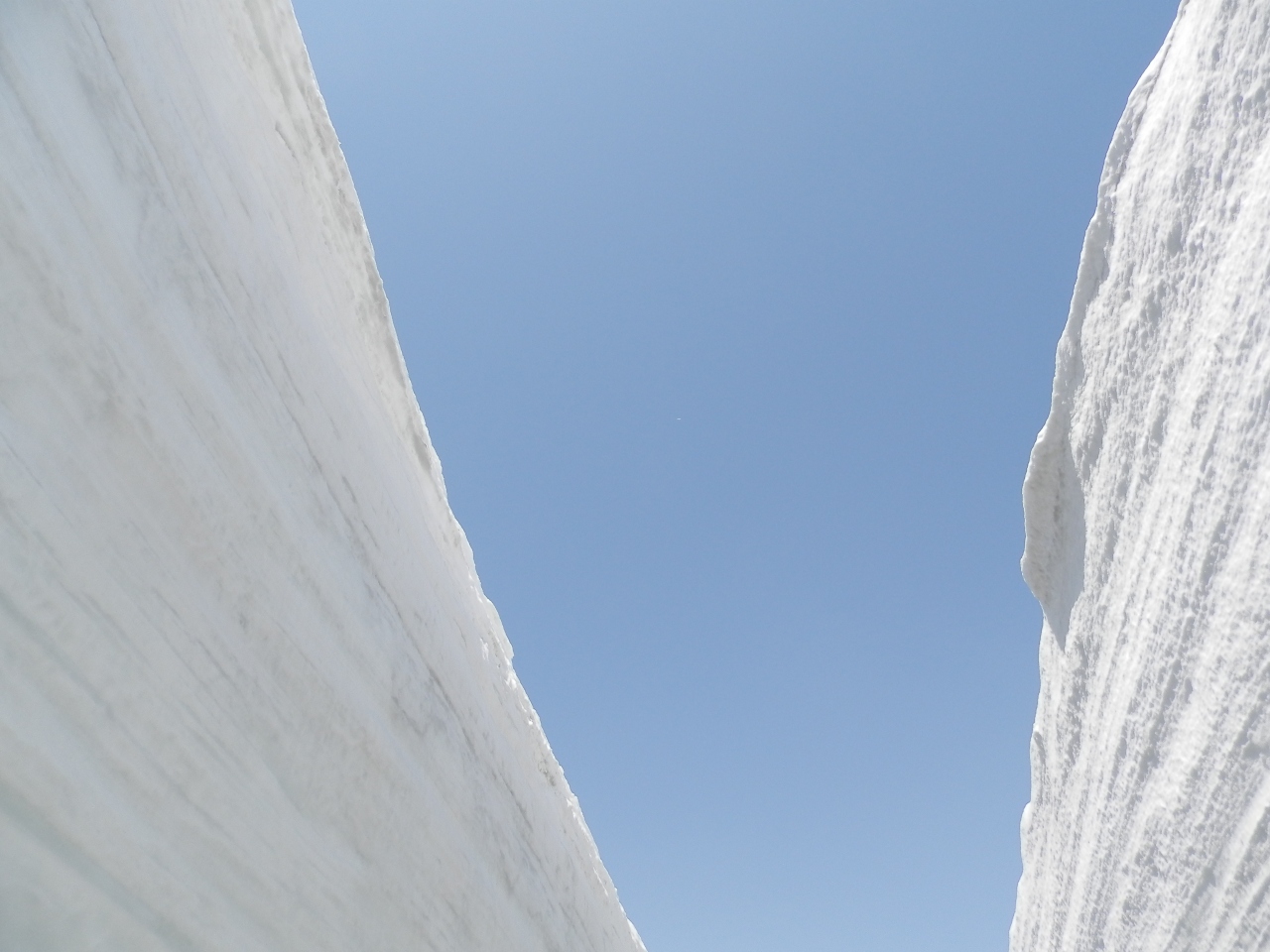 そびえ立つ雪壁の間をバスが走り抜ける光景は壮観だ。2013年の開通は4月16日だそうで、つい先日だ。この雪の大谷はどうして造るのだろうか。前年の秋に高原バス道路の両側に立てておいた木製のポールをGPSで探し当て、雪で埋もれた道路を30tのブルドーザで雪を削って少しずつ掘り下げて行くらしい。