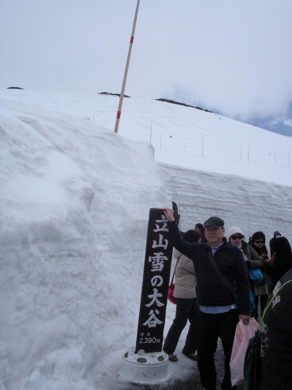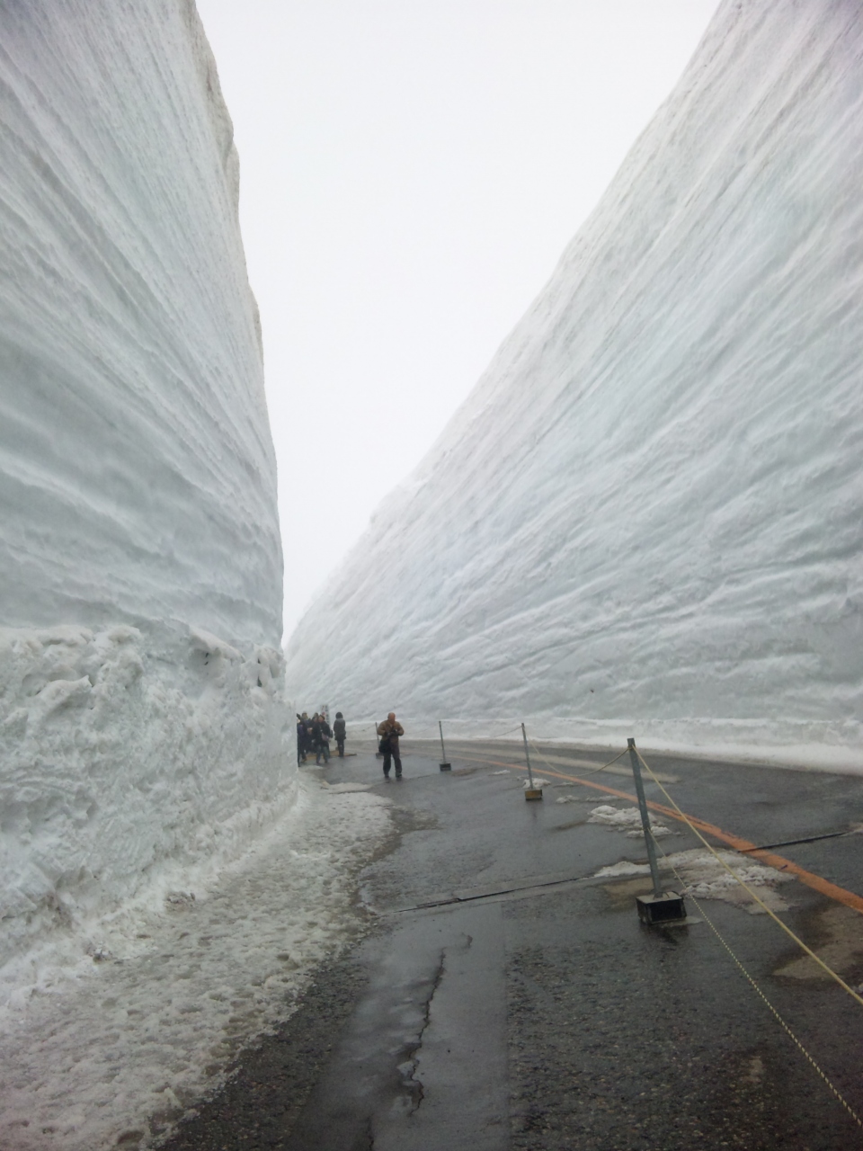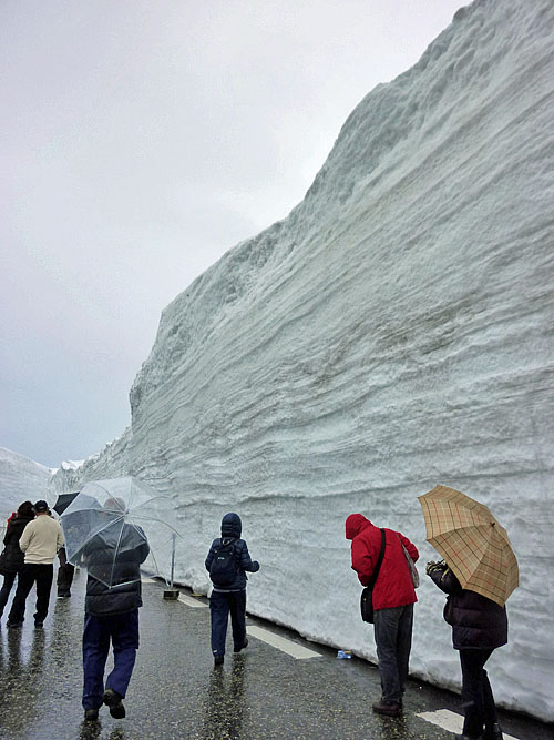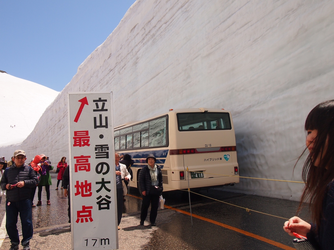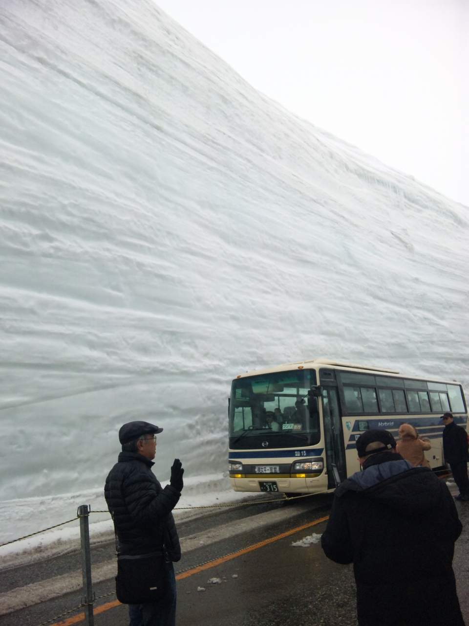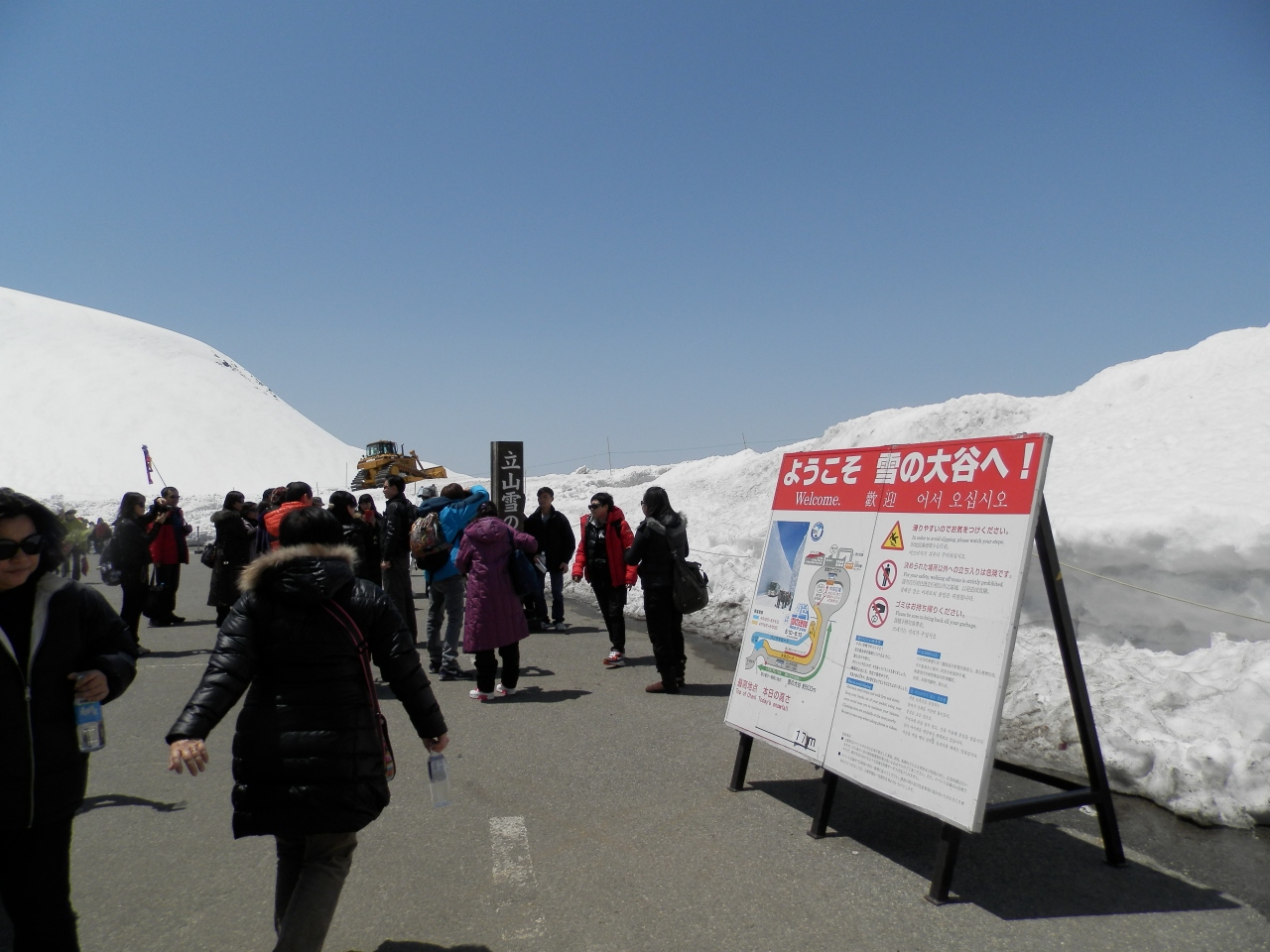 そびえ立つ雪壁の間をバスが走り抜ける光景は壮観だ。2013年の開通は4月16日だそうで、つい先日だ。この雪の大谷はどうして造るのだろうか。前年の秋に高原バス道路の両側に立てておいた木製のポールをGPSで探し当て、雪で埋もれた道路を30tのブルドーザで雪を削って少しずつ掘り下げて行くらしい。