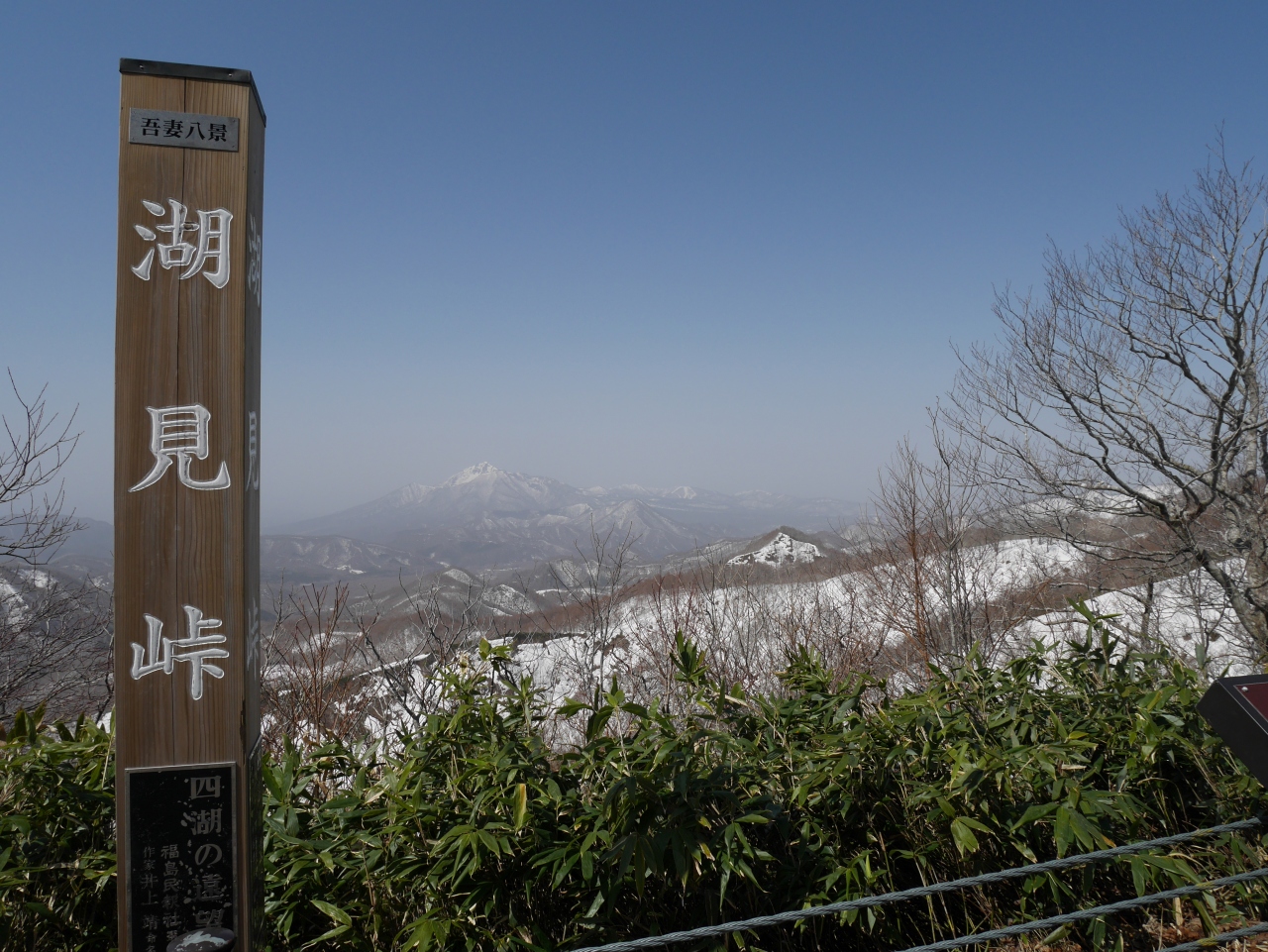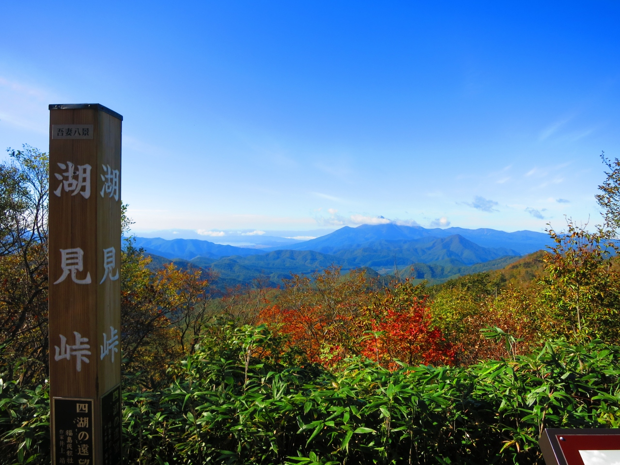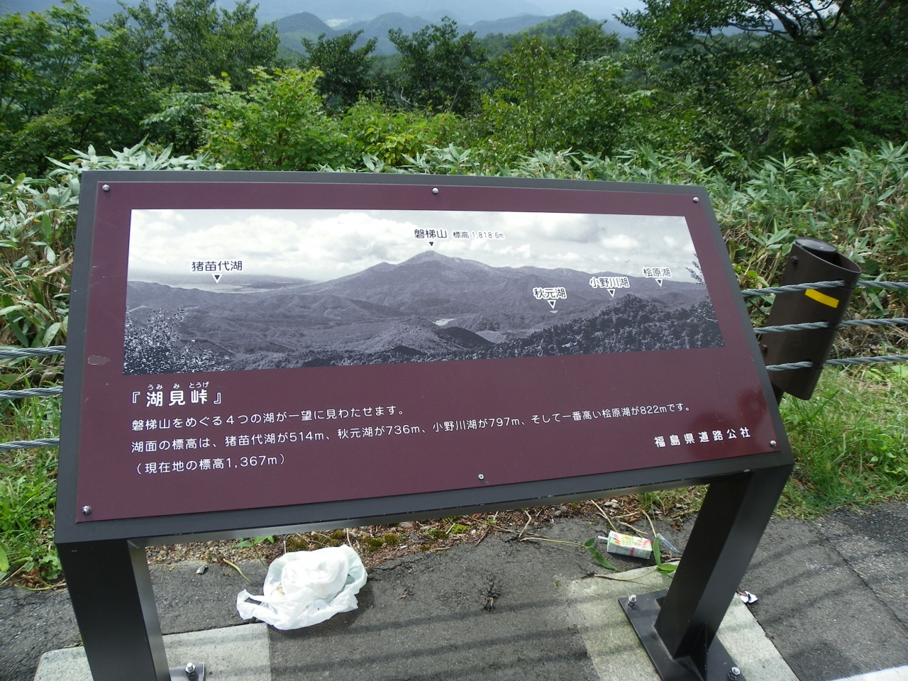 湖見峠と書いて(うみみとうげ)と読むそうです。双竜の辻からは約10分で着き、土湯側に向かって右側に少し広い路側帯があり、... 続きを読む標柱と説明案内盤が設置されています。車は路側帯に駐車して、ゆっくり風景を眺めることができます。