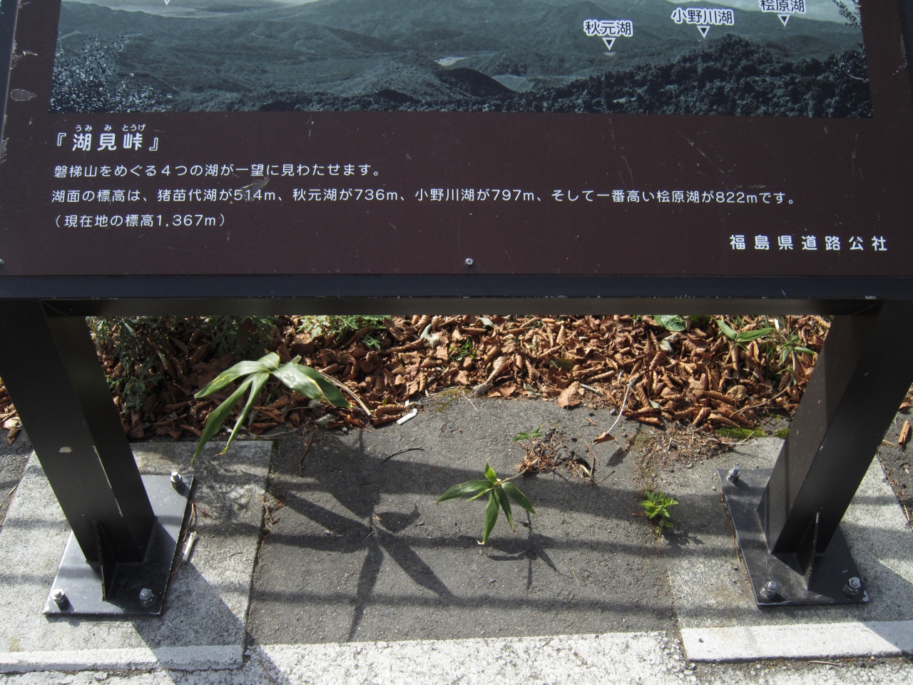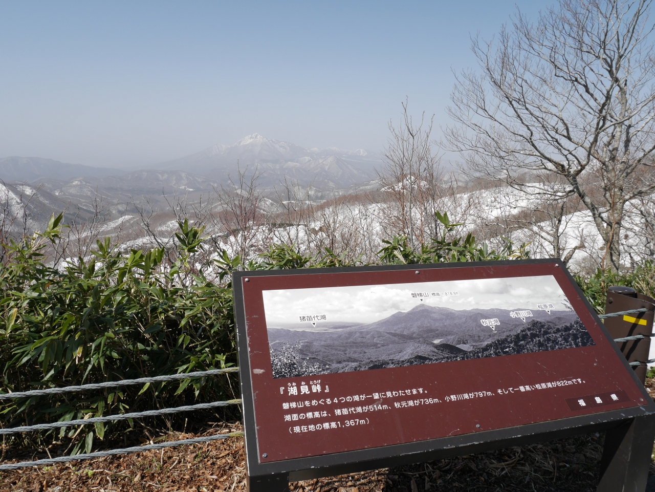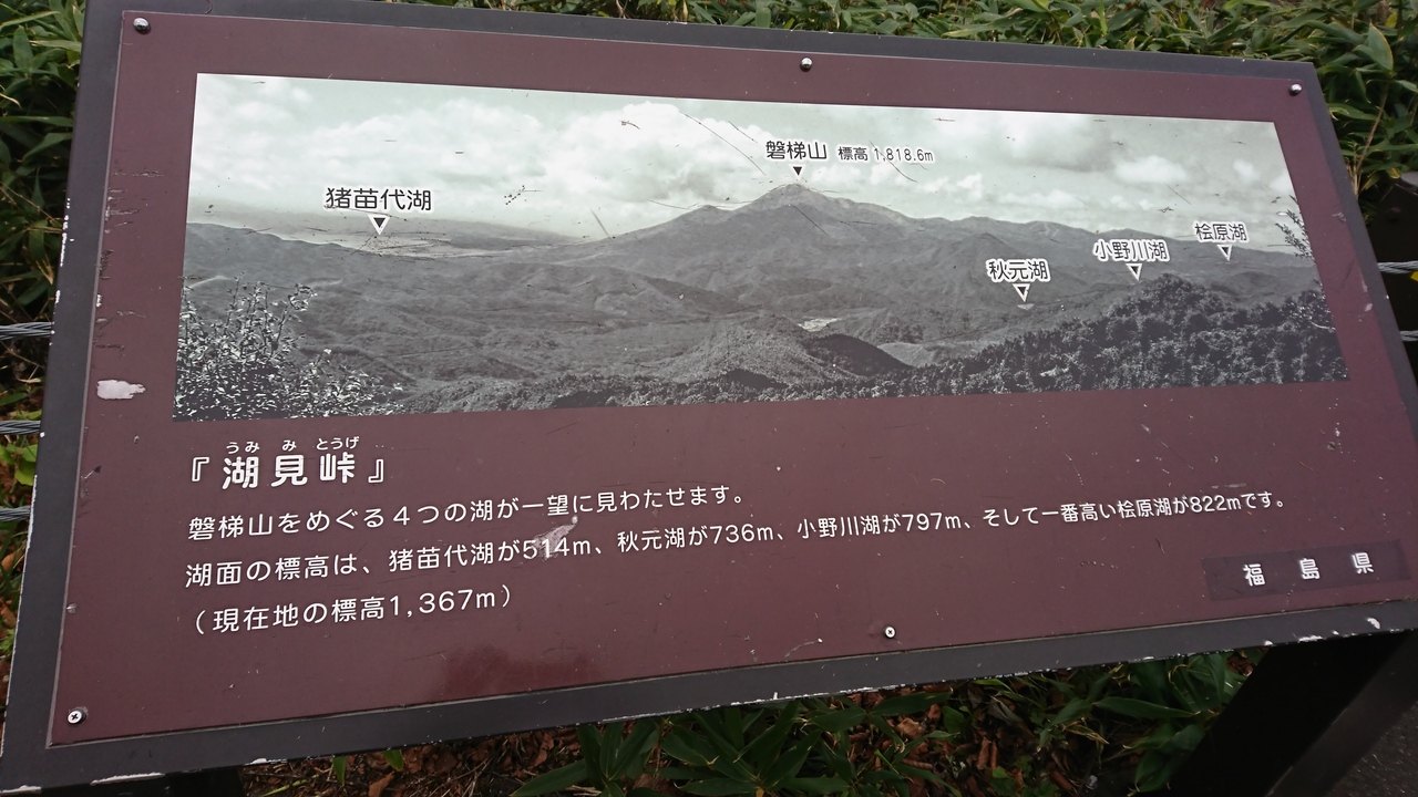 湖見峠と書いて(うみみとうげ)と読むそうです。双竜の辻からは約10分で着き、土湯側に向かって右側に少し広い路側帯があり、... 続きを読む標柱と説明案内盤が設置されています。車は路側帯に駐車して、ゆっくり風景を眺めることができます。