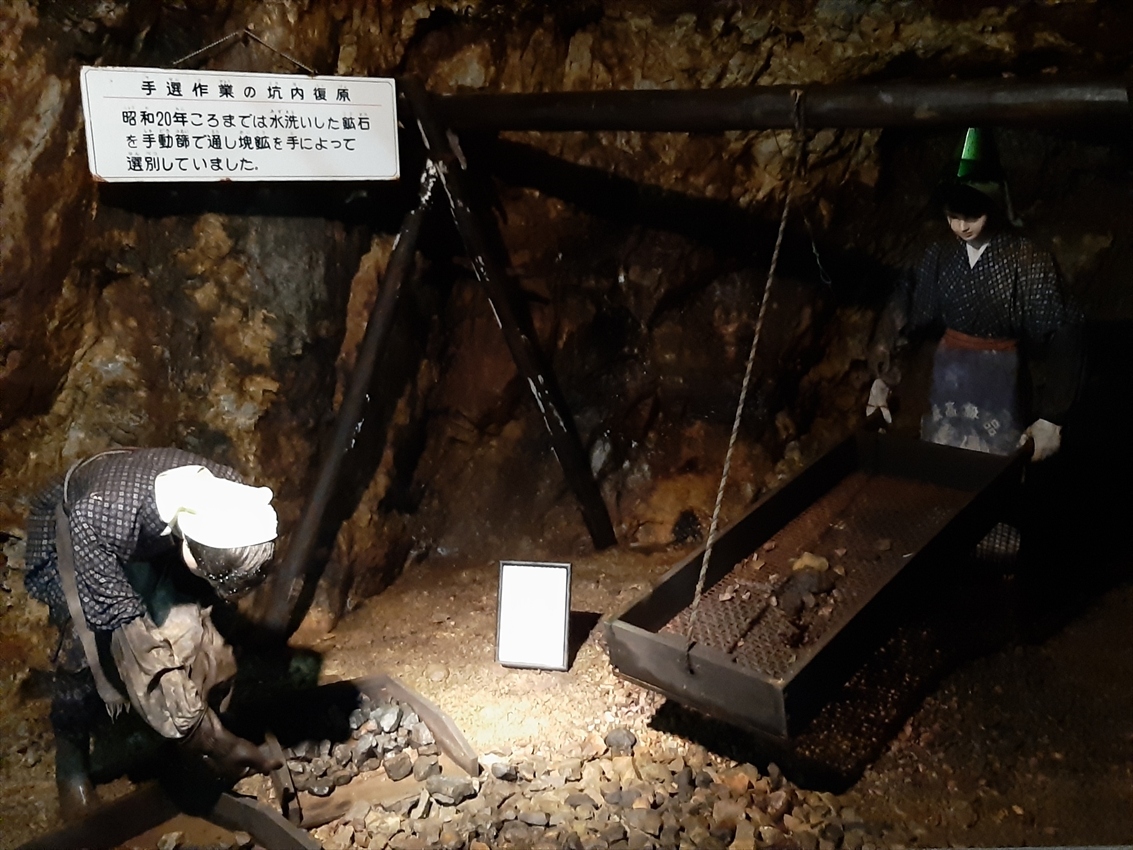 坑道に沿って世界の鉱石展示があったり、かつての坑道内での作業を再現した人形などの展示が見られましたが、これまでに見学した鉱山坑道と比べるとちょっと迫力不足かも。