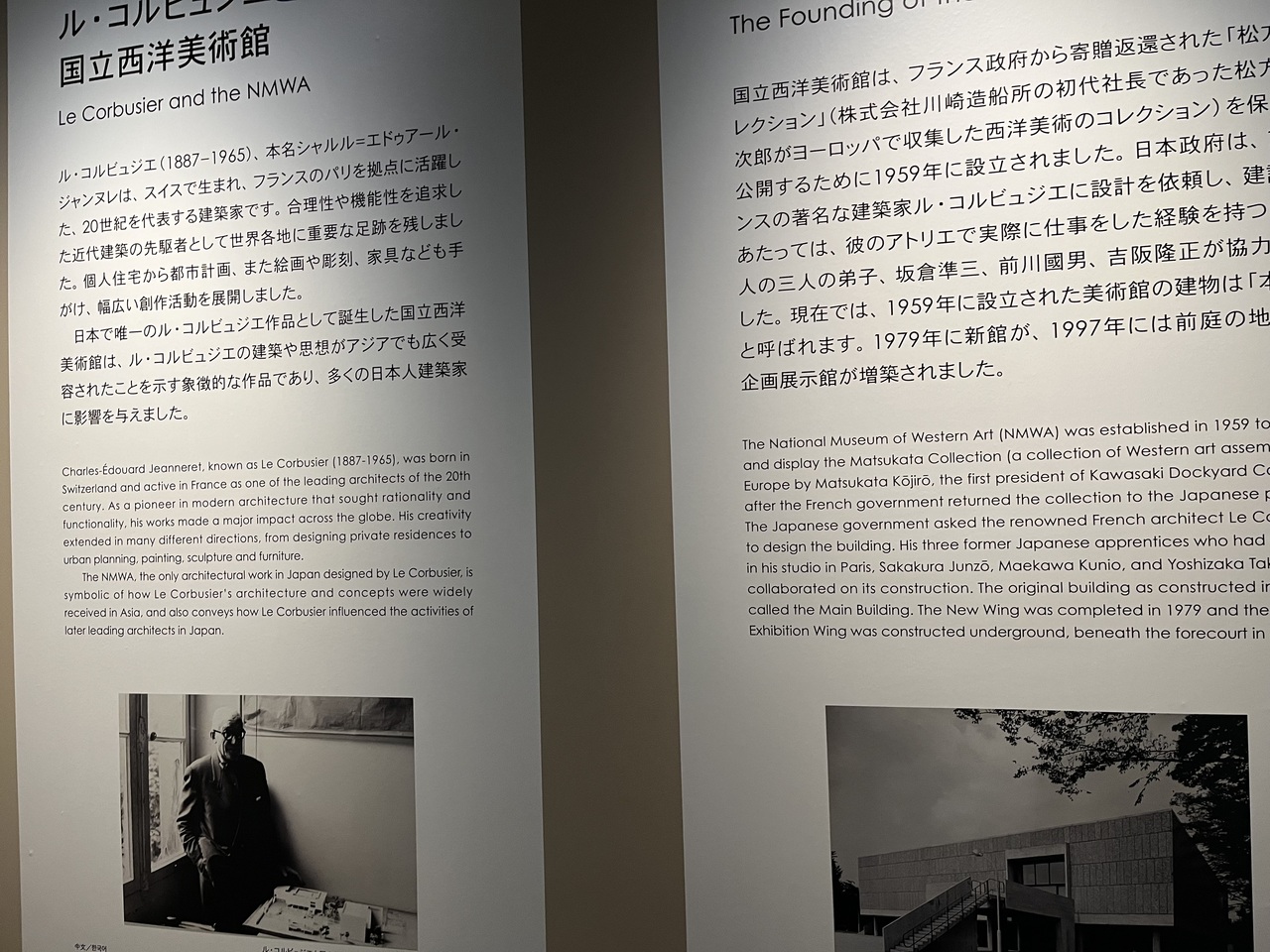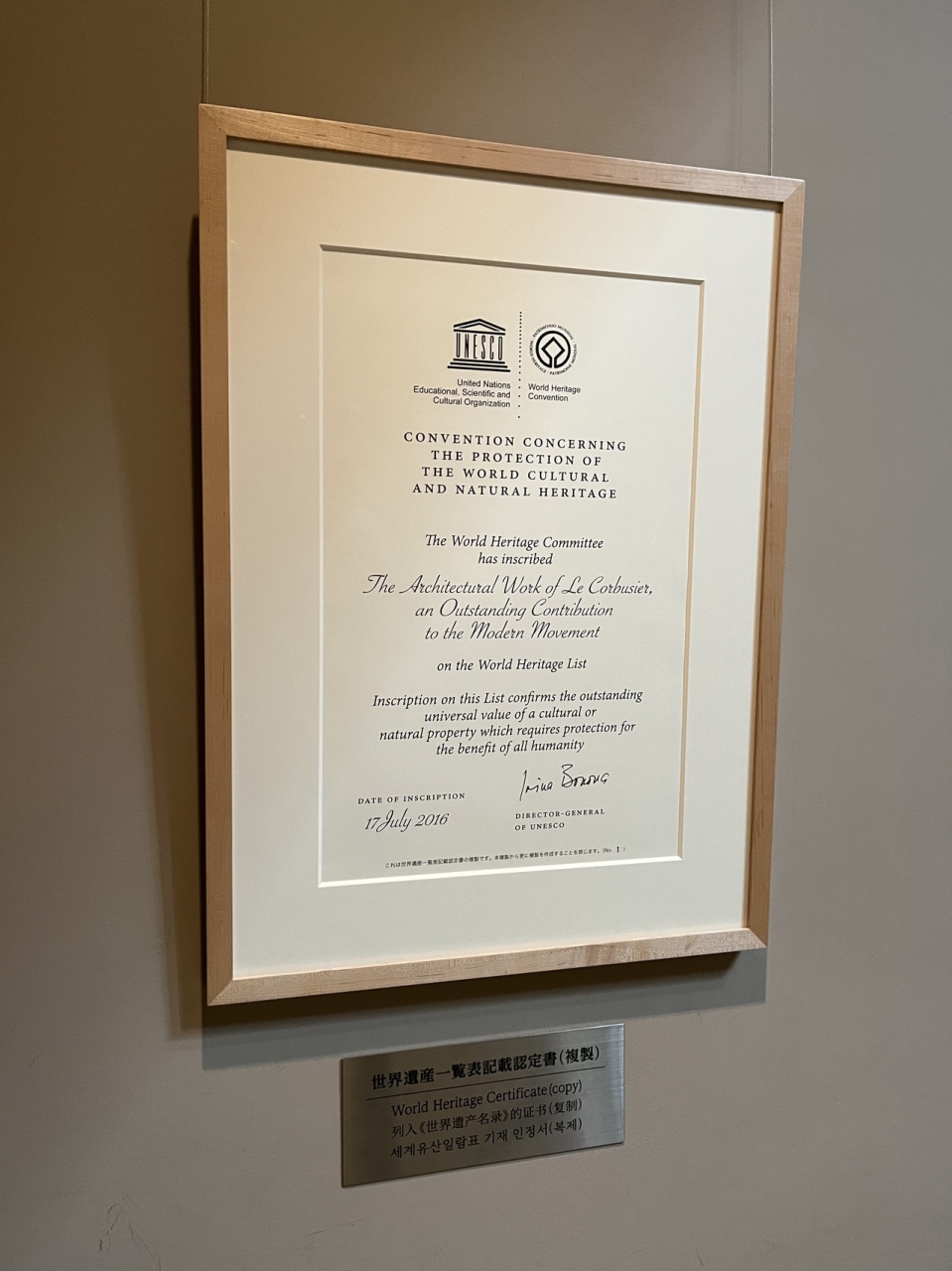 世界遺産委員会に叱られて、今回のリニューアルでは前庭や彫刻を元の姿に配置しなおして、開館当時の姿に戻している。これらのいきさつやコルビュジエのそもそも意図を解説しており、面白い。