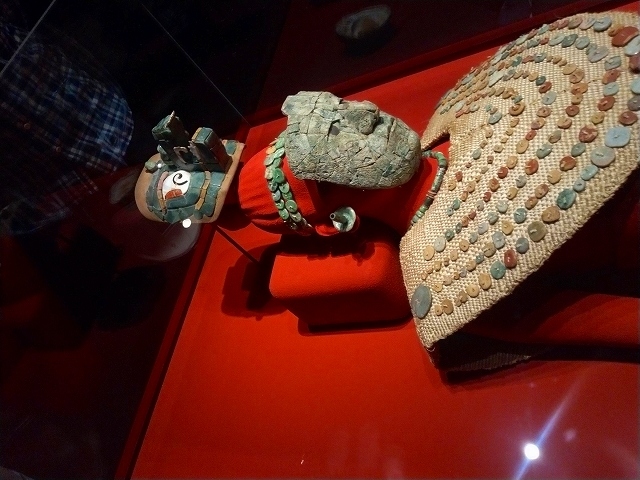 その後のアステカ文明は大神殿を現在のメキシコシティ辺りに建設して栄華を誇った。金のアクセサリーの出土品が出品。テオティワカンの名残りか装飾品が色鮮やかだ。