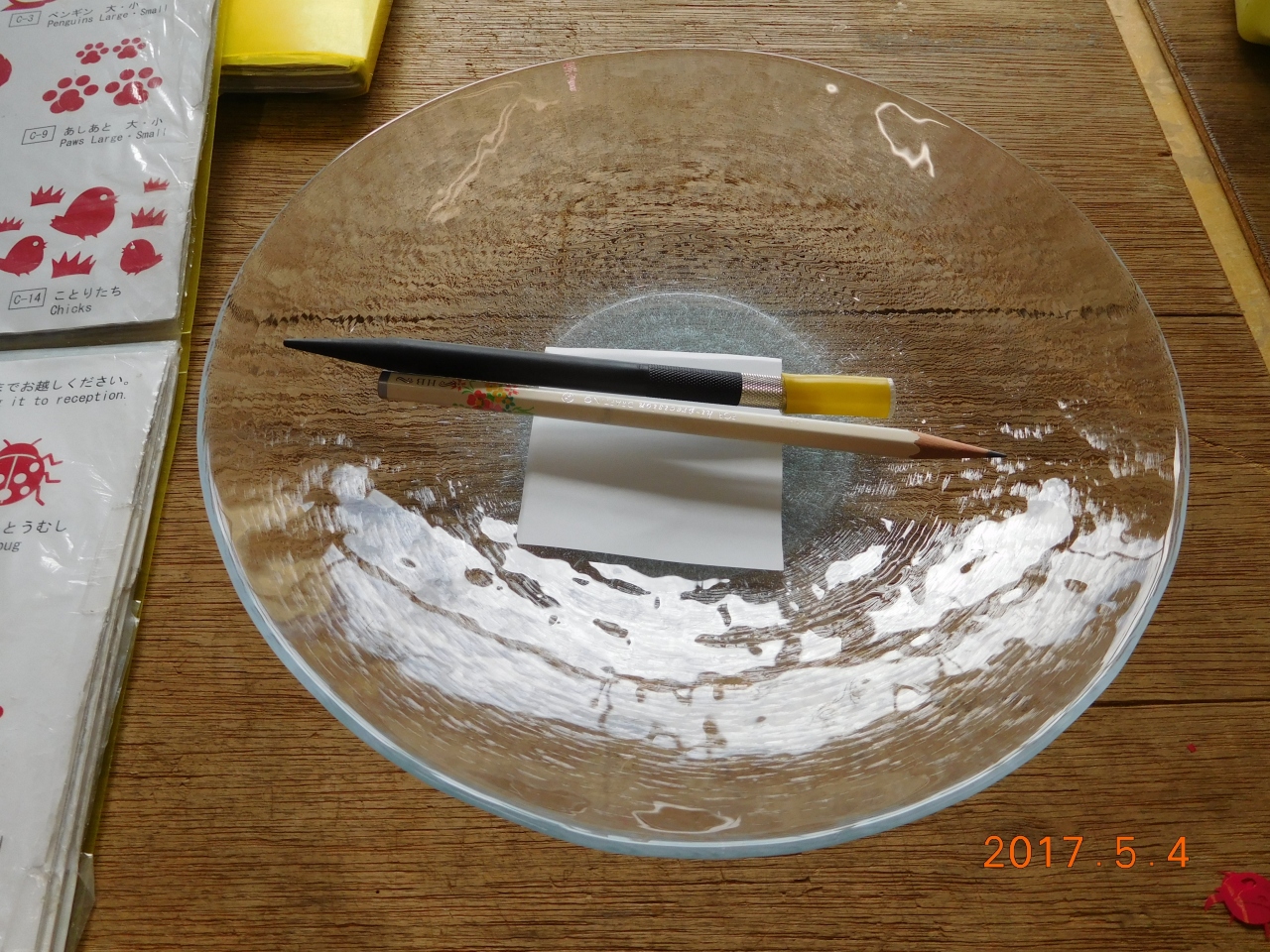 お皿に好きな模様になるようテープを貼って、テープ以外の所をサンドブラスト(透明なお皿を細かく傷つけ?白く濁らせる)して、洗ってシールをはがすと、シールの所だけ透明な模様が残るという素敵なお皿を作りました。