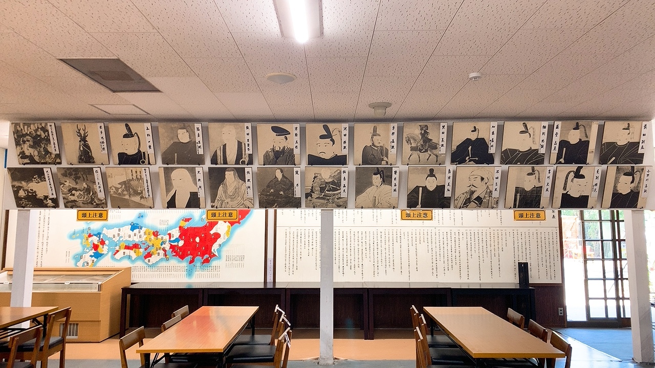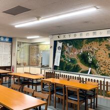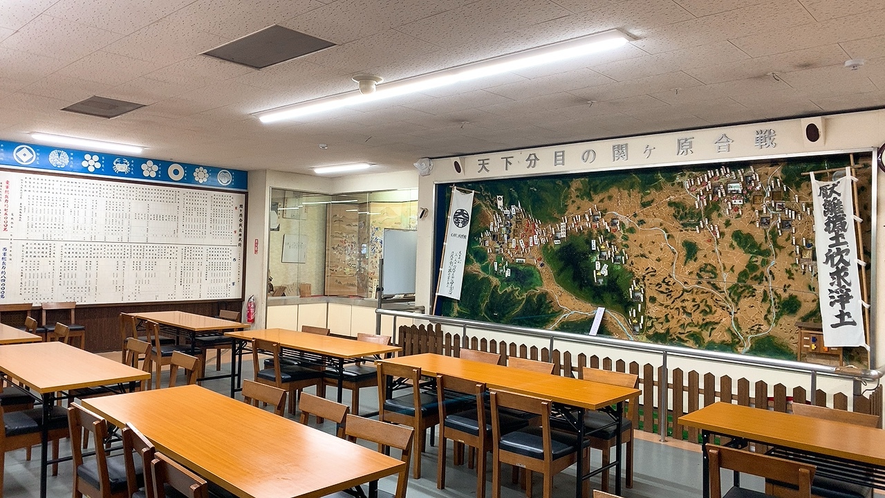玄関の脇に合戦資料館が有ります。資料が展示されていますが、ここは団体客の食事処となっていました。大勢のおばちゃんやおじちゃんが食事中でした。