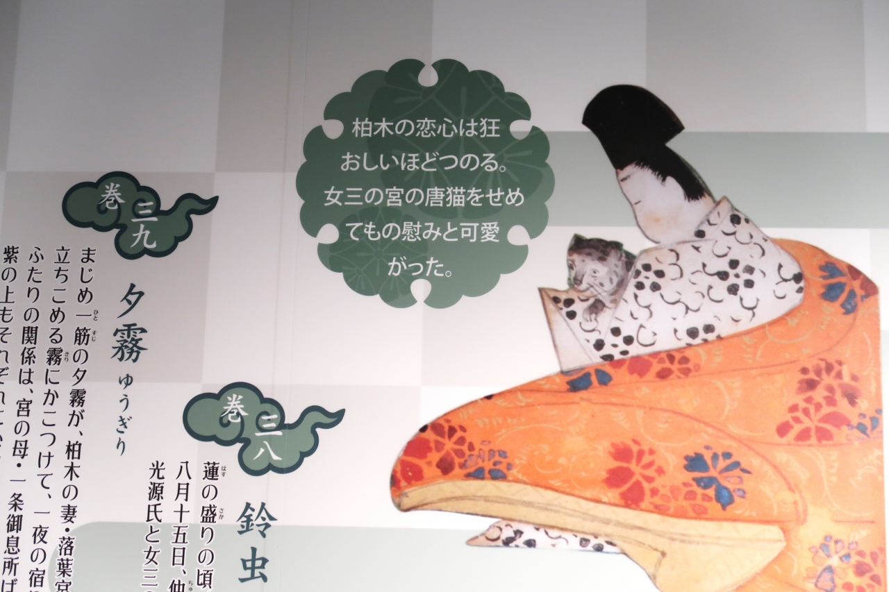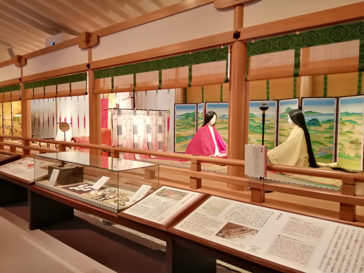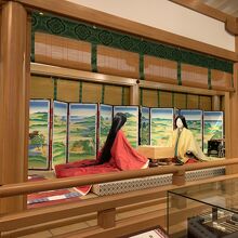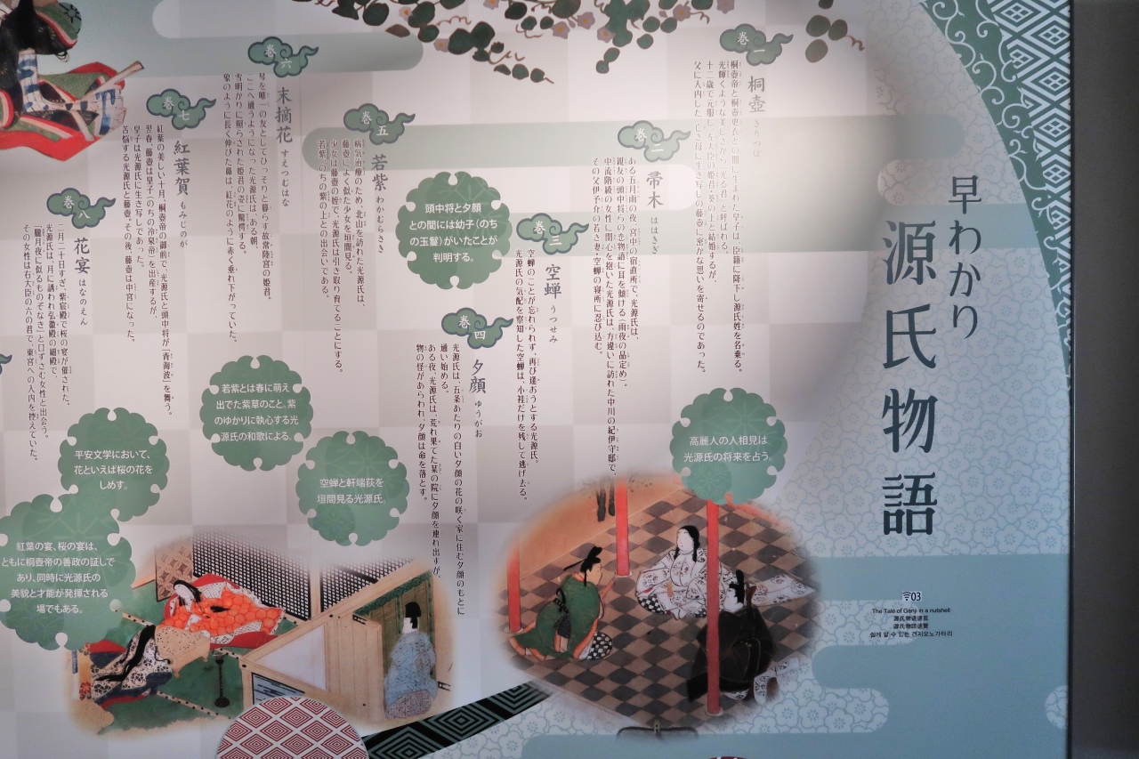 常設展示室では、実物大の牛車や調度品の復元のほか、光源氏の邸宅である六条院の縮小模型などを展示する。2018年9月のリニューアルでは、ここでしかできない体験型展示の導入や多言語化の充実を図った。映像展示室では、2019年4月から新作アニメ「GENJI FANTASY ネコが光源氏に恋をした」の上映を開始。