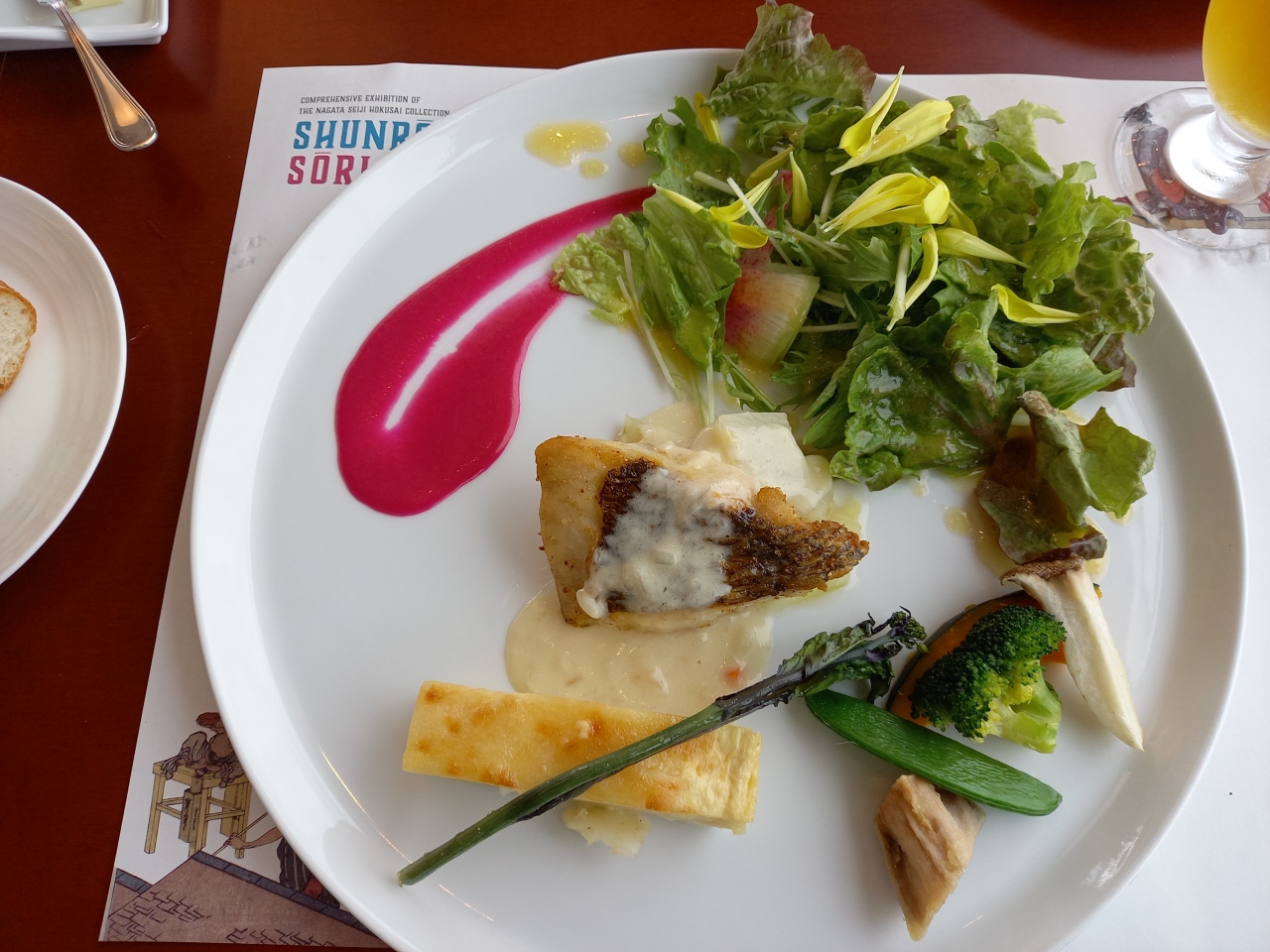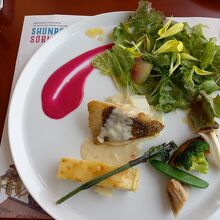お肉orお魚をメインに据え、黄色いエディブルフラワーが