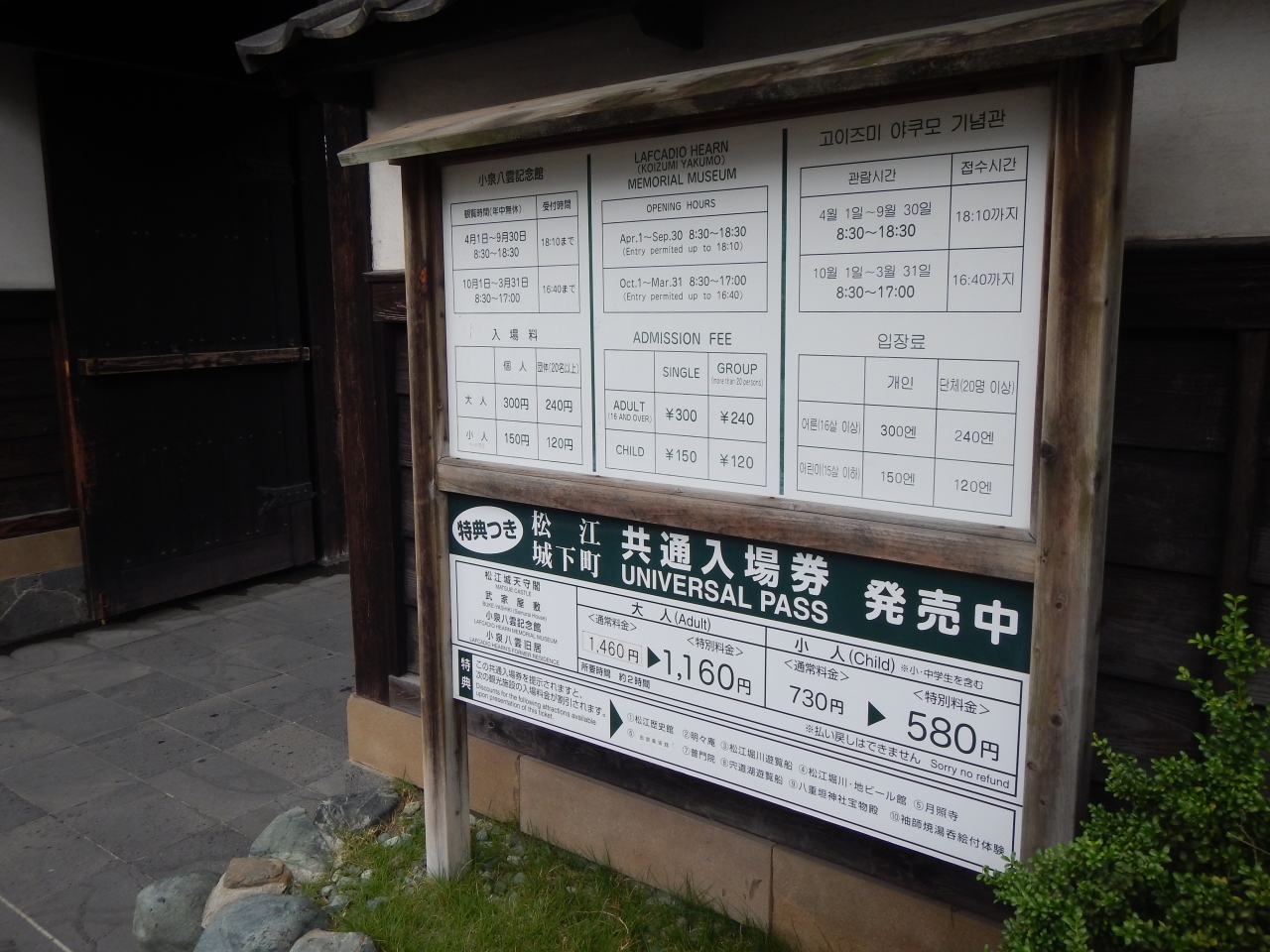 2015年6月「松江城天守閣」「小泉八雲記念館」「小泉八雲旧居」「武家屋敷」の4施設で通常の2割引で入場できる共通券がありました
