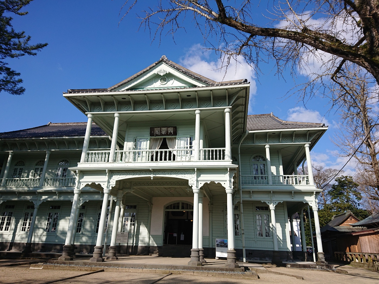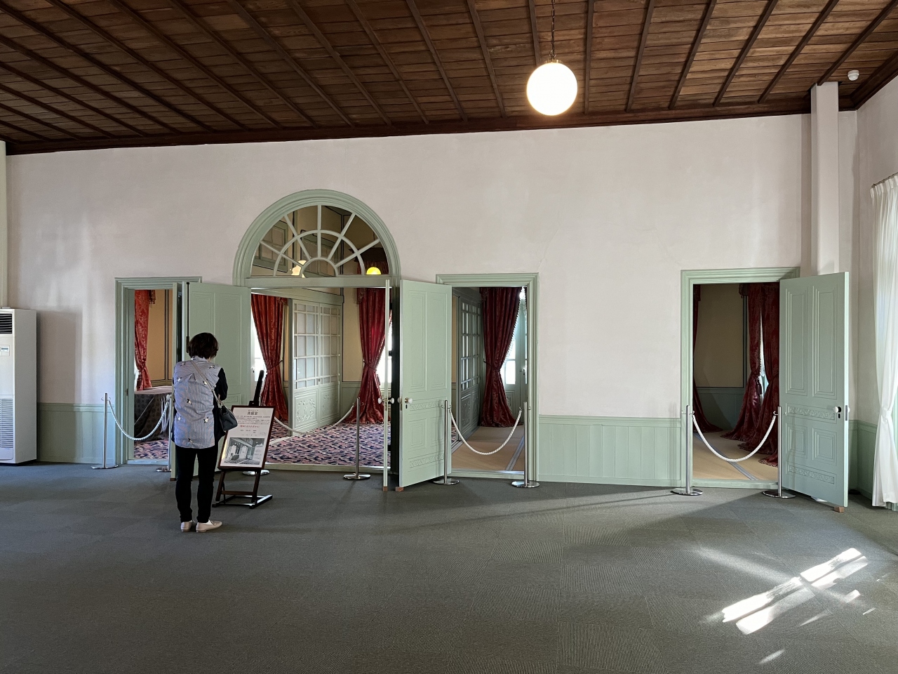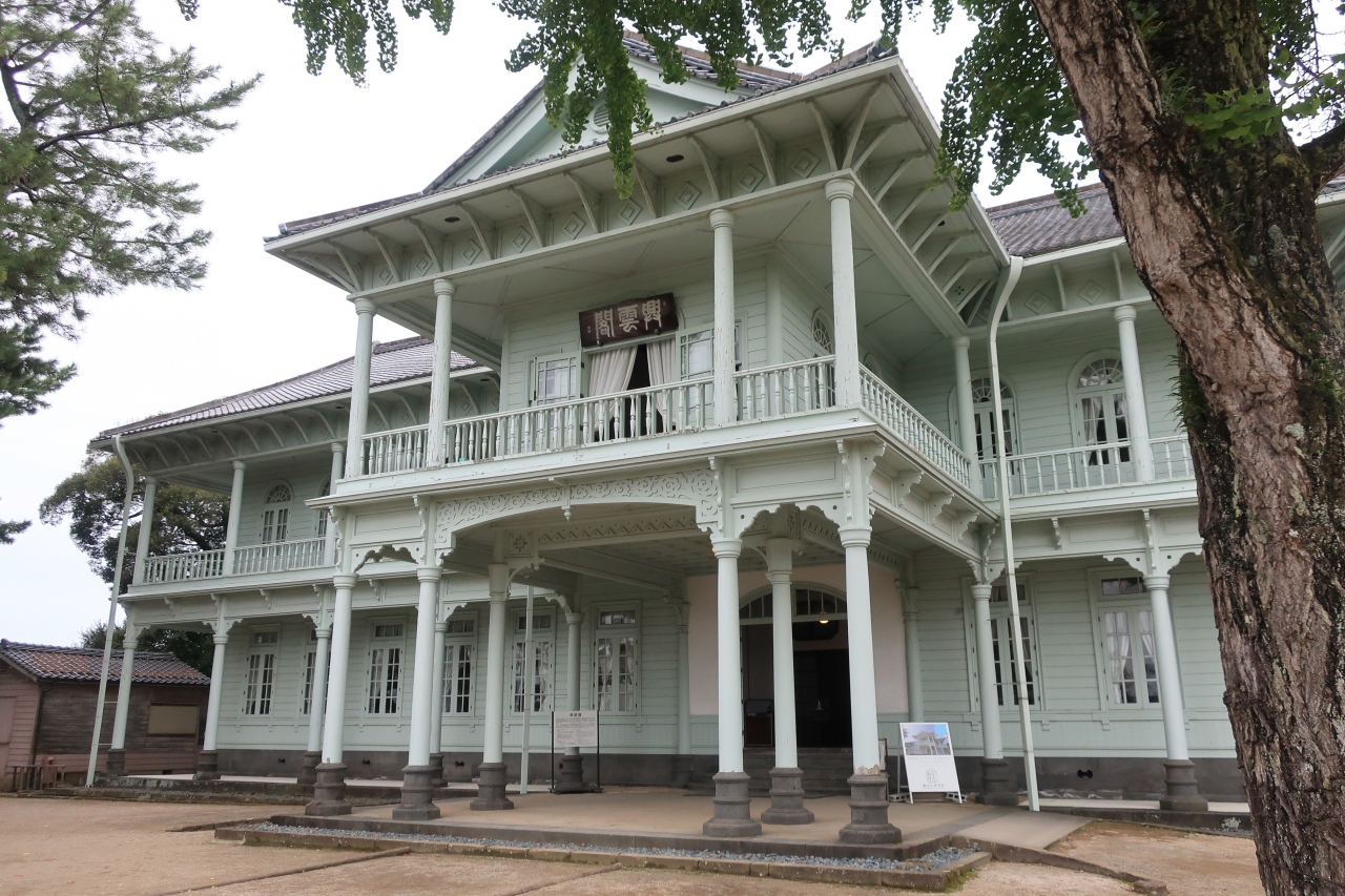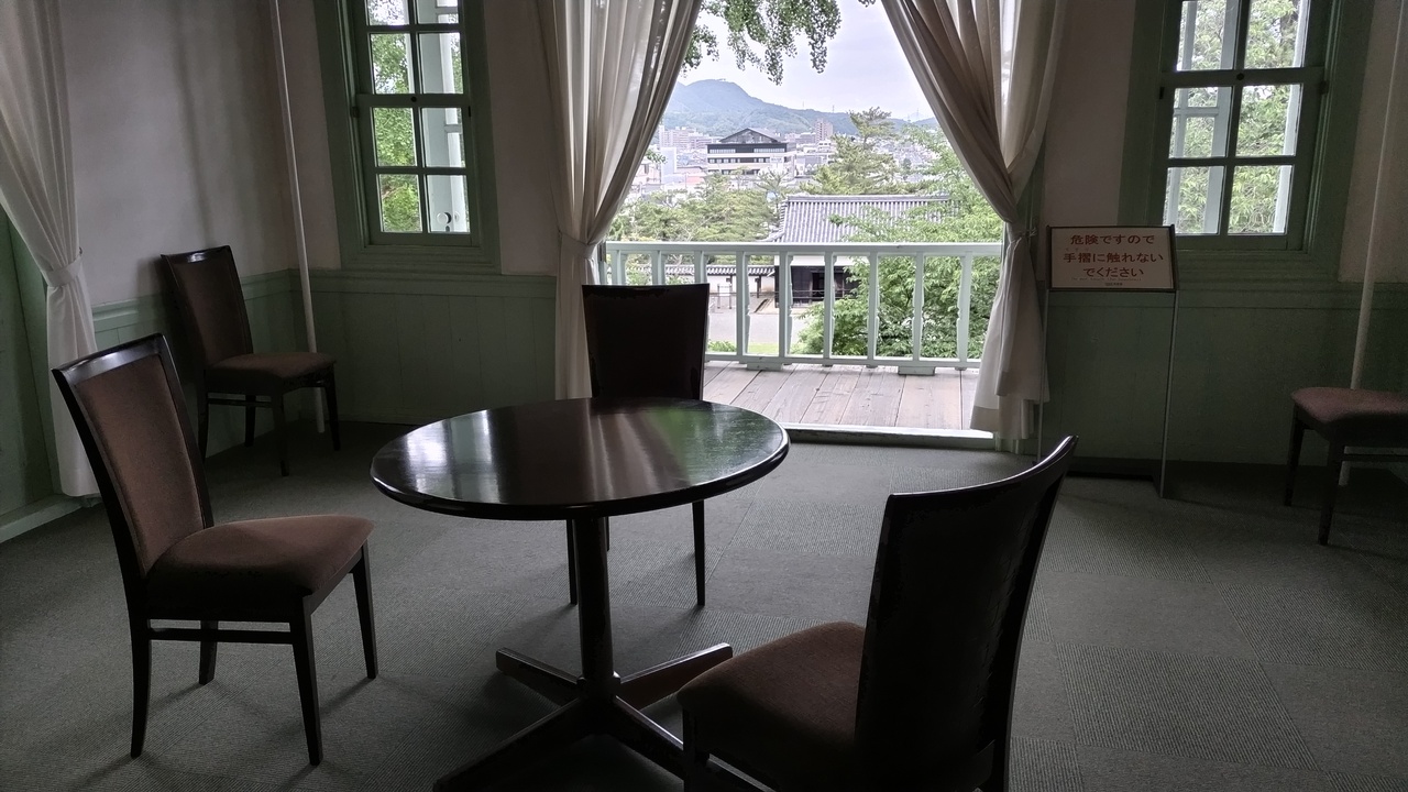 松江城の敷地内、一ノ門の向かいの稲荷神社の奥に、水色のしゃれたレトロな館があります。 ひっそりとした佇まいですが、かつて... 続きを読むこの地で要人や賓客をもてなす迎賓館として 建てられました。 中は一見シンプルですが、明治当時は最新の洋館だったと思われます。 ブルーがいいですね。洋風のバルコニーや窓枠、深紅のカーテン。 諸外国に見下されない様に、立派なものを建てようと日本各地で静養を見習って洋館を立て、おもてなしの心を尽くした時代でした。 閉じる