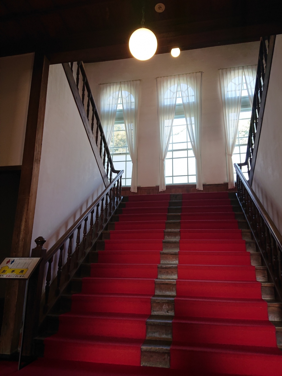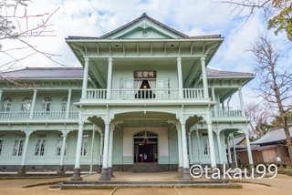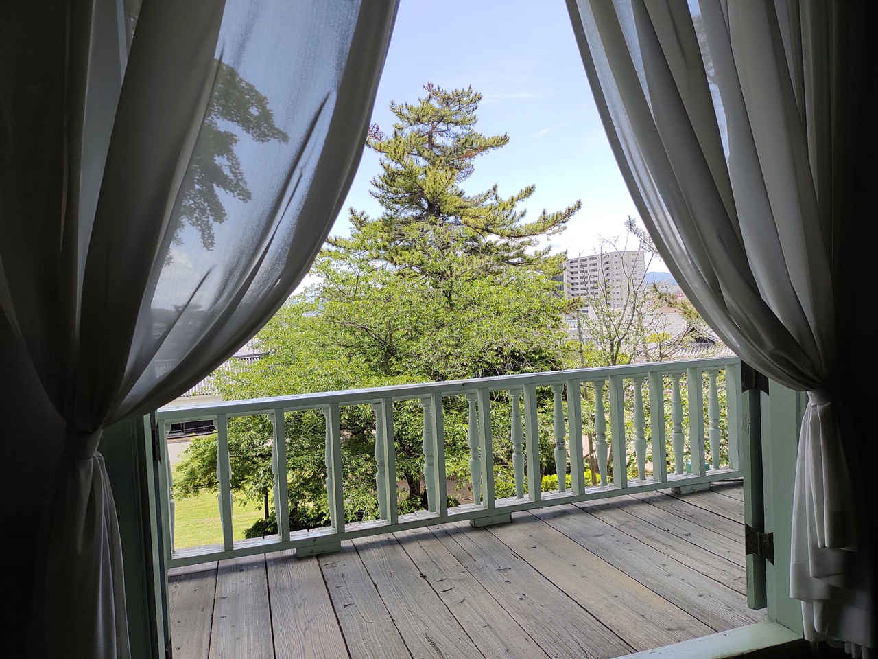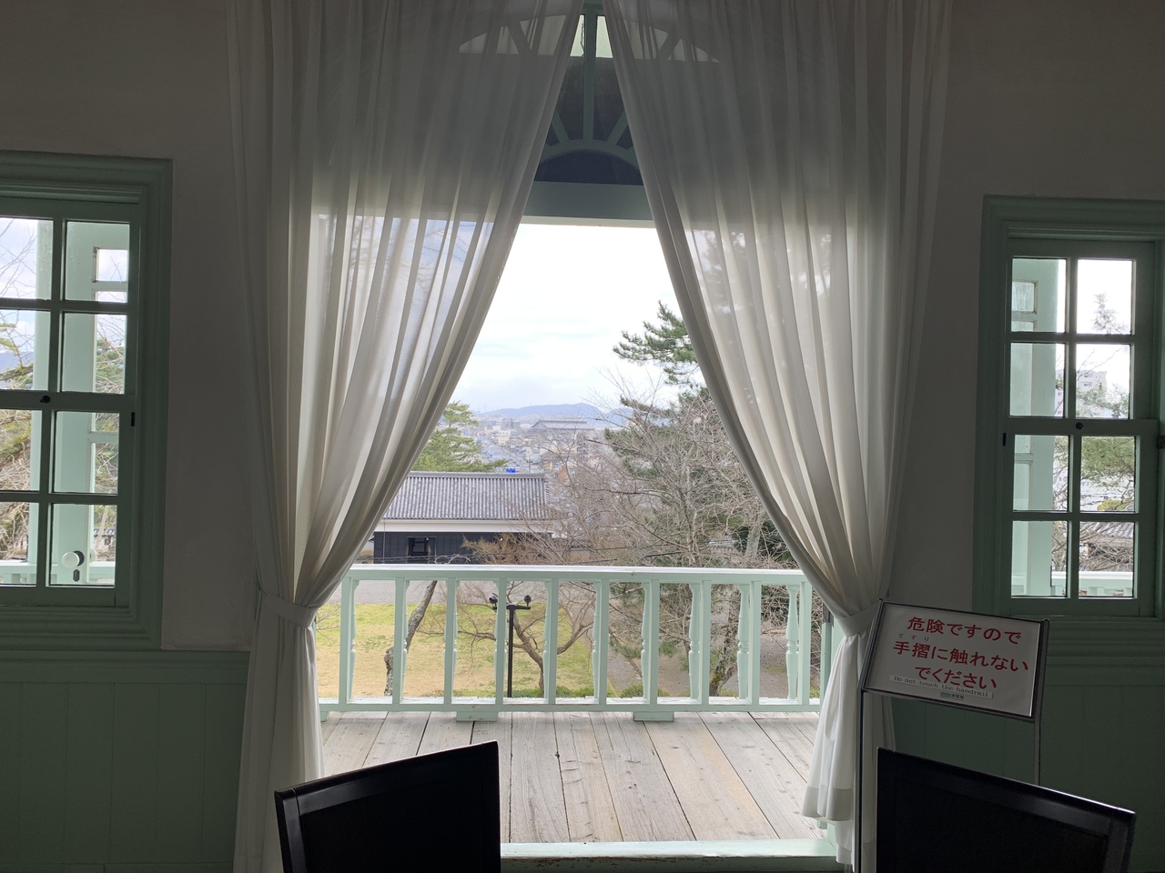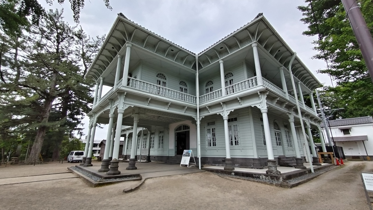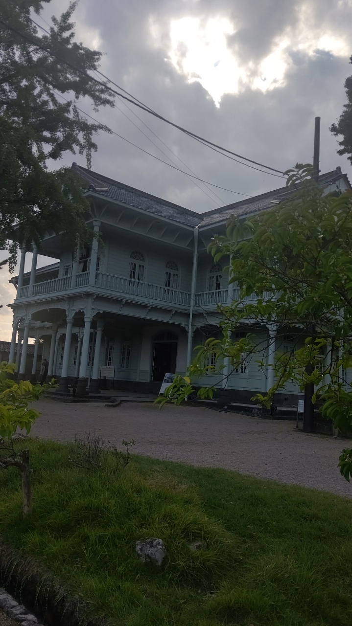 松江城の敷地内、一ノ門の向かいの稲荷神社の奥に、水色のしゃれたレトロな館があります。 ひっそりとした佇まいですが、かつて... 続きを読むこの地で要人や賓客をもてなす迎賓館として 建てられました。 中は一見シンプルですが、明治当時は最新の洋館だったと思われます。 ブルーがいいですね。洋風のバルコニーや窓枠、深紅のカーテン。 諸外国に見下されない様に、立派なものを建てようと日本各地で静養を見習って洋館を立て、おもてなしの心を尽くした時代でした。 閉じる