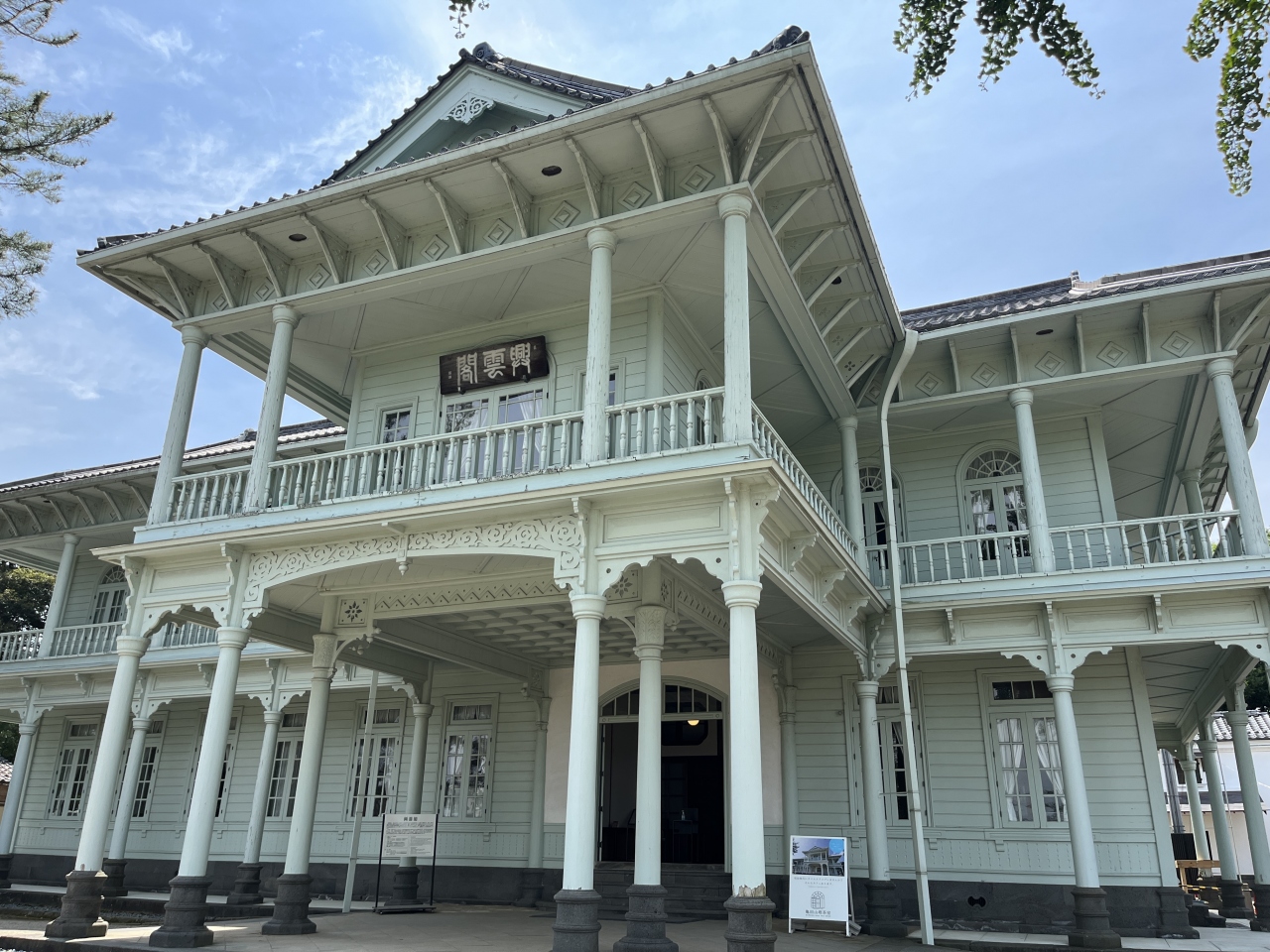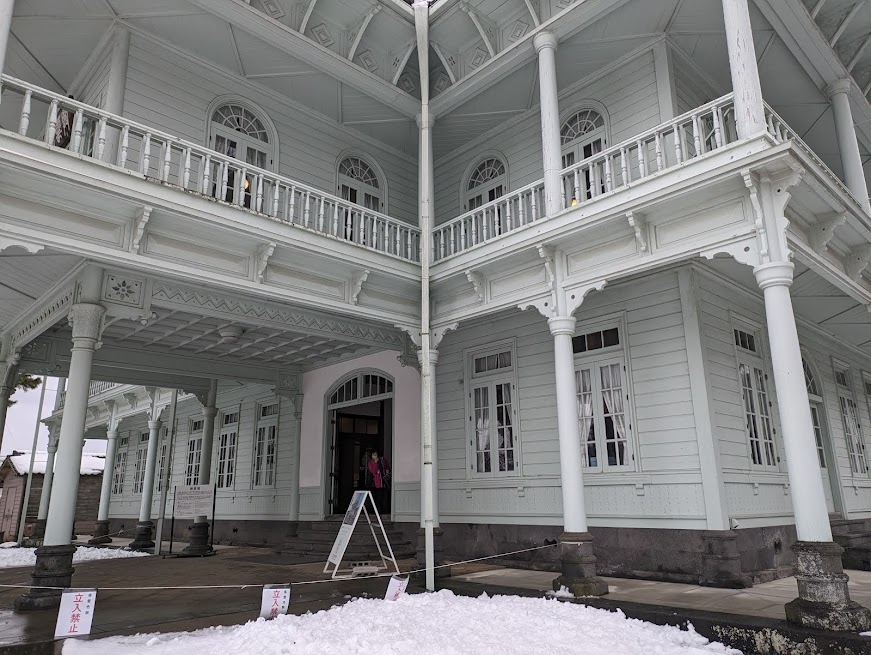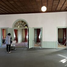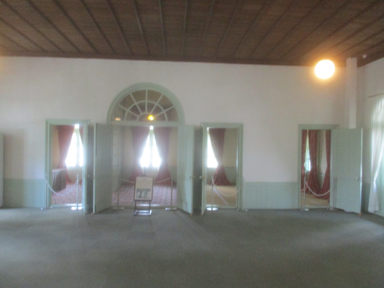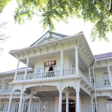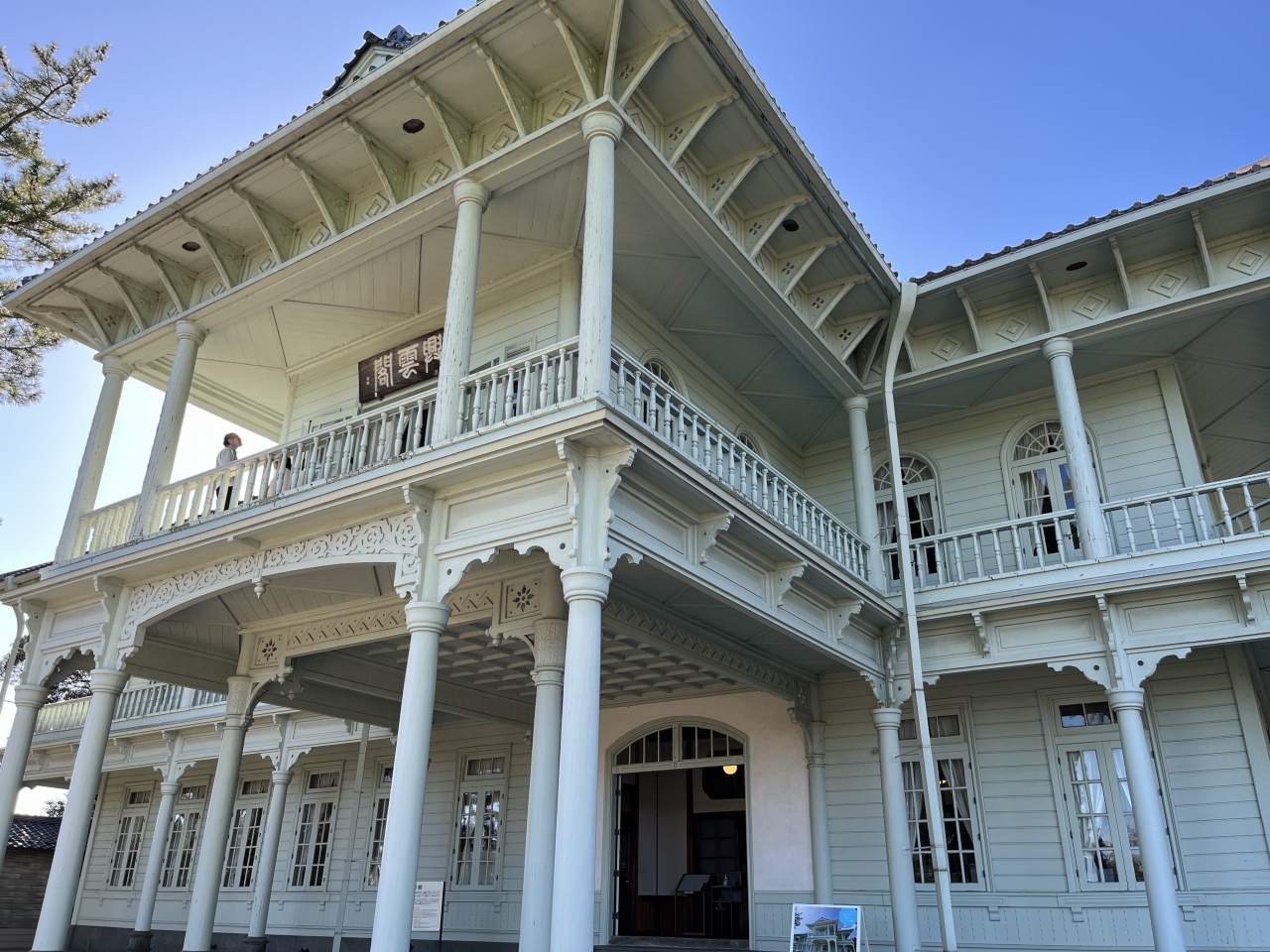 松江城の敷地内、一ノ門の向かいの稲荷神社の奥に、水色のしゃれたレトロな館があります。 ひっそりとした佇まいですが、かつて... 続きを読むこの地で要人や賓客をもてなす迎賓館として 建てられました。 中は一見シンプルですが、明治当時は最新の洋館だったと思われます。 ブルーがいいですね。洋風のバルコニーや窓枠、深紅のカーテン。 諸外国に見下されない様に、立派なものを建てようと日本各地で静養を見習って洋館を立て、おもてなしの心を尽くした時代でした。 閉じる