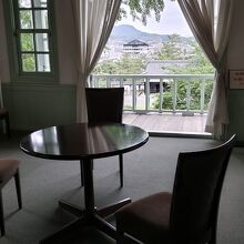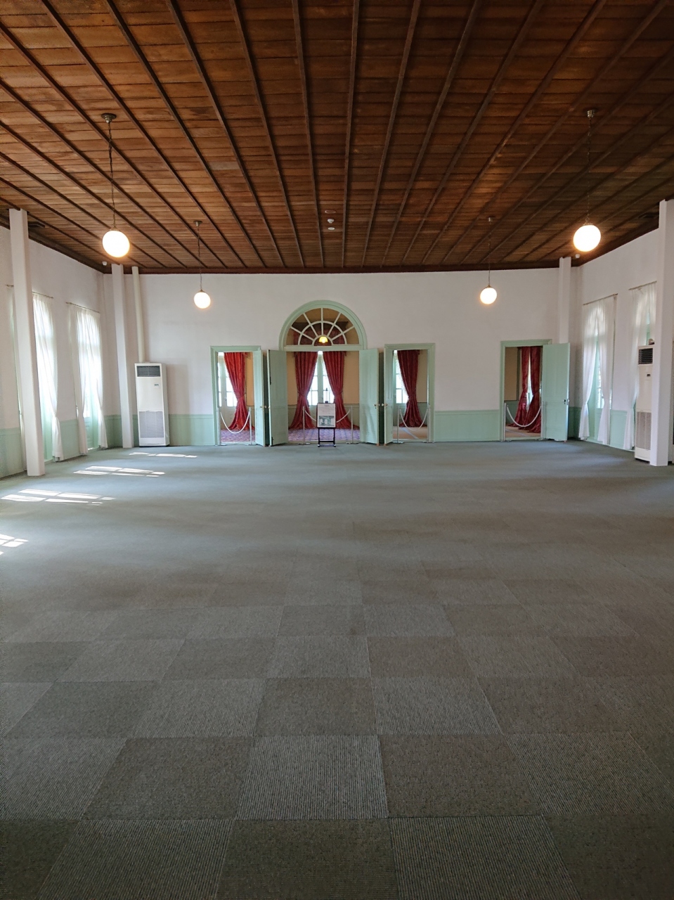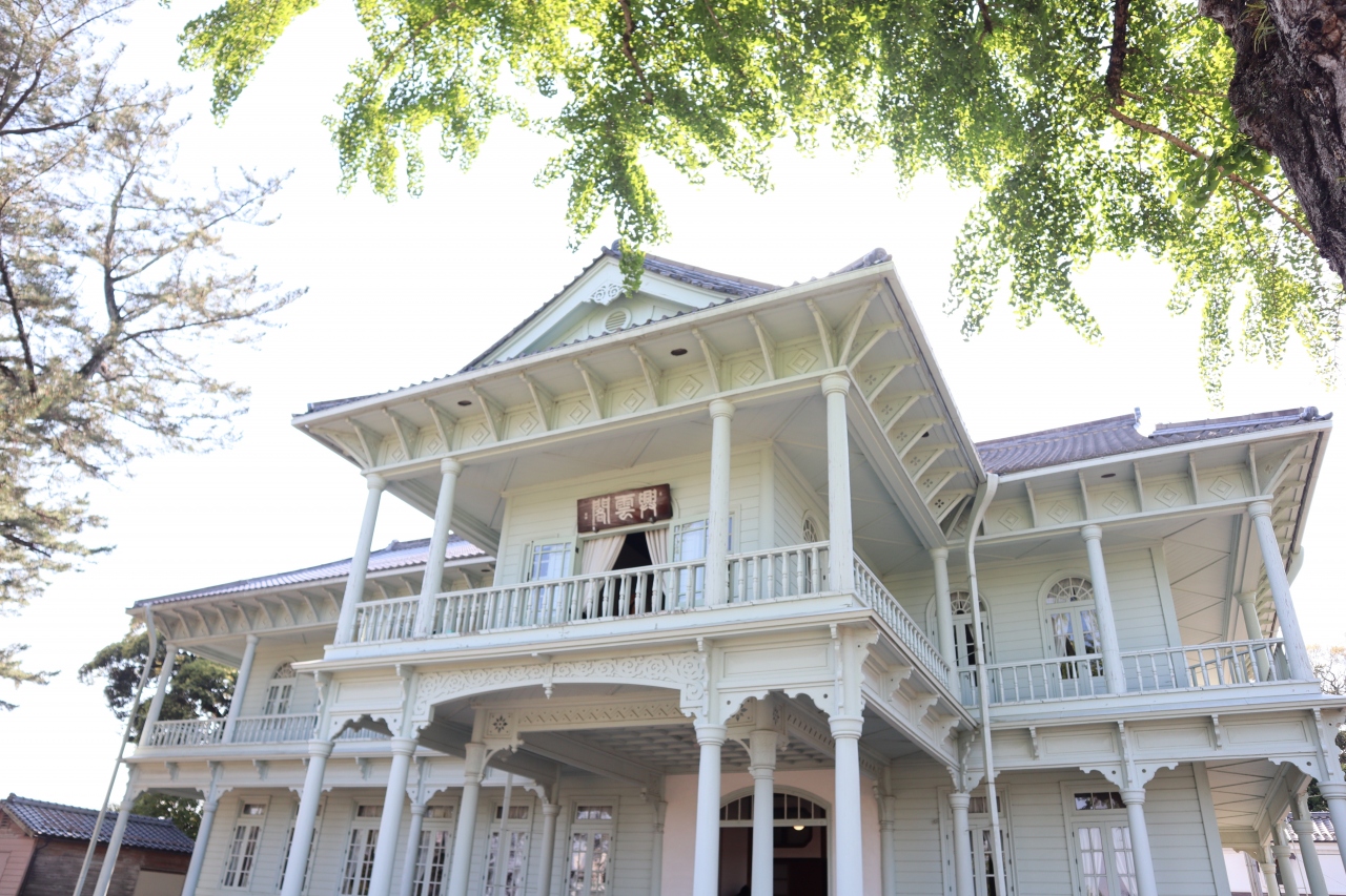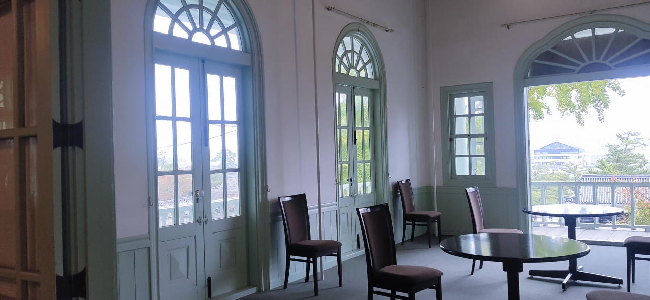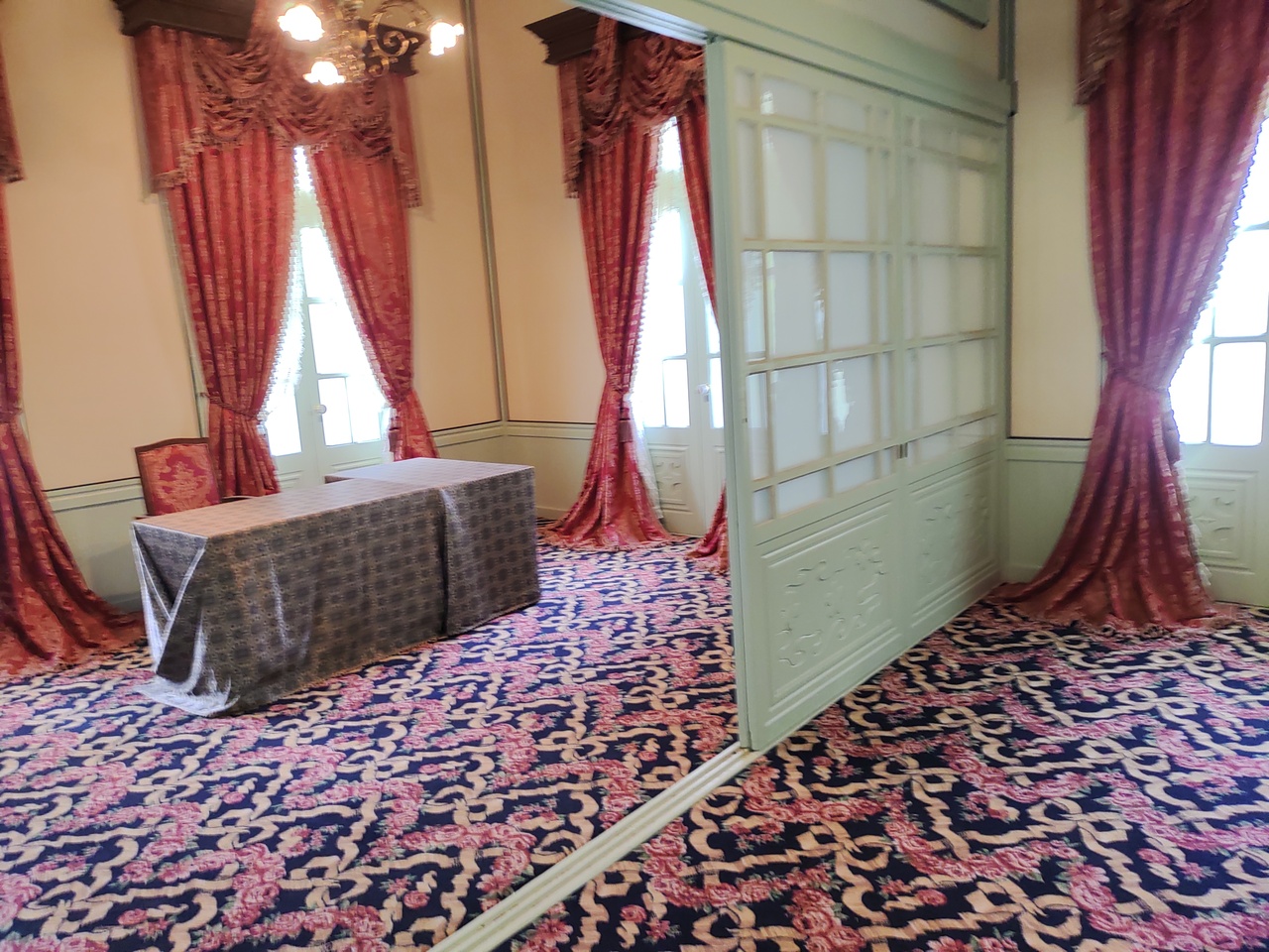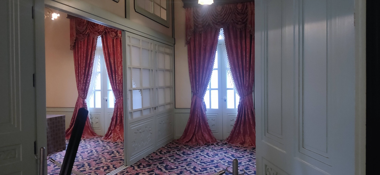 松江城の敷地内、一ノ門の向かいの稲荷神社の奥に、水色のしゃれたレトロな館があります。 ひっそりとした佇まいですが、かつて... 続きを読むこの地で要人や賓客をもてなす迎賓館として 建てられました。 中は一見シンプルですが、明治当時は最新の洋館だったと思われます。 ブルーがいいですね。洋風のバルコニーや窓枠、深紅のカーテン。 諸外国に見下されない様に、立派なものを建てようと日本各地で静養を見習って洋館を立て、おもてなしの心を尽くした時代でした。 閉じる