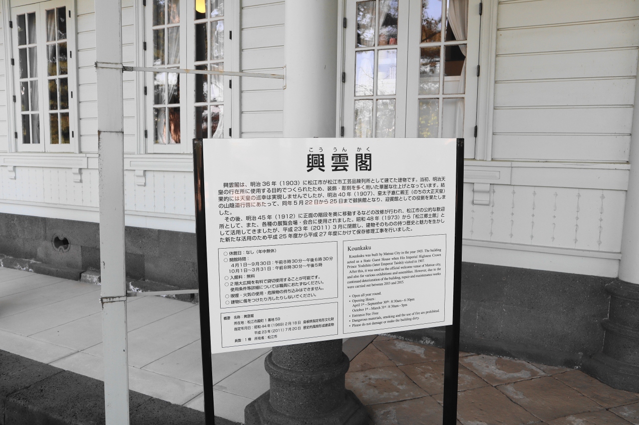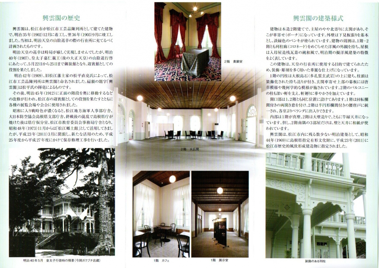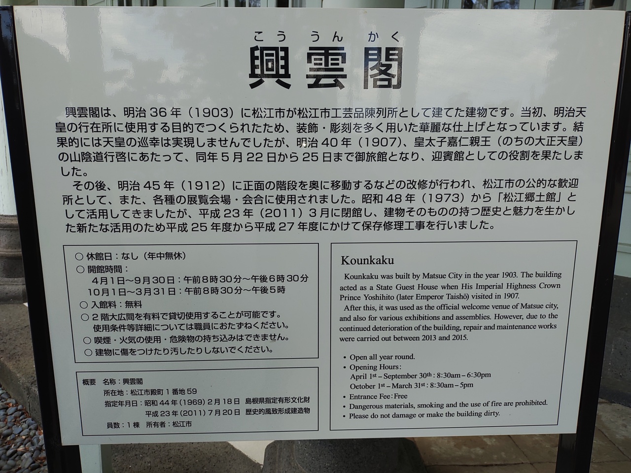 松江城二ノ丸に建つ明治建築の洋館。 明治36(1903)年に完成した県内に残る数少ない明治建築で、明治40(1907)年、皇太子嘉仁親王(のちの大正天皇)のご宿泊所としても使用された。 正面には車寄せがあり、周囲を豊かな装飾で飾る柱を配した優美な造り。戦後は各種展示会場、市教育委員会庁舎などに転用された後、『松江郷土館』として郷土の歴史・民俗資料などが展示された。 平成23(2011)年3月に閉館し、階段室を移設して現在の形態となった明治45年当時に復元するとともに、建物そのものの持つ歴史と魅力を生かした新たな活用のため、平成25年度から平成27年度にかけて保存修理工事を行った。