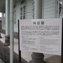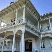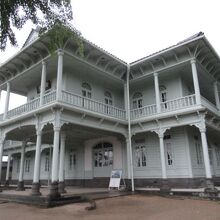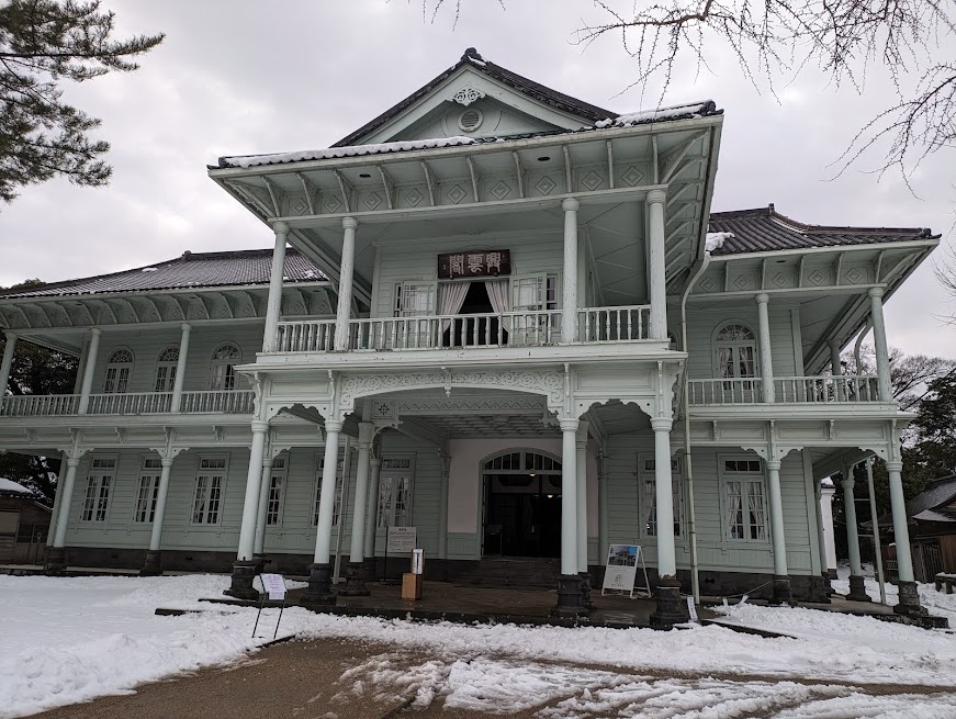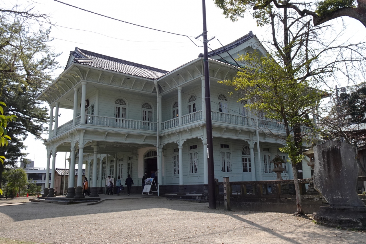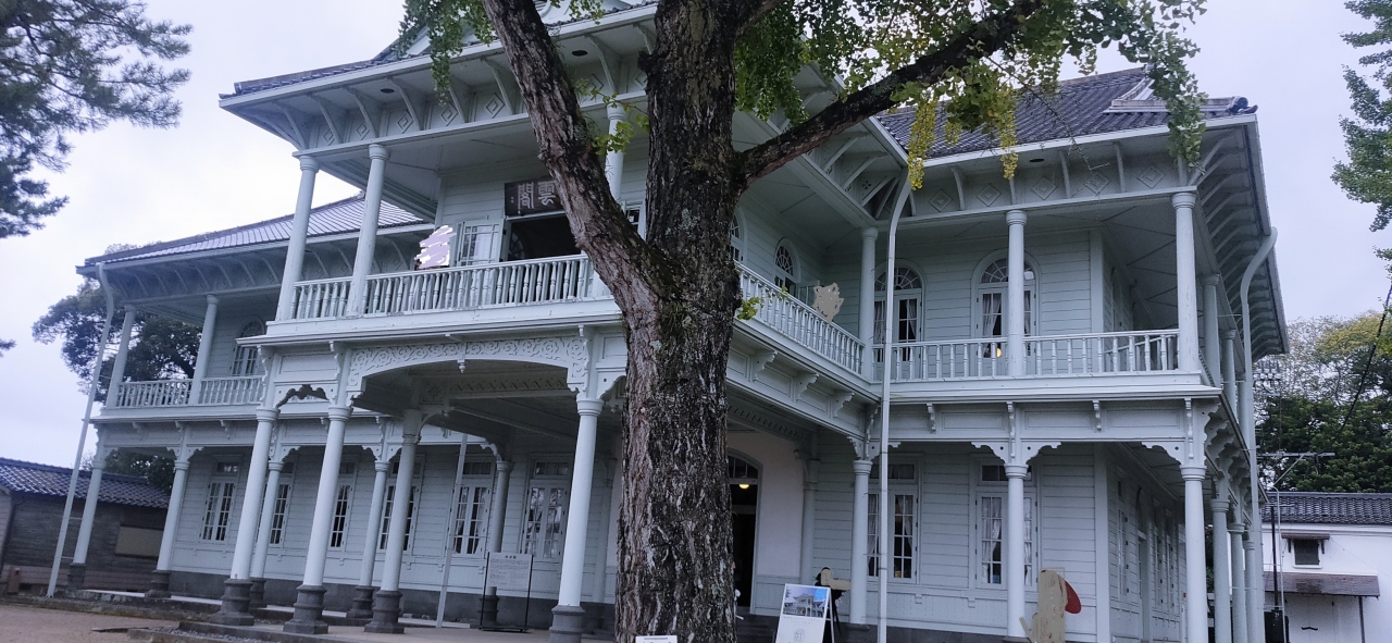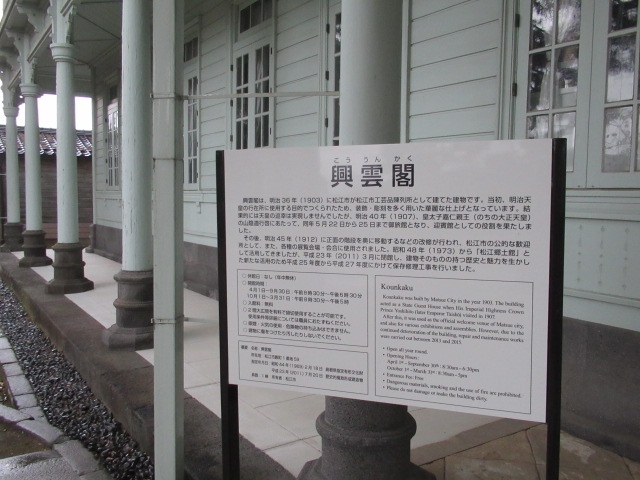 松江城二ノ丸に建つ明治建築の洋館。 明治36(1903)年に完成した県内に残る数少ない明治建築で、明治40(1907)年、皇太子嘉仁親王(のちの大正天皇)のご宿泊所としても使用された。 正面には車寄せがあり、周囲を豊かな装飾で飾る柱を配した優美な造り。戦後は各種展示会場、市教育委員会庁舎などに転用された後、『松江郷土館』として郷土の歴史・民俗資料などが展示された。 平成23(2011)年3月に閉館し、階段室を移設して現在の形態となった明治45年当時に復元するとともに、建物そのものの持つ歴史と魅力を生かした新たな活用のため、平成25年度から平成27年度にかけて保存修理工事を行った。