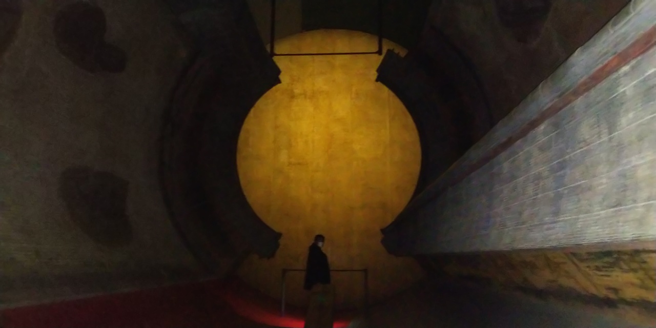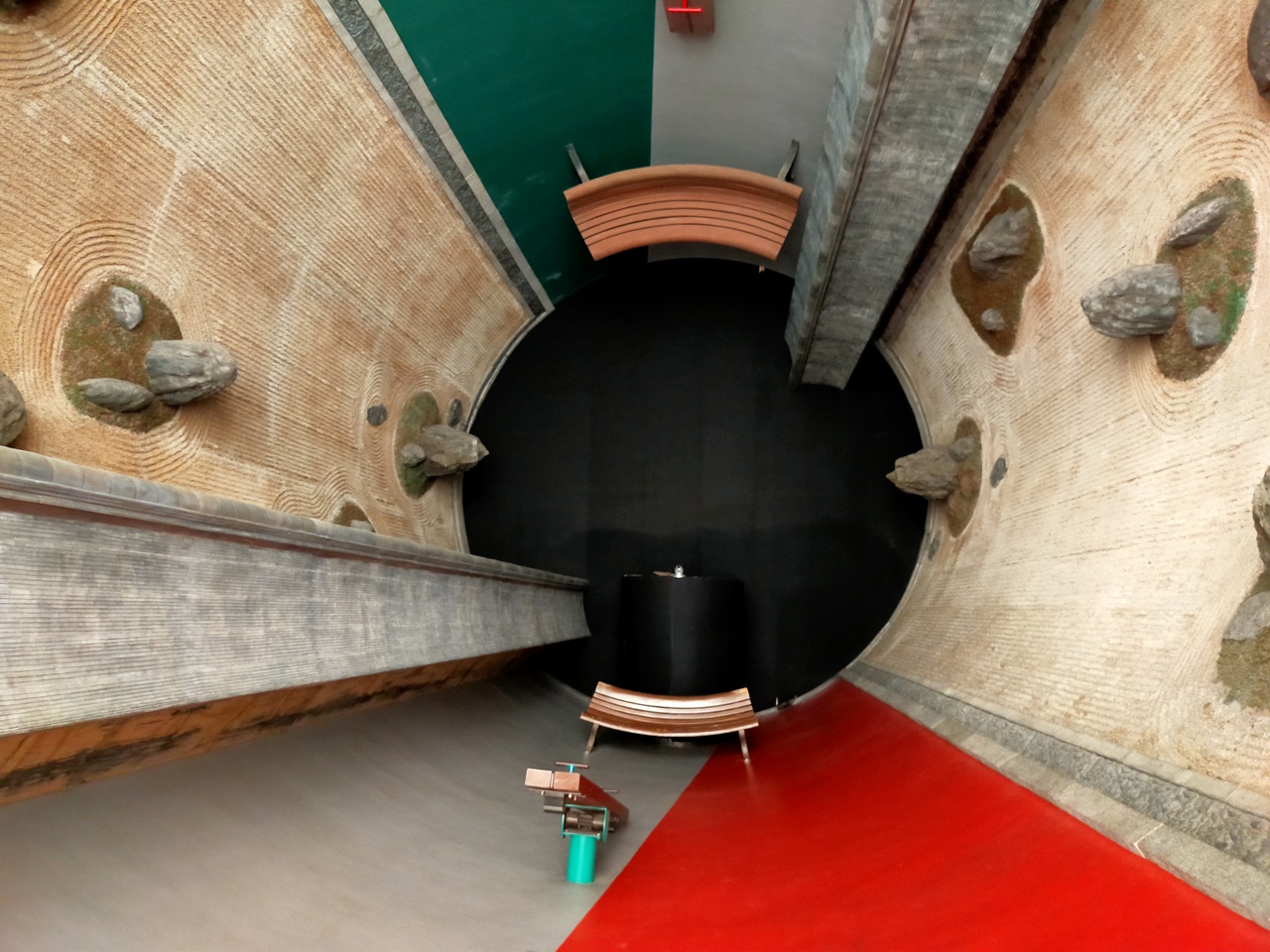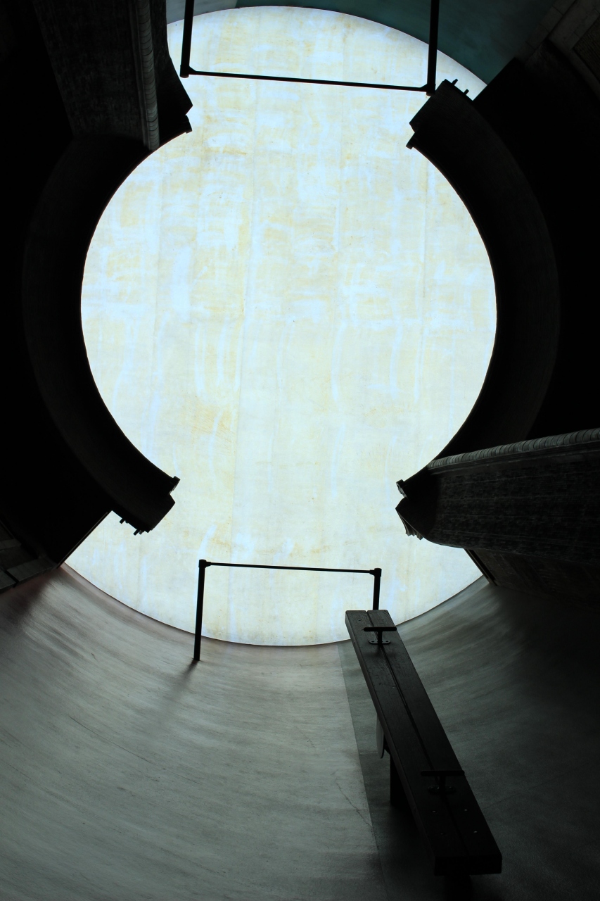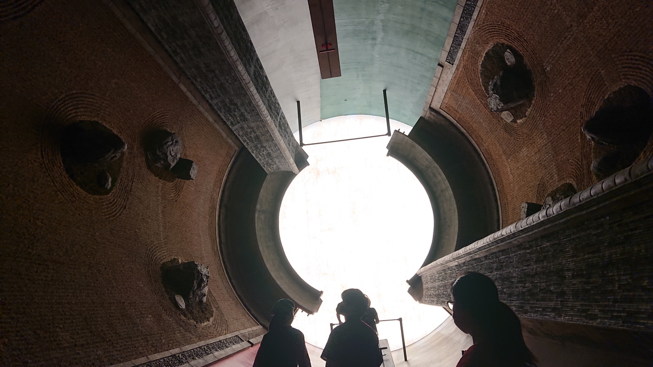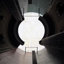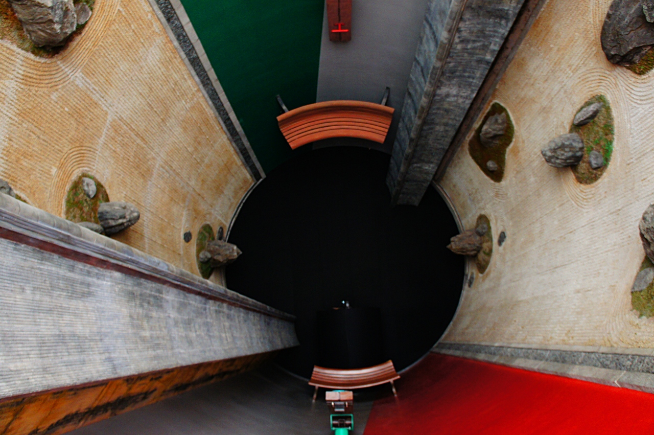 【展示室:太陽】「遍在の場・奈義の龍安寺・建築する身体」(荒川修作+マドリン・ギンズ):狭い螺旋階段をのぼってゆくと,巨大な円筒の空間が広がります。そこには,龍安寺の石庭が2つ,円筒壁面に互いが照応しています。見慣れた石庭が非日常の存在感を示している異次元空間をまさに「体感」します。