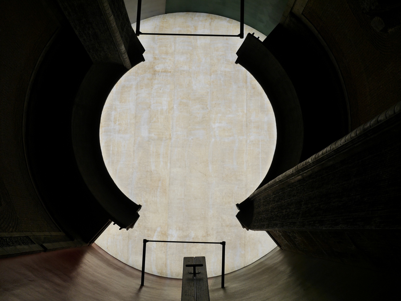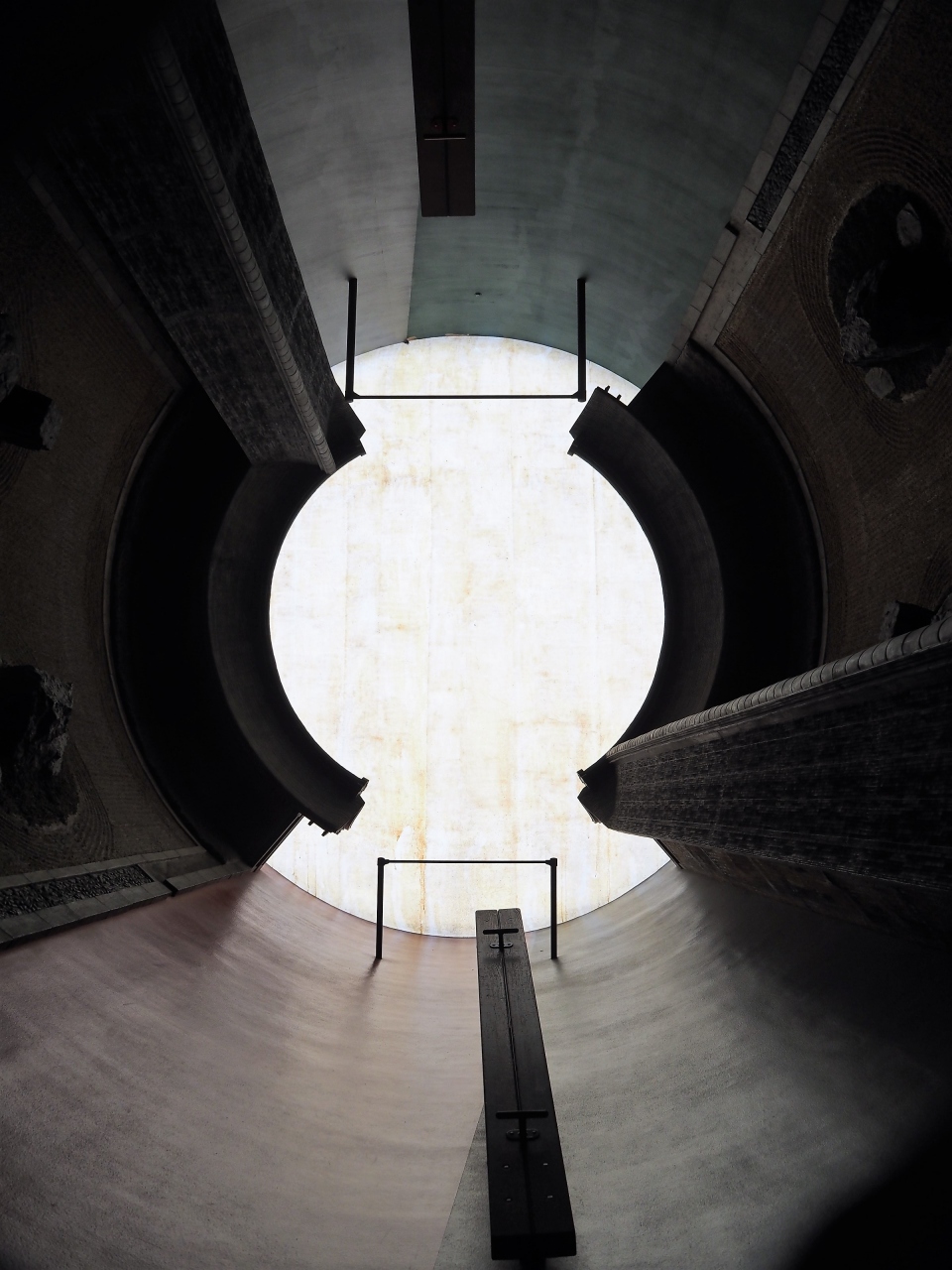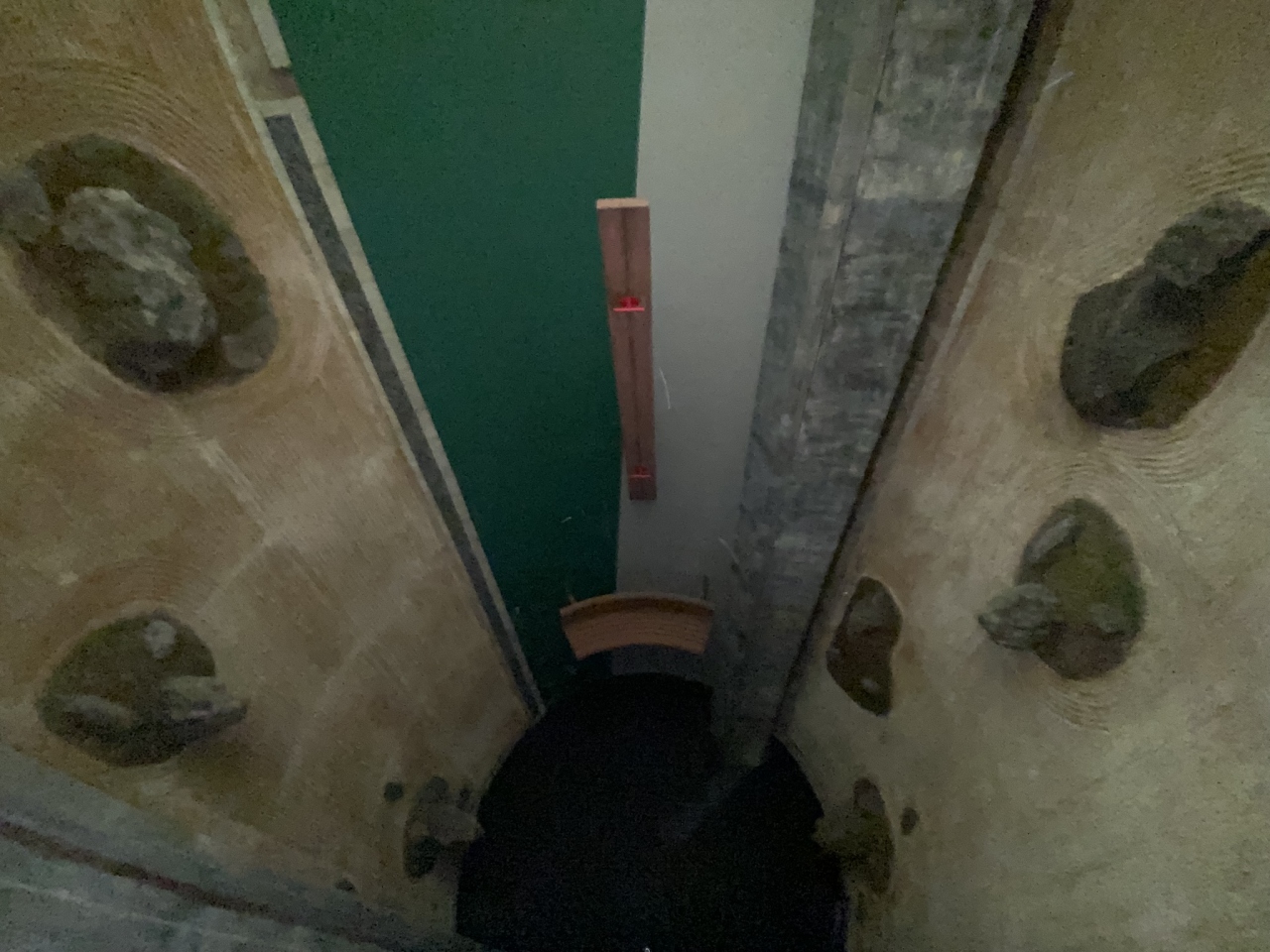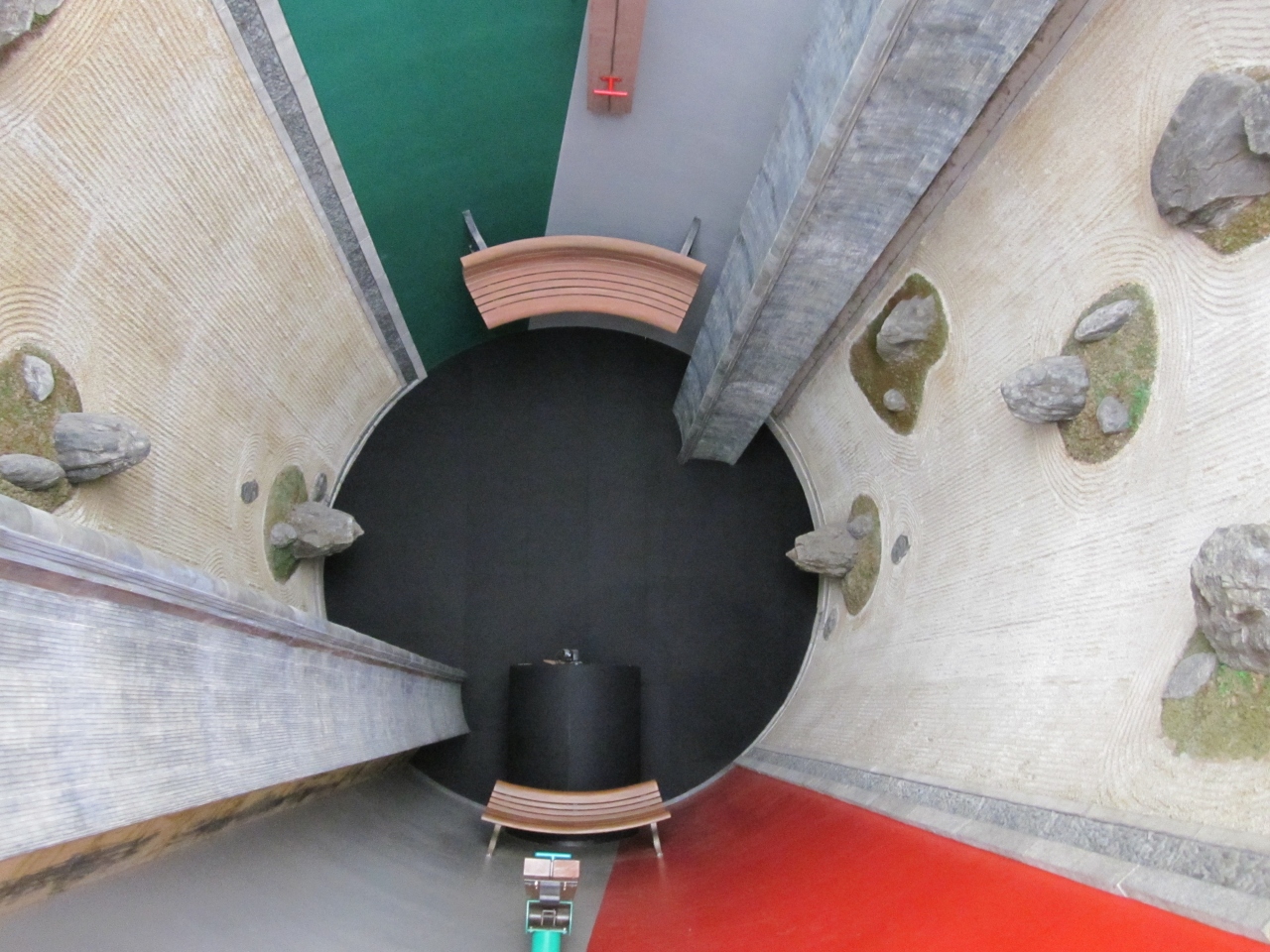 【展示室:太陽】「遍在の場・奈義の龍安寺・建築する身体」(荒川修作+マドリン・ギンズ):狭い螺旋階段をのぼってゆくと,巨大な円筒の空間が広がります。そこには,龍安寺の石庭が2つ,円筒壁面に互いが照応しています。見慣れた石庭が非日常の存在感を示している異次元空間をまさに「体感」します。
