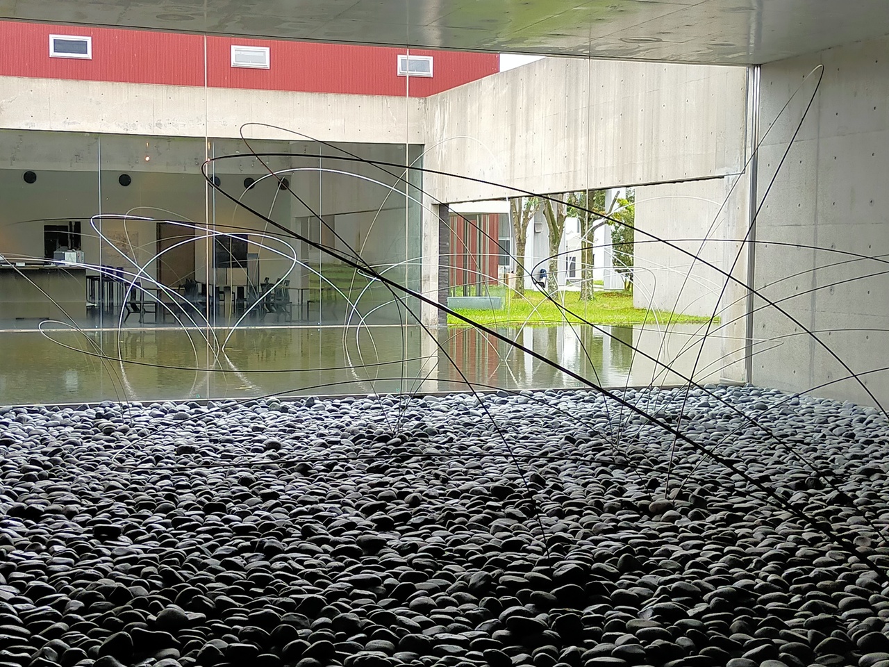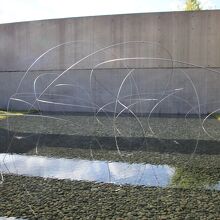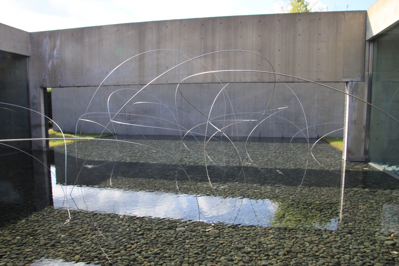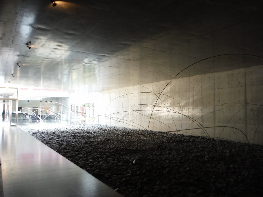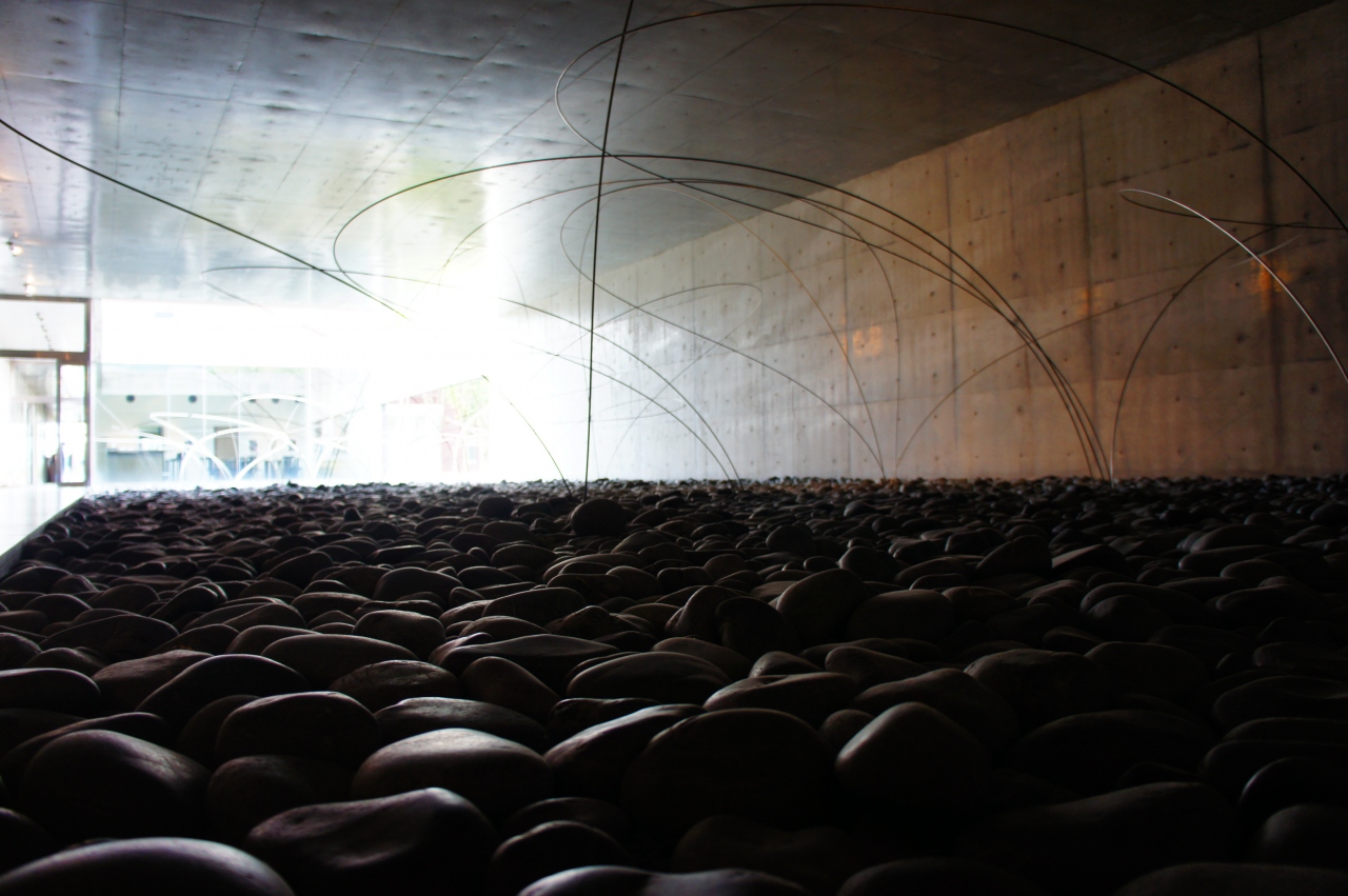【展示室:大地】「うつろひ」(宮脇愛子):外に広がる池と丸石を敷き詰めた空間にエレガントなワイヤーが風に揺れ,心地よくうつろふ「気」を感じさせてくれます。