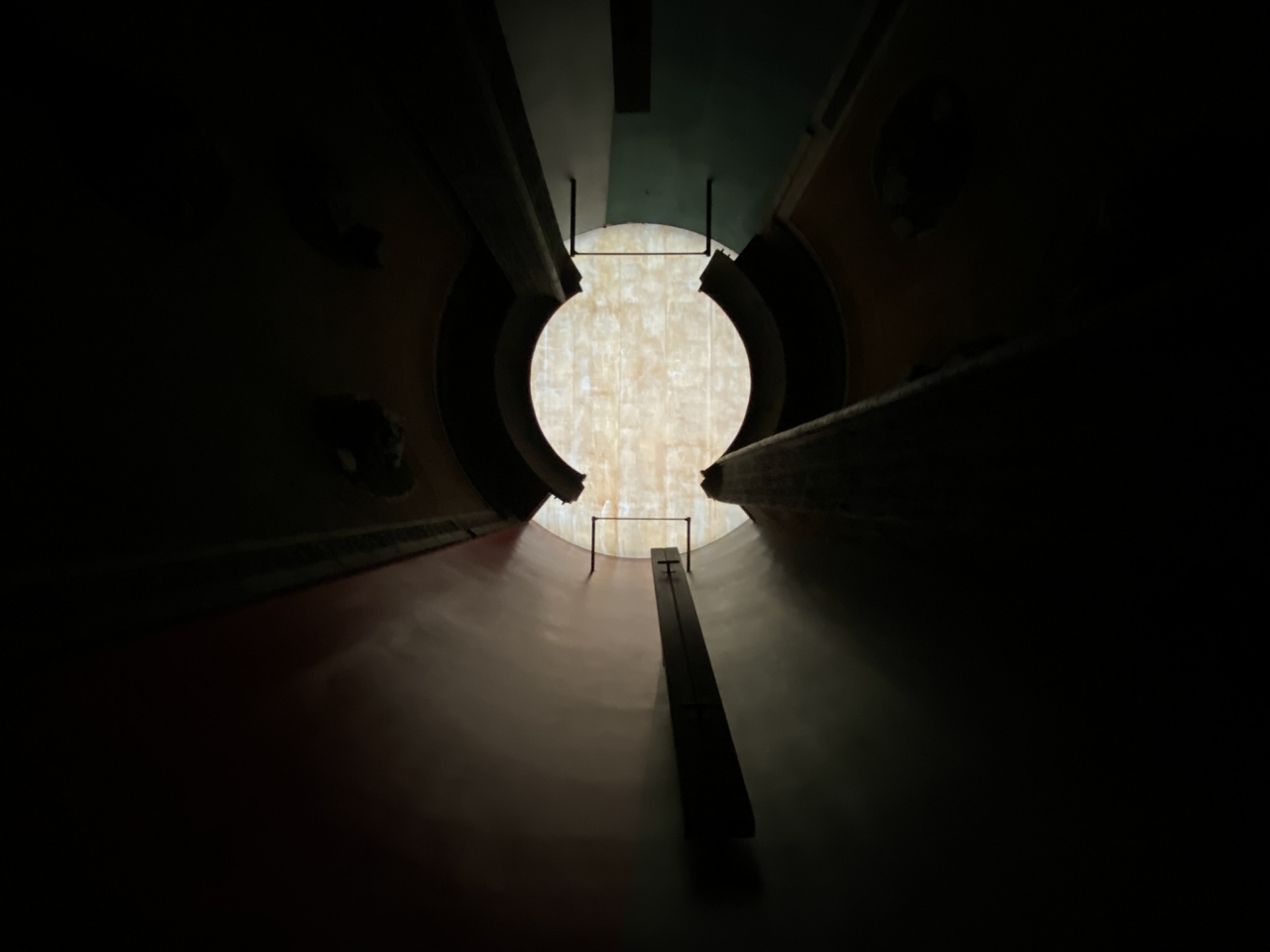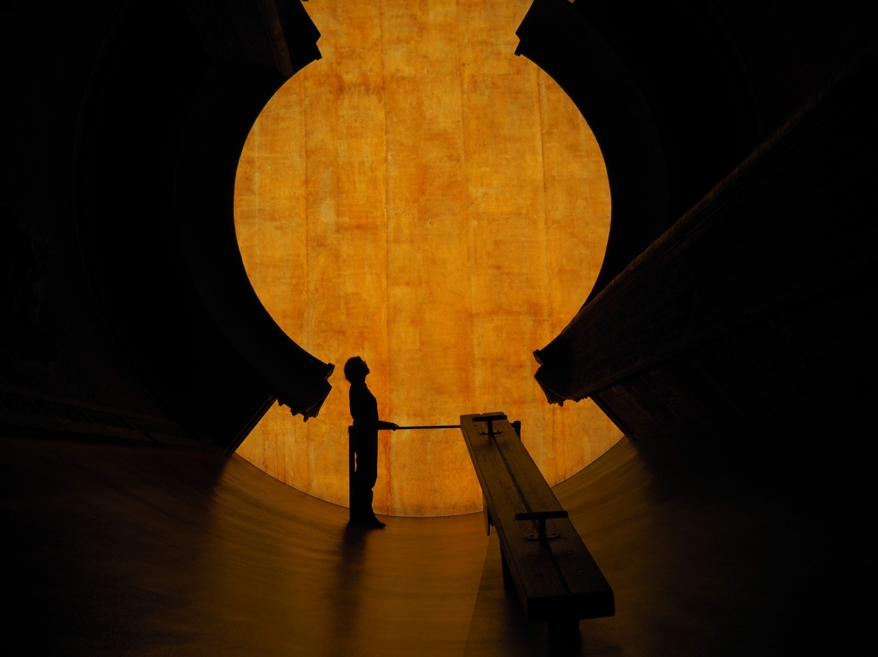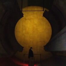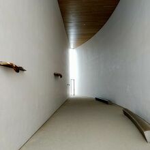 【展示室:月】「HISASHI―補遺するもの」(岡崎和郎):高い天井の三日月形の細長い空間には,時が止まったかのような黄金のオブジェが取り付けられており,歩くと大きな足音が反響し,視覚と聴覚の不思議な感覚を味わうことができます。