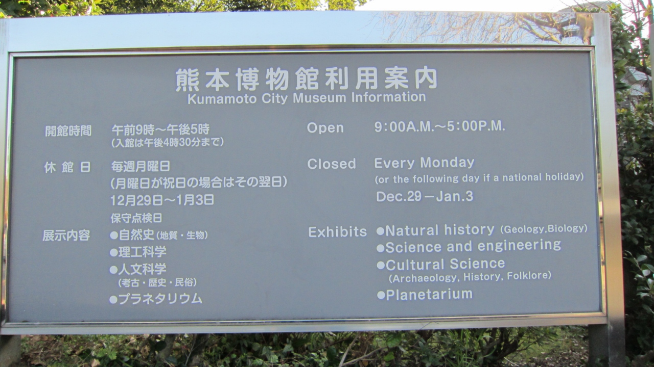 ウェブサイトはわかりにくいが、どうも熊本市立らしい。バスで行ける。 (2025/3/4) 熊本城・わくわく座・熊本... 続きを読む博物館の共通券(1,100円)を購入した。小雨の平日に行った。熊本城からは、徒歩で15分ほどで行ける。途中で野鳥園を経由した。 他には、20代であろう若い男性1人、高校生かと思われる女性2人組、高齢者の夫婦など。空いている。 プロネタリウムがあるのだが、何らかの事情で休みだった。 熊本の動物の剥製や、昆虫の標本が展示されている。屋外に蒸気機関車が展示してあり、迫力がある。また、小泉八雲が熊本の子供にもらったとんぼの模型の再現したものが展示してある。これが一番気に入った。 プロネタリウムが見られなかったのは残念だが、全体的に満足である。 閉じる