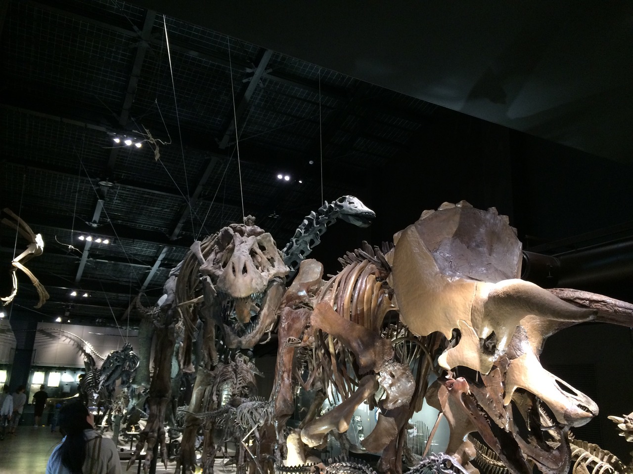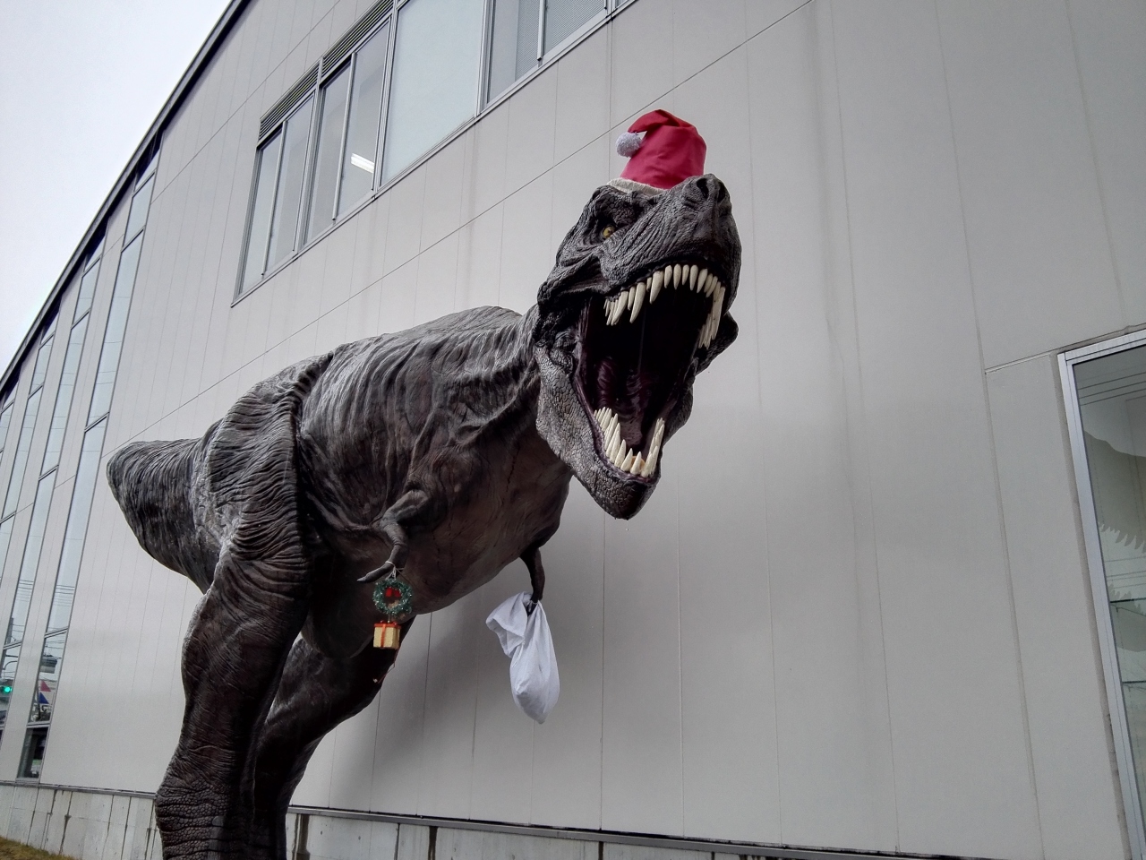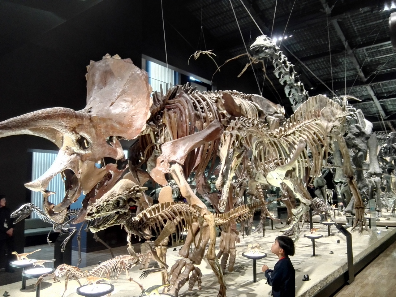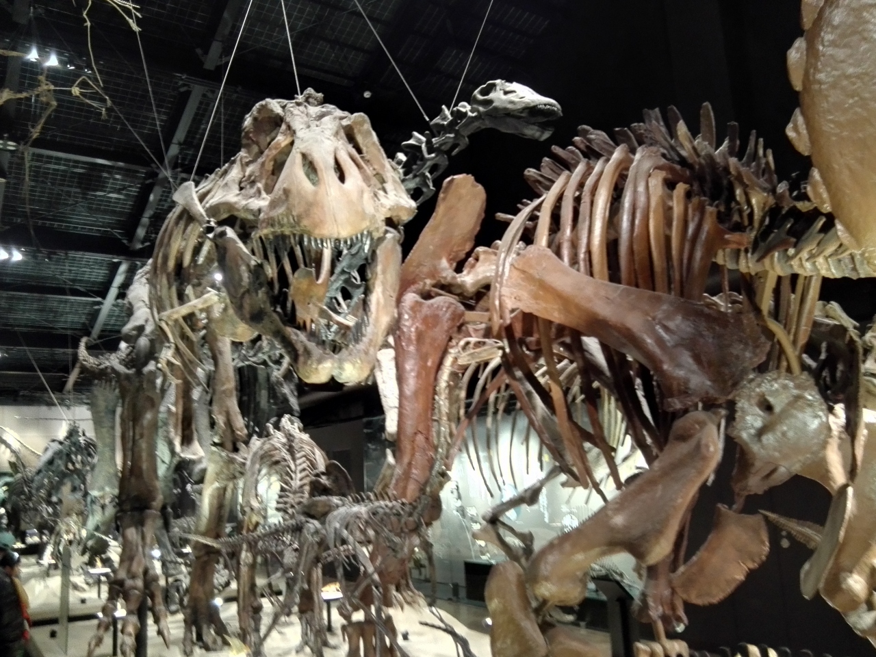 入口の実物大ティラノザウルスが目印。クリスマス前で赤いキャップにプレゼント持参なのは御愛嬌。中に入ると家族釣れで大入り。入場料500円で展示室に入れば目の前にド~ンと恐竜の化石が大行進。これがいい。展示面積570平米と決して大きな博物館ではないが、狭いスペースにこれでもかと恐竜の化石を並べたのが、逆に迫力を生む。