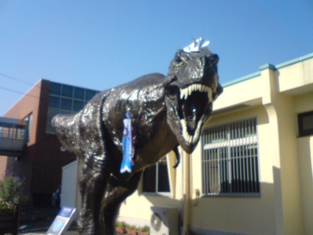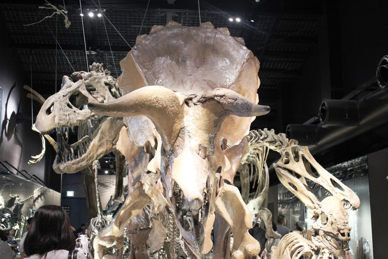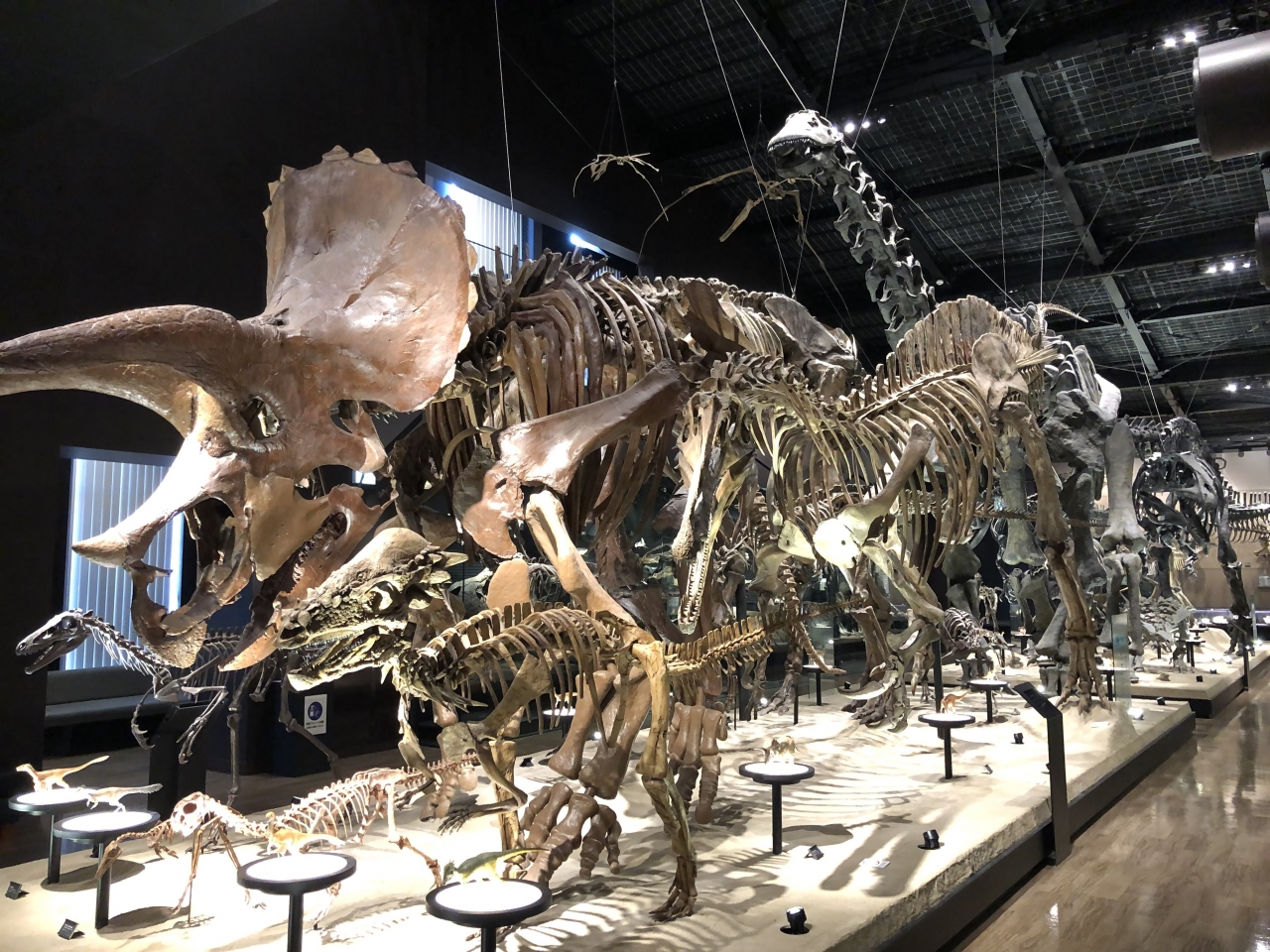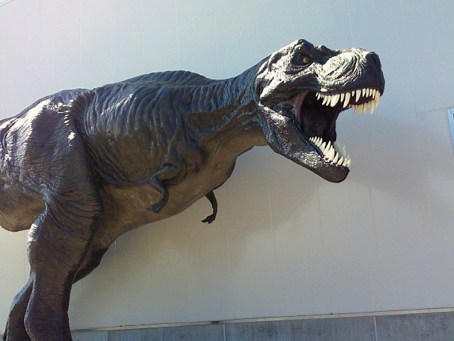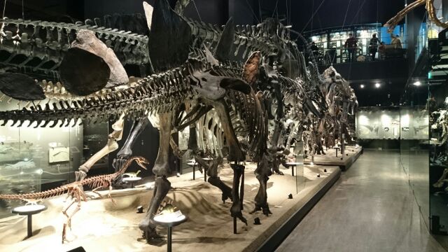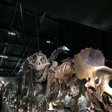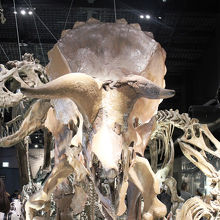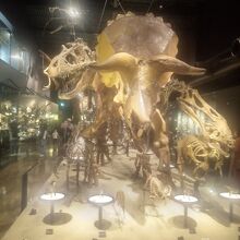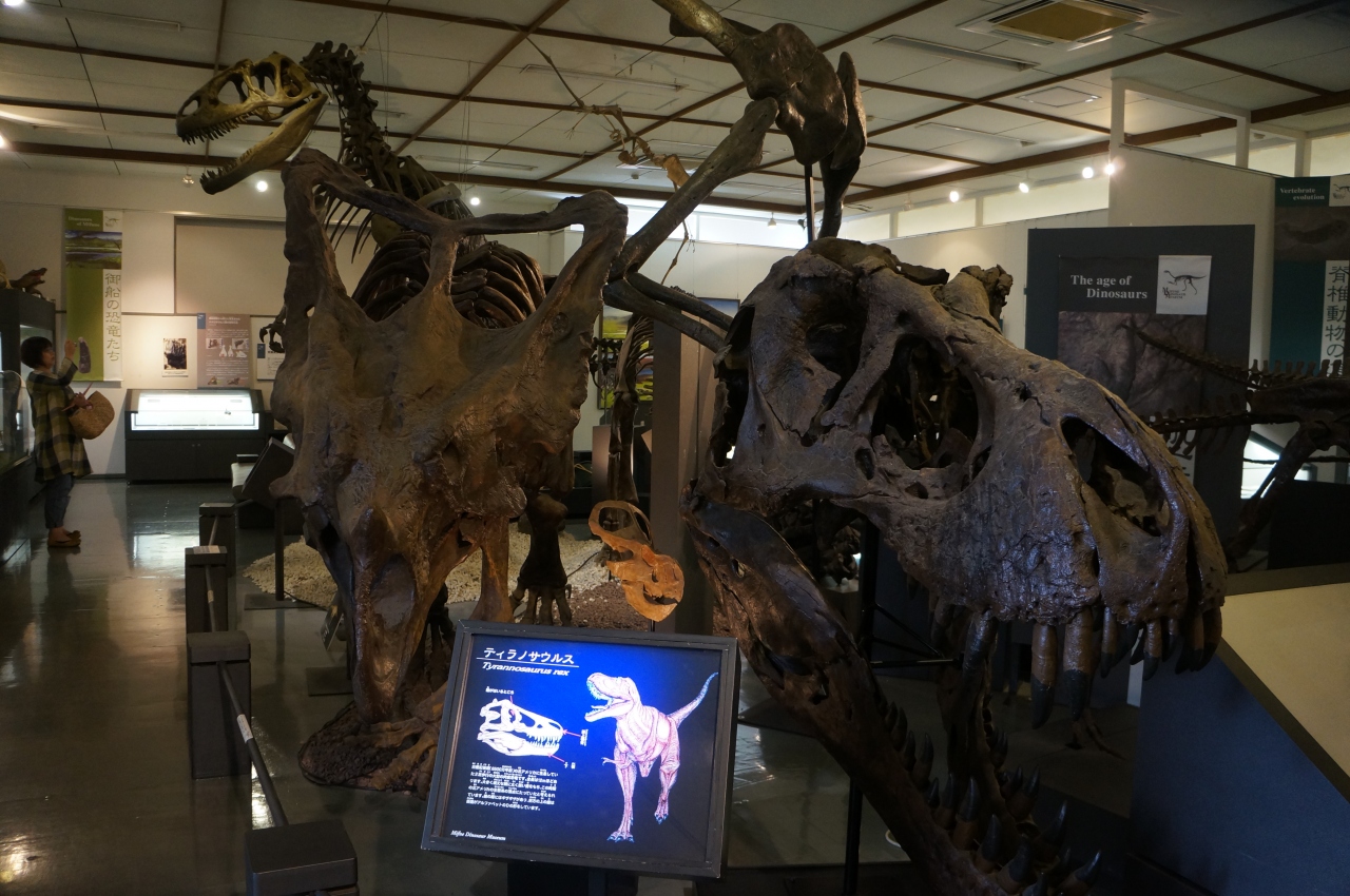 入口の実物大ティラノザウルスが目印。クリスマス前で赤いキャップにプレゼント持参なのは御愛嬌。中に入ると家族釣れで大入り。入場料500円で展示室に入れば目の前にド~ンと恐竜の化石が大行進。これがいい。展示面積570平米と決して大きな博物館ではないが、狭いスペースにこれでもかと恐竜の化石を並べたのが、逆に迫力を生む。