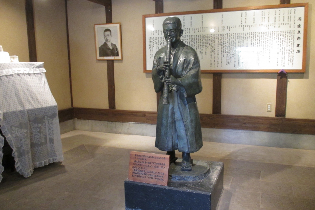 尺八を吹く廉太郎少年像がありました。