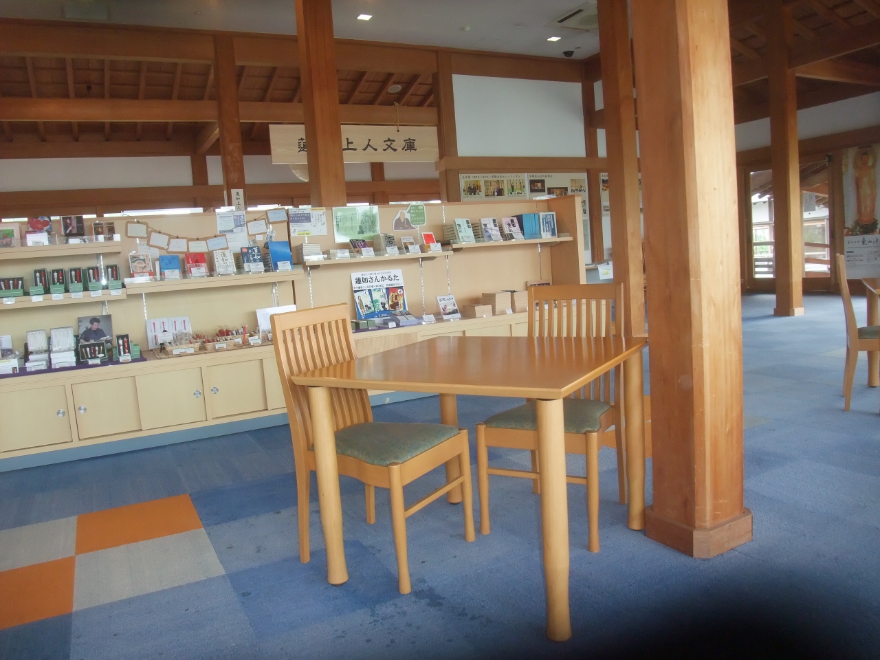 ここには蓮如上人記念館や吉崎寺本願寺、吉崎御坊、鳳凰閣などがあります。鳳凰閣は入館無料で中には簡単な食事のできる喫茶コーナーもあり、お土産も売られています。写経や数珠造りの体験などもできるコーナーもあります。鳳凰閣には蓮如上人に関する多くの書籍も並んでいます。私たちは喫茶コーナーで柚子サイダーを飲みました。値段は¥400でした。