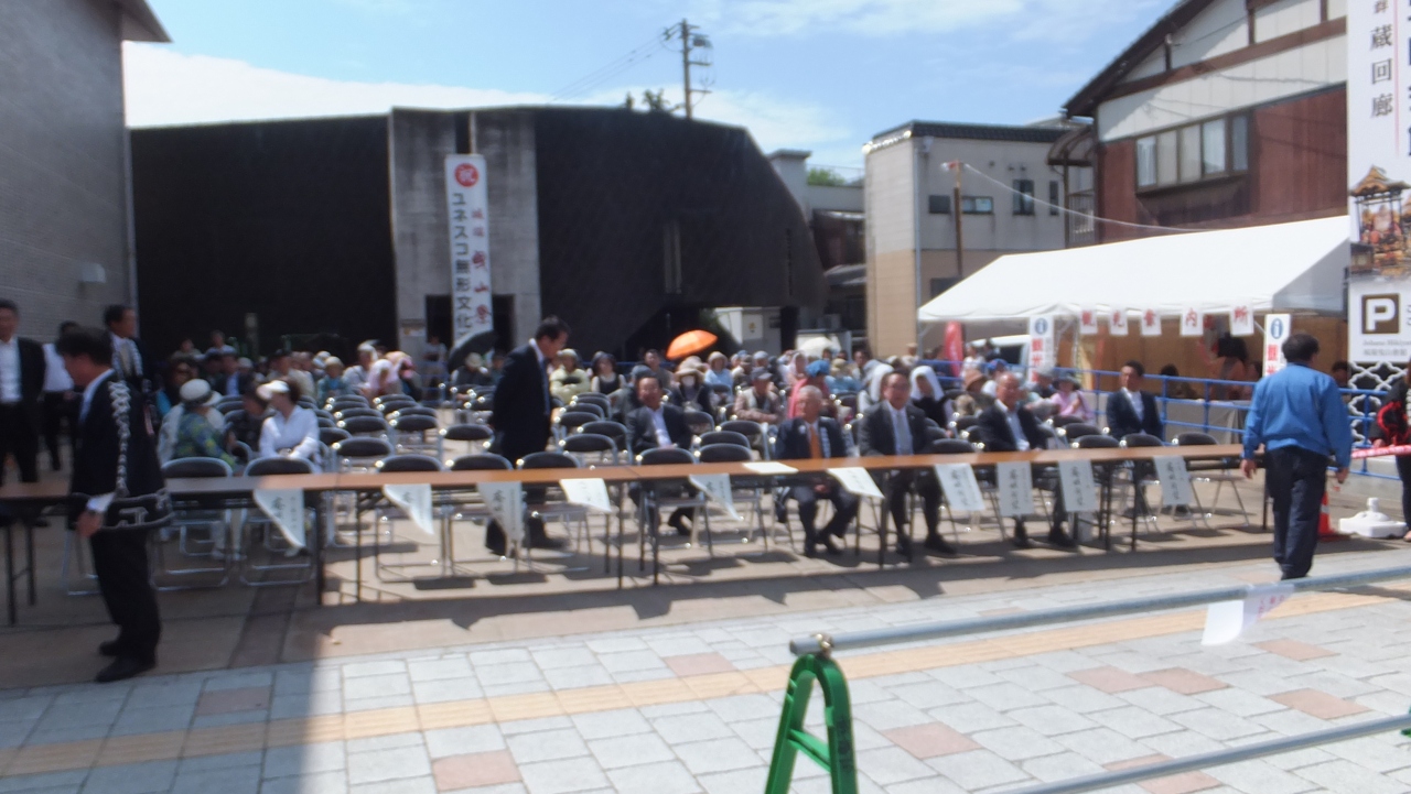 隣のスペース(普段は駐車場でした)では、「曳山会館会場特別観覧席」となり、曳山と庵屋台の解説、六ケ町の庵唄披露がありました。 閉じる投稿日:2015/05/20