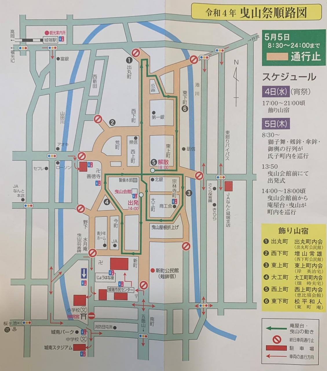 5月5日はそのまま曳山巡行が行なわれ、祭りが終わる22時過ぎに、去年展示されていなかった三ケ町分の曳山・庵屋台・傘鉾が交替で展示されるという仕組みになっています。