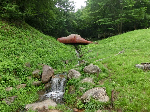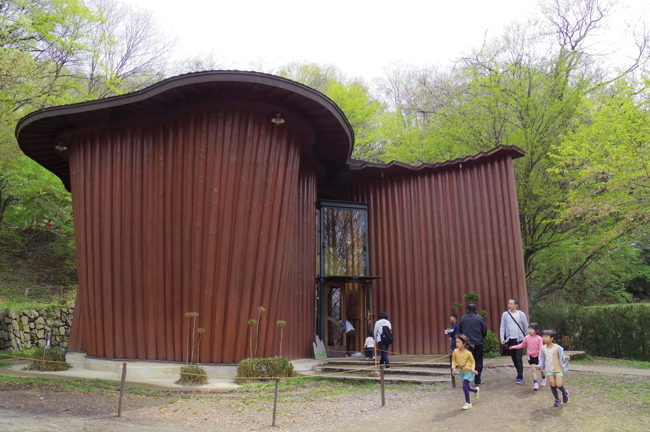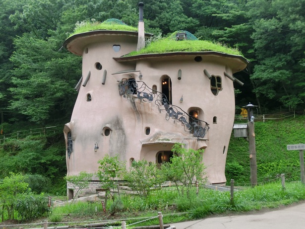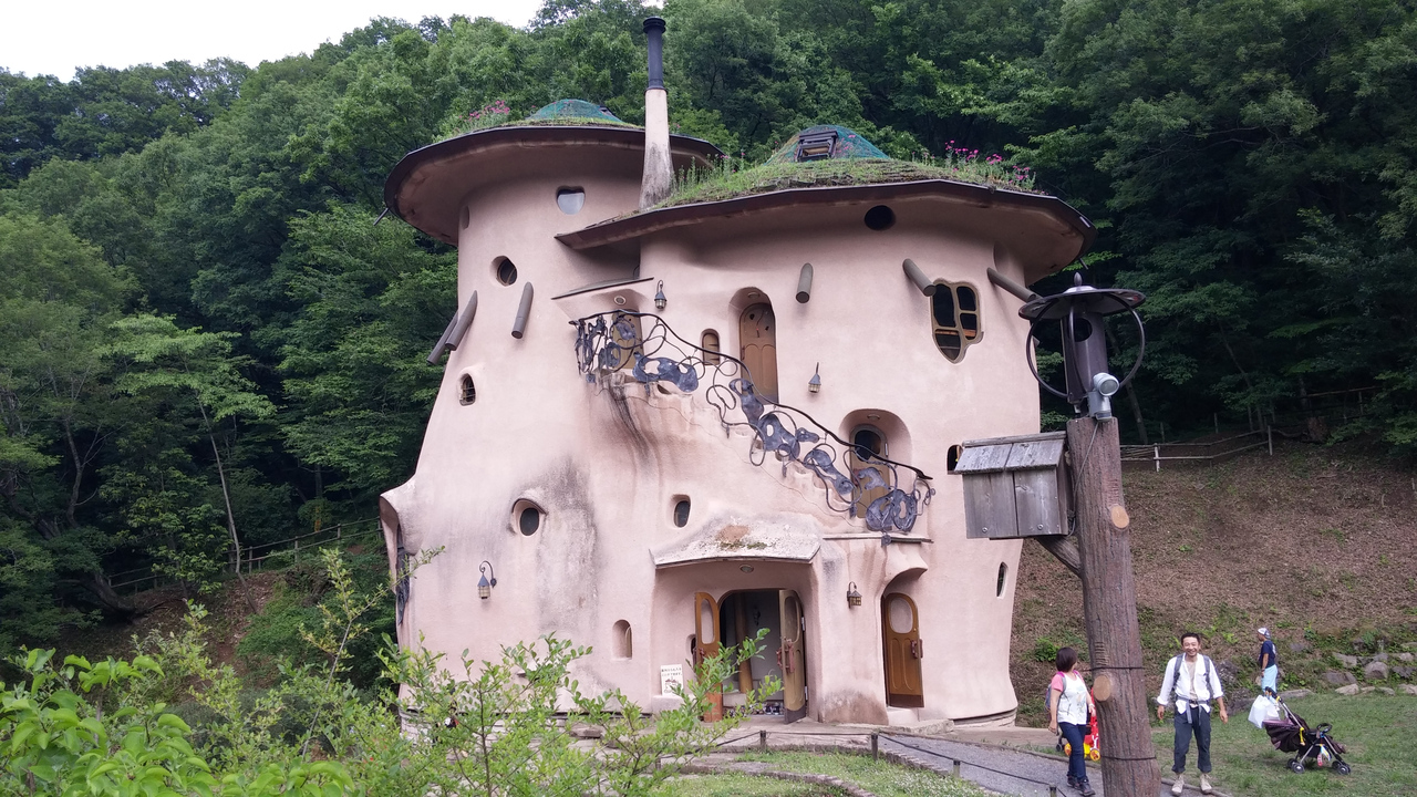 テーマパークのようになっており、ユニークな形の建物がいろいろと建っています。管理事務所と子ども劇場の棟、きのこの家、わんぱく池、水浴び小屋、樹上の家、見晴らし橋、滝へのデッキウォーク、森の家等が有ります。