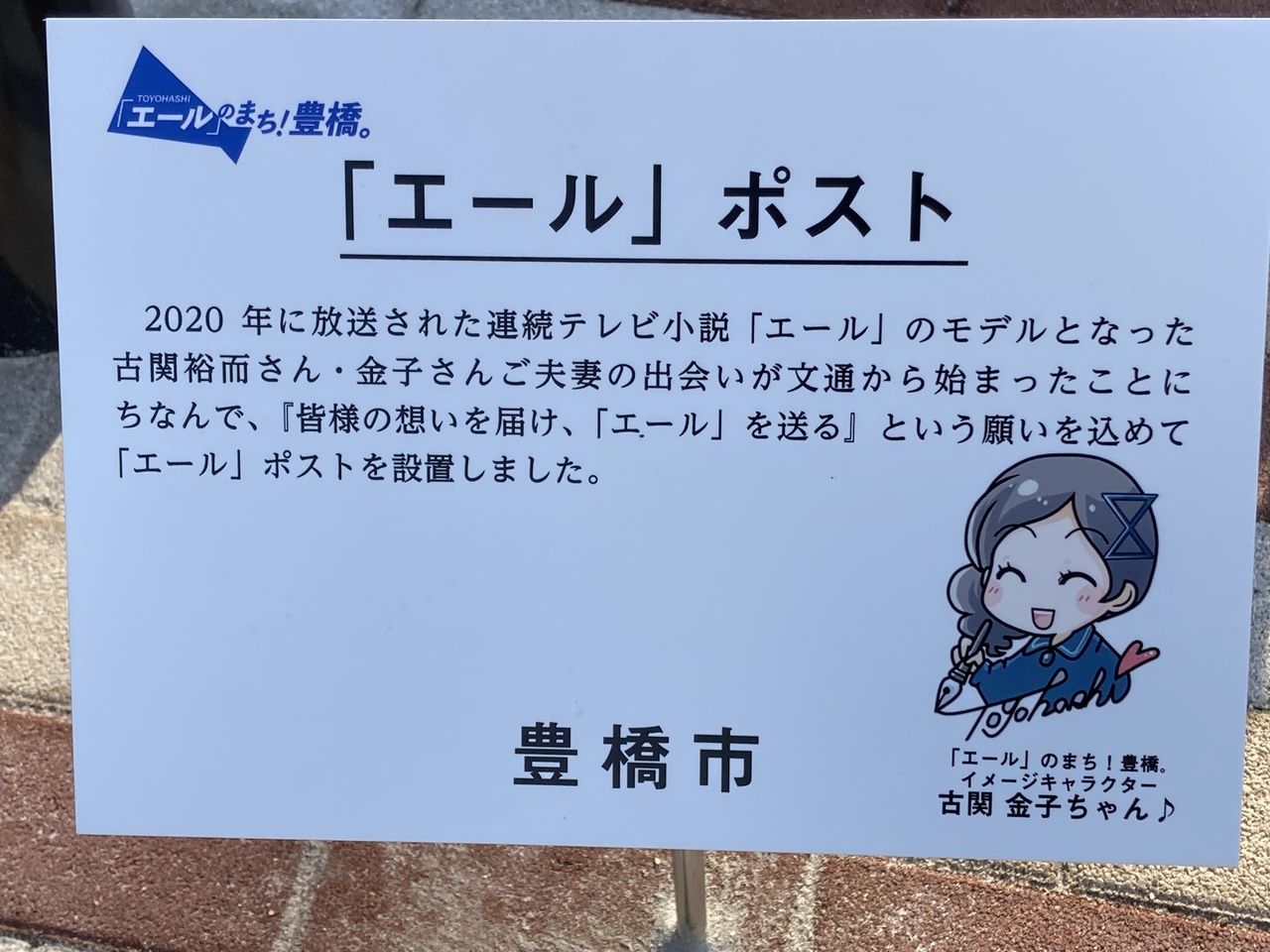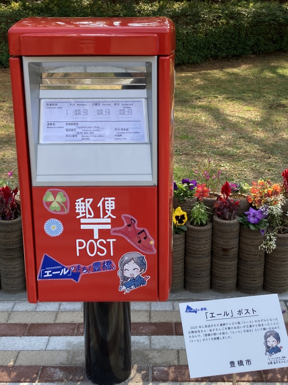 豊橋駅から歩いて10分程、路面電車でも行けます。豊橋公園内に2020年NHK連続テレビ小説「エール」のロケ地となったのを記... 続きを読む念してエールポストが設置されました。このエールポスト、2022年10月までこのポストにハガキなどの郵便物を投函するとエールの小型印が押印されます。豊橋市を訪れた時には是非豊橋公園に寄ってみて下さい。また、新幹線の豊橋駅は非常に珍しく、地面の上に駅があります。昭和39年の東海道新幹線開業から地面の上に新幹線駅があるのは豊橋駅と米原駅だけです。今は品川駅も加わったようですが、あとの殆どの新幹線駅は高架駅です。山陽新幹線の駅を含めても数駅しかない地面の上に駅がある新幹線駅の豊橋駅、是非観光してみて下さい。 閉じる