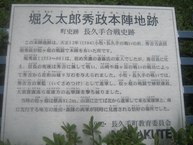 ここは歴史的には、小牧・長久手の戦いの一つに含まれる”桧ヶ根の戦い”の舞台となった所で、秀吉軍側の武将・堀秀政が本陣を布いた場所として、石碑も建てられていますので、まずはここを見物されると良いです。