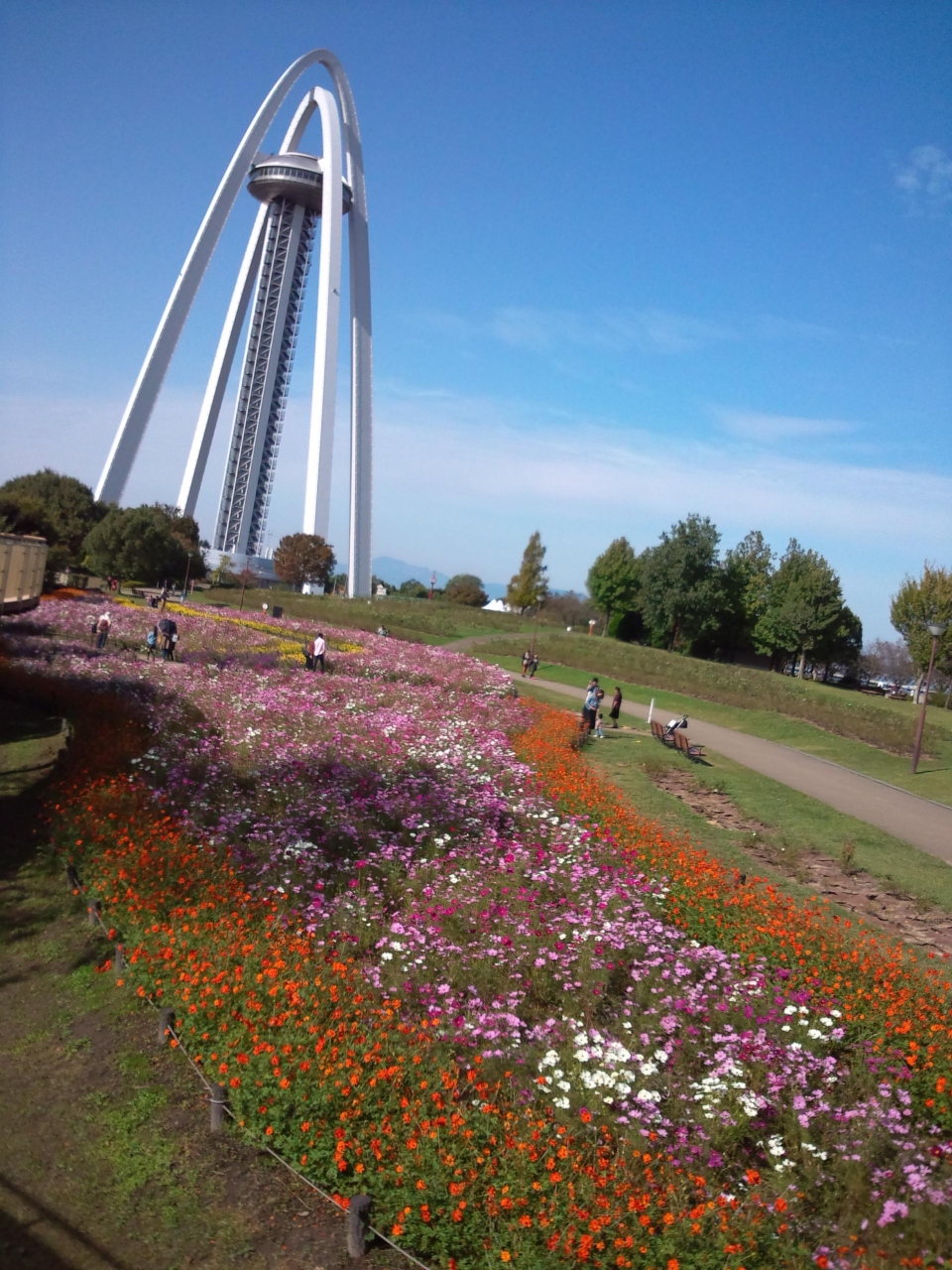 高さ138mの展望タワー「ツインアーチ138」をはじめバラ園・コスモス畑・など楽しい施設がいっぱい。