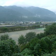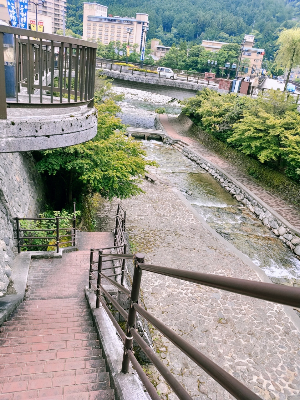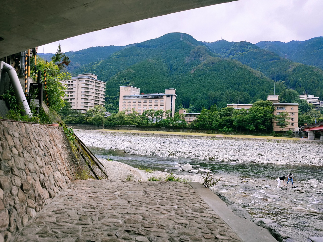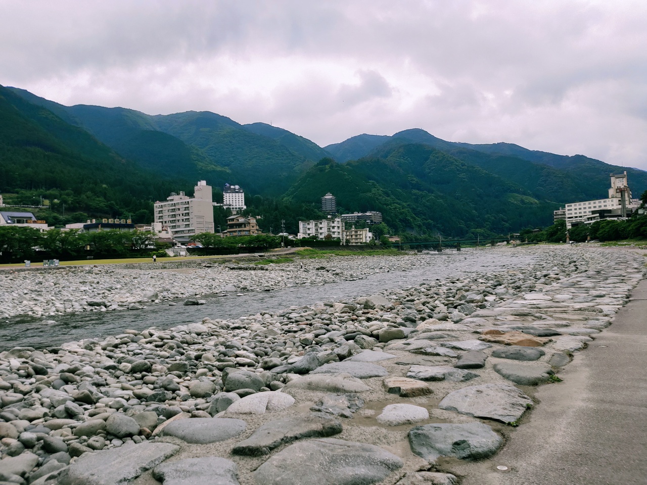 川の両岸は温泉旅館が立ち並んでいますが、その向こうには新緑の山々がそびえています。