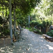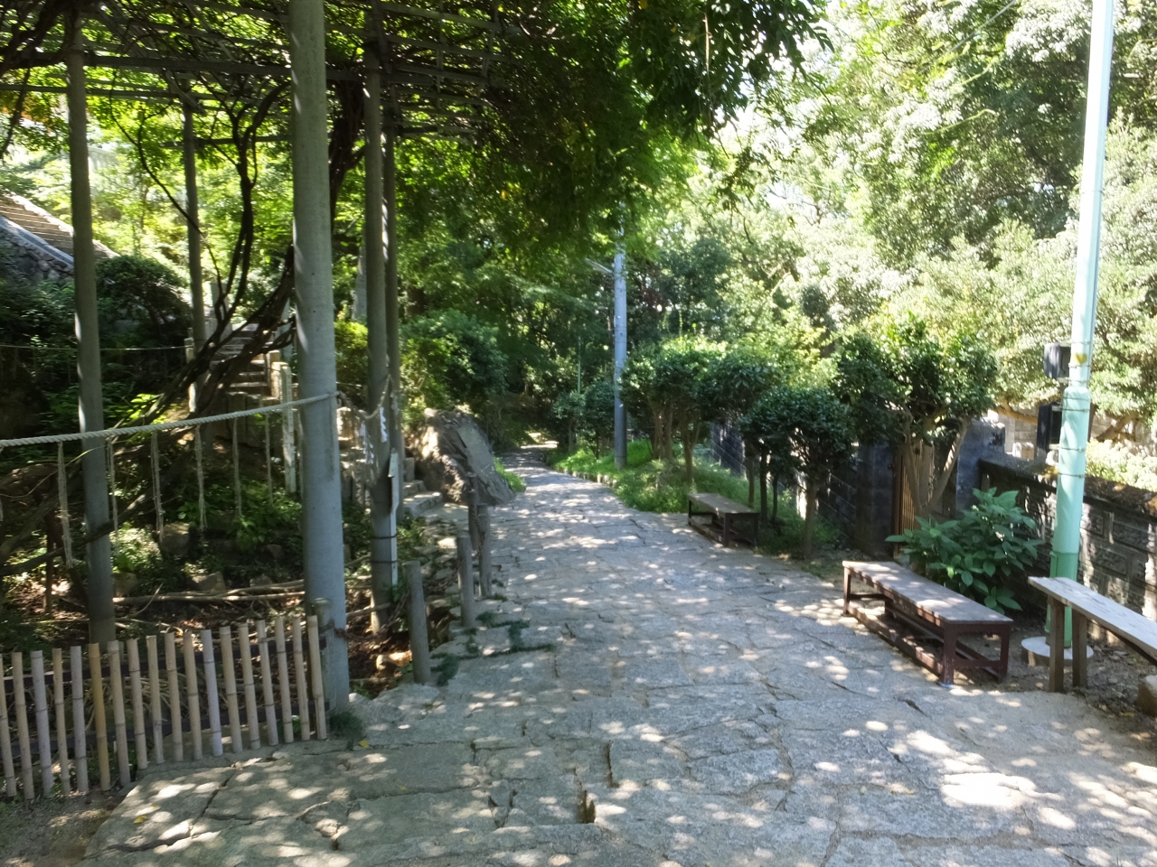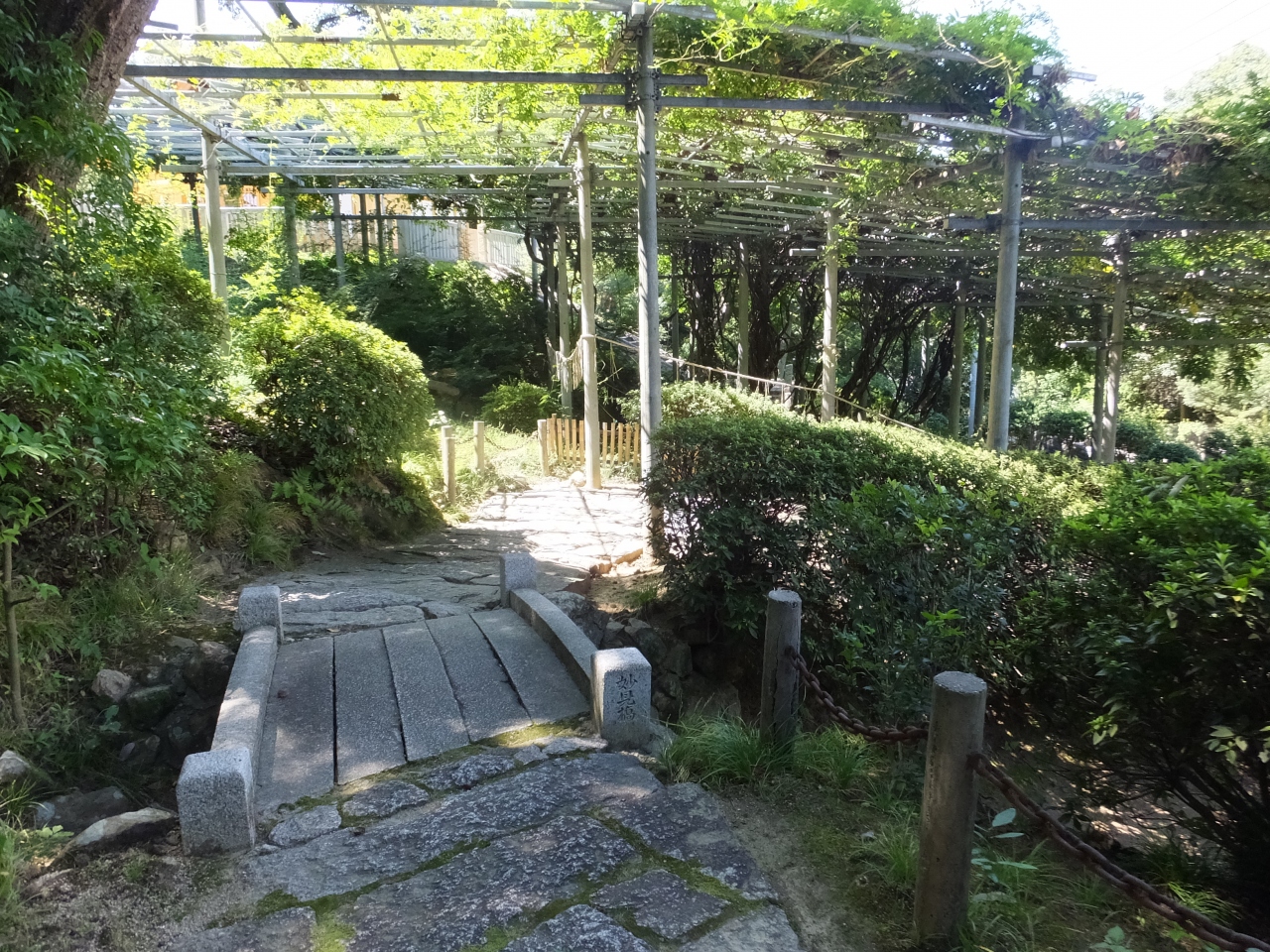 美観地区の北、倉敷の総鎮守である阿智神社の境内周辺に整備された公園。春には約120本もの桜が園内をピンクに染めます。また園内には藤の大棚があり「阿智の藤」と呼ばれています。樹齢は300~500年とも言われており、幹周りは1.5m。同種の藤では最も古く大きいもので、岡山県天然記念物となっています。一時は枯れかけたこともありましたが、地元住民らが保護活動を始め、樹木医の診察を受け治療を行った結果、樹木が回復し、毎年5月上旬には見事な花を咲かせています。 園内をピンクに染める桜と、樹齢は300~500年藤の大樹