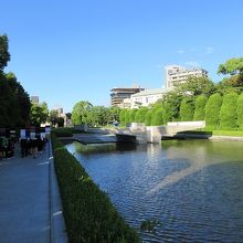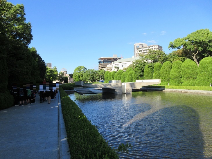 原爆死没者慰霊碑から伸びる長方形の池。