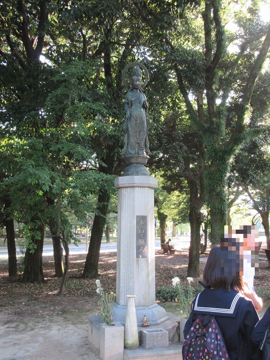 原爆死没者慰霊碑からは少しはなれな木々の覆われた場所に立つ観音像。