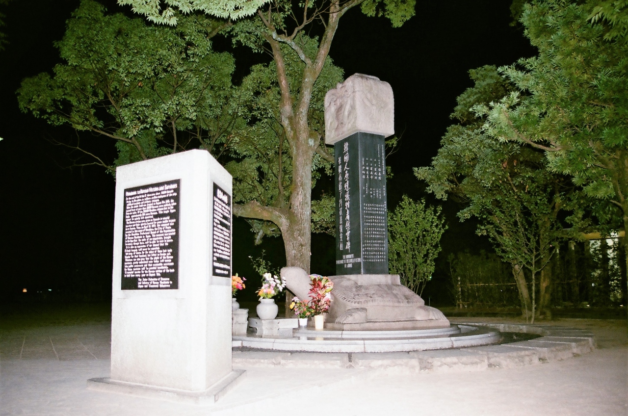 元々は本川橋西詰に建立されました。それを『平和記念公園内』にという運動の結果で移設となっています。日本語・英語・韓国語で刻まれた碑文には、強制連行され日本に連れて来られた末に被爆死した同胞を慰霊する意味の文面が書かれています。確かに日韓併合後多くの韓国人が日本に『来た』ことは事実であれど、すべてが『強制連行された』というと辻褄の合わないことがでてきます。