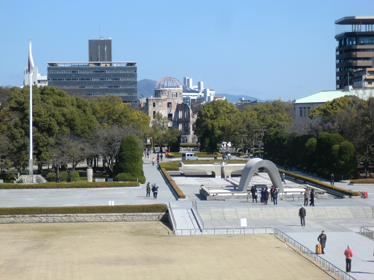 2) 広島駅からバスで15分「平和記念公園」バス停下車、すぐ