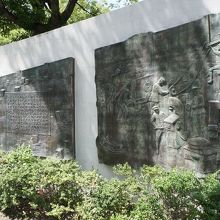 最初はノグチ・イサム氏のデザイン案だったが、彼の出自(日系アメリカ人)により却下され、代わりに丹下健三氏がその案を引き継ぐ形で設計した。